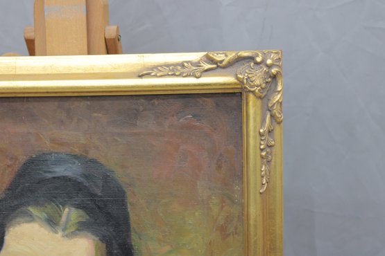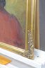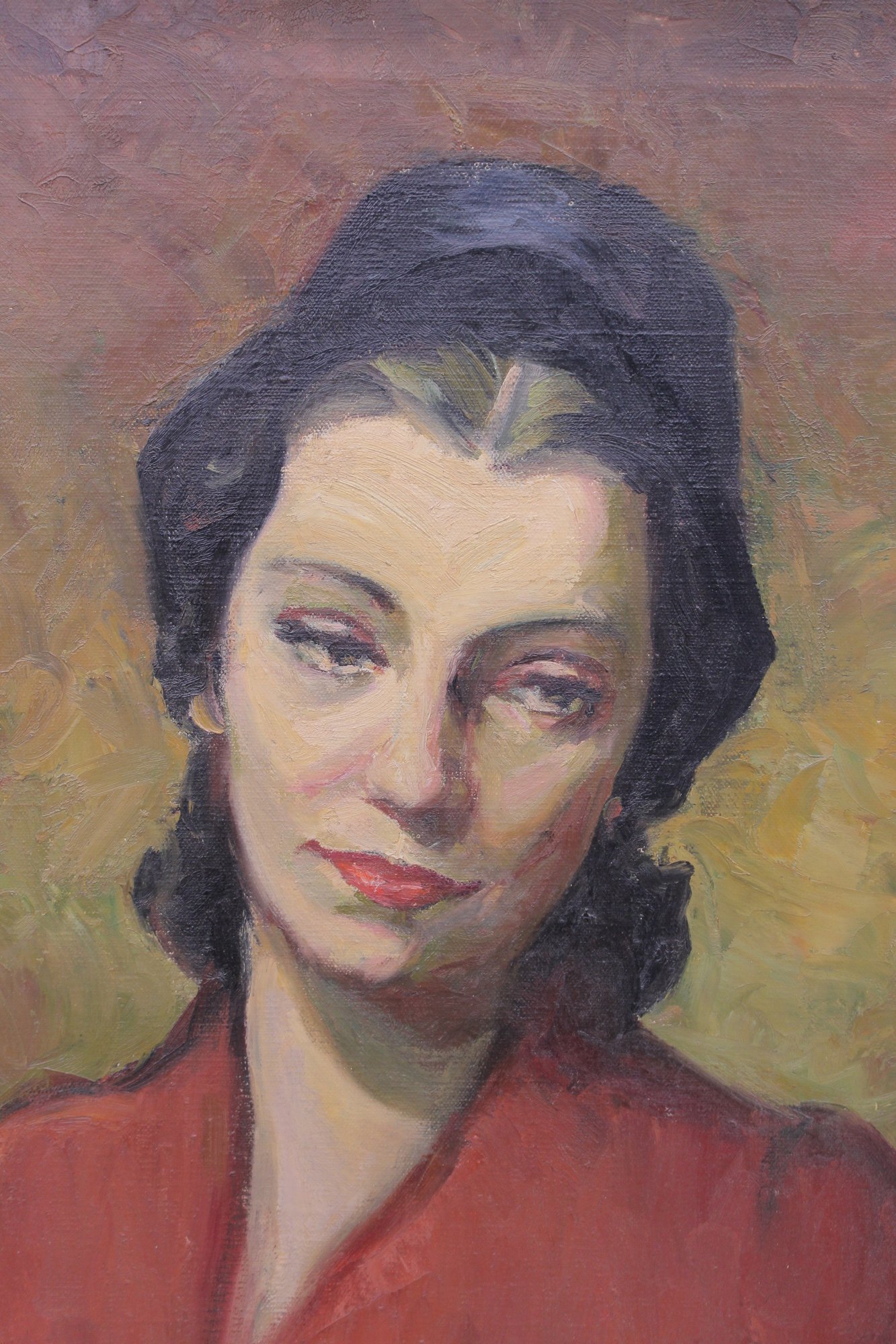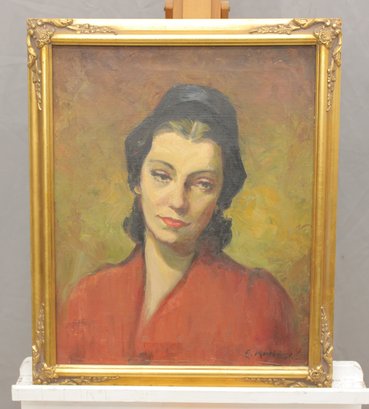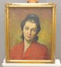 an original signed oil on canvas portrait, depicting a woman shown in a three-quarter pose against a warm, textured background. The subject is rendered with expressive brushwork and subtle modeling, highlighting facial features and mood, with the red garment providing strong visual contrast and depth.