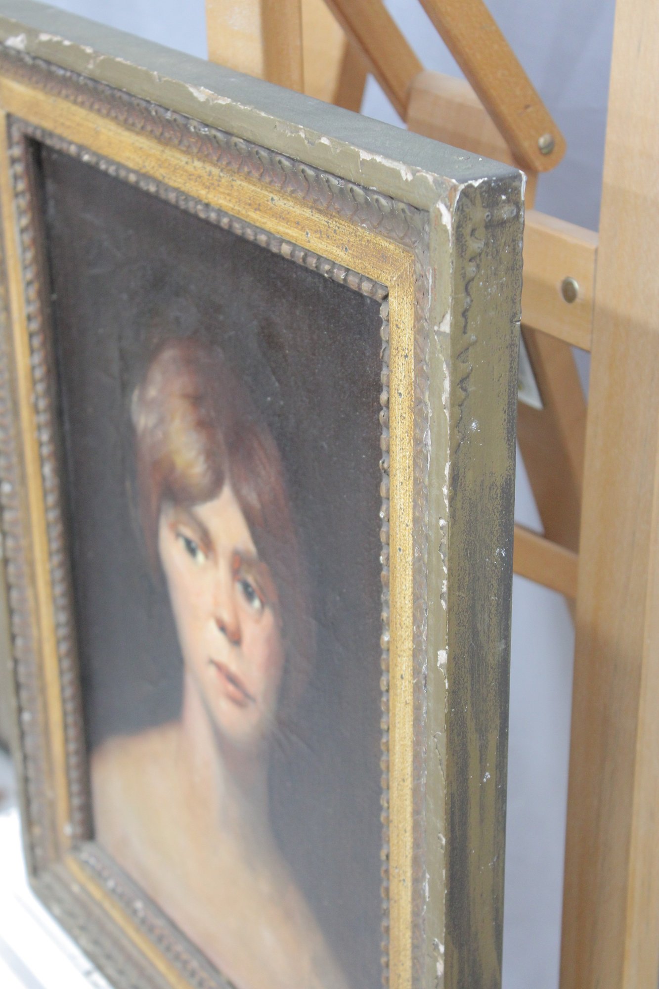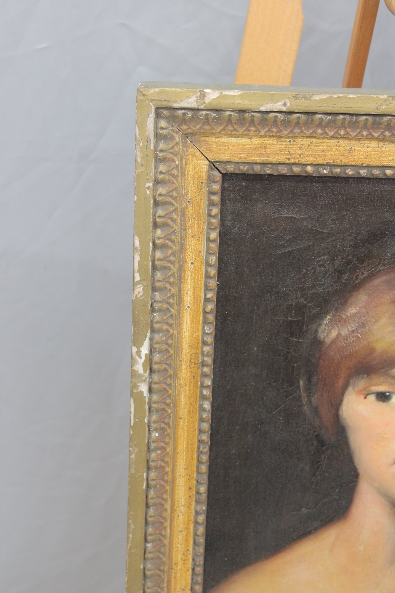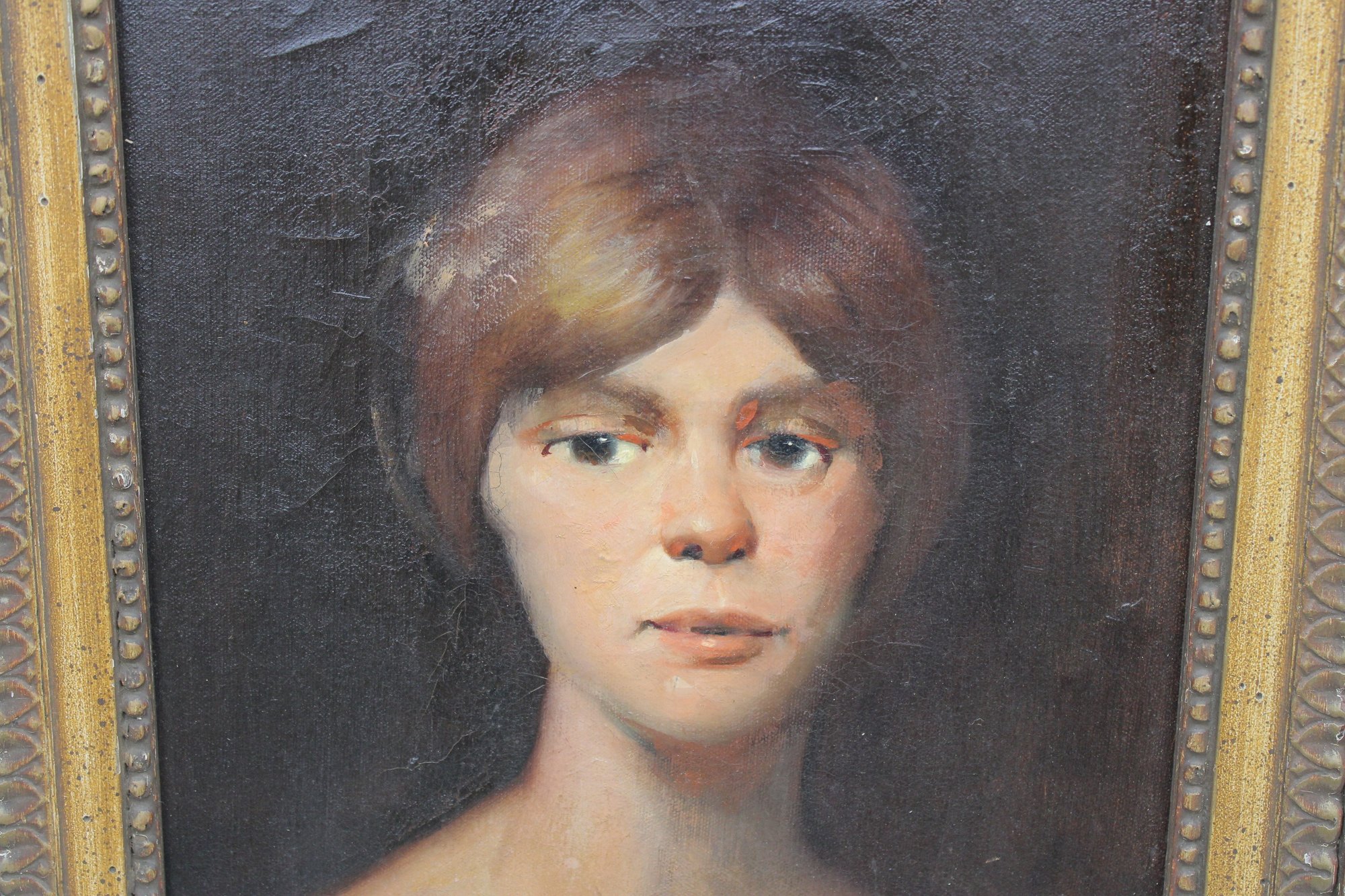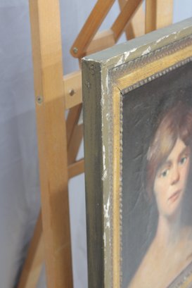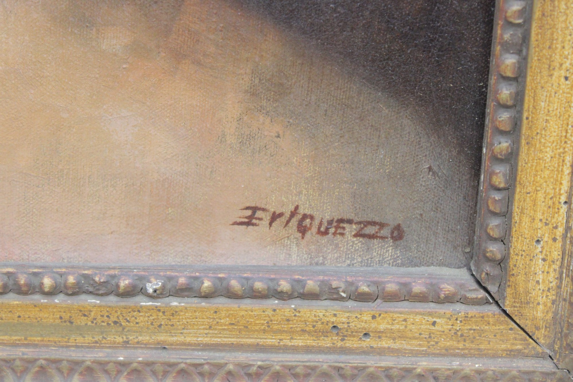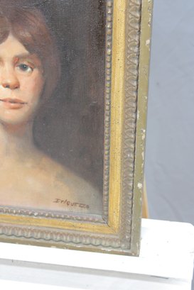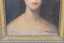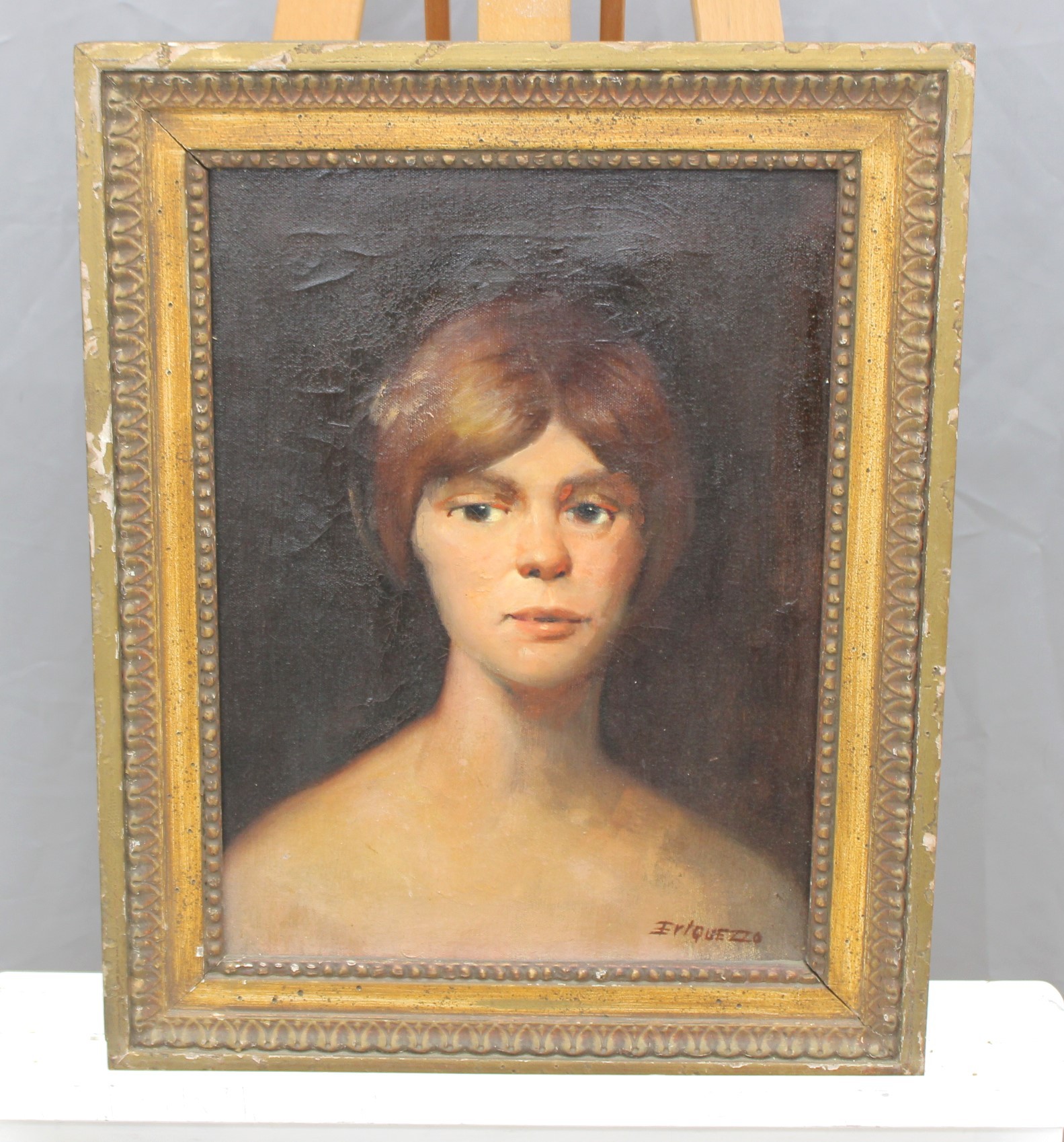 signed oil on canvas portrait, depicting a young woman rendered in a classical, restrained style. The artist’s signature is visible at the lower right of the canvas (appears to read Zriquezza; attribution unverified).