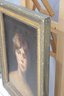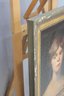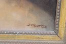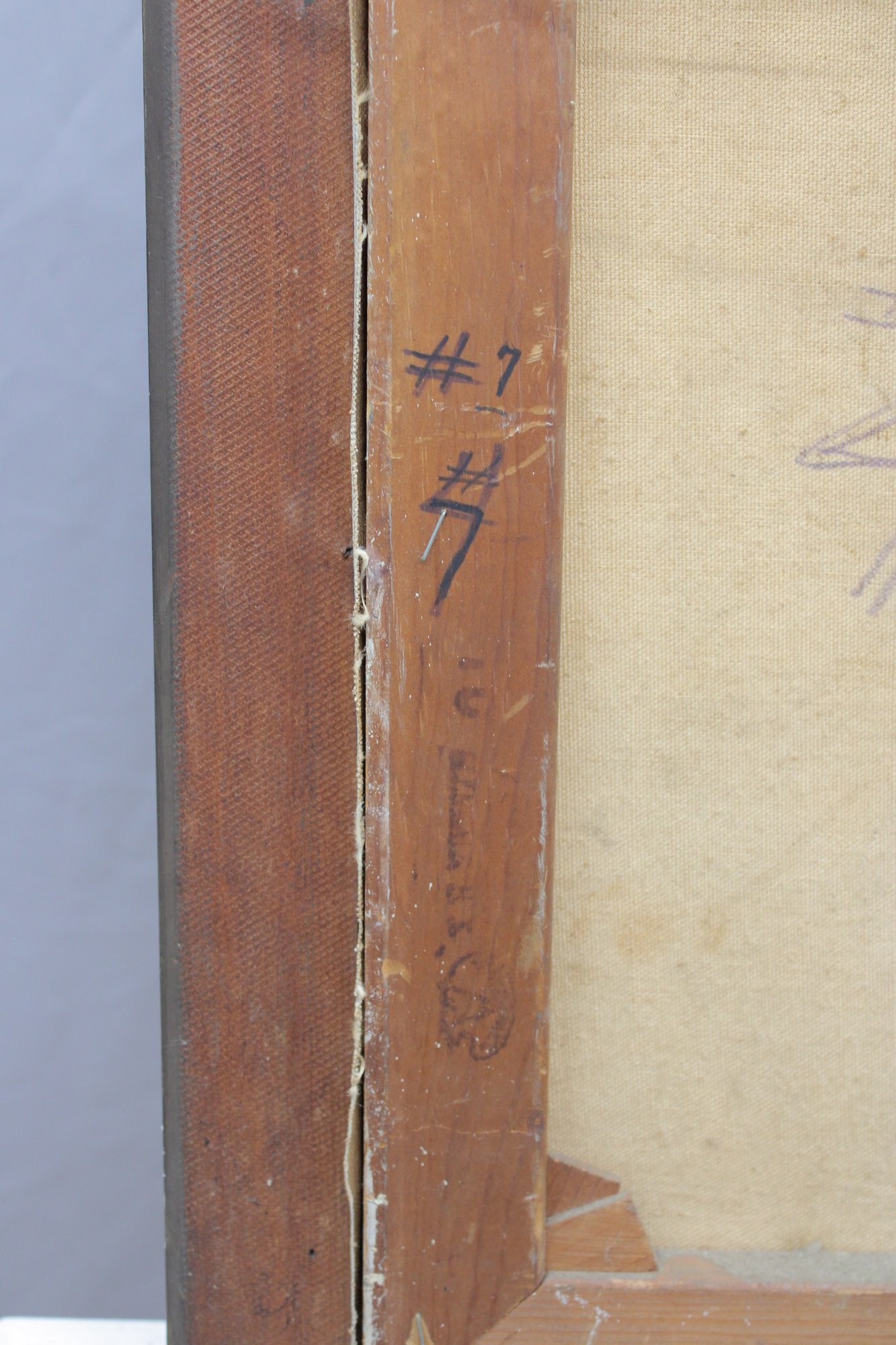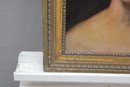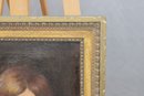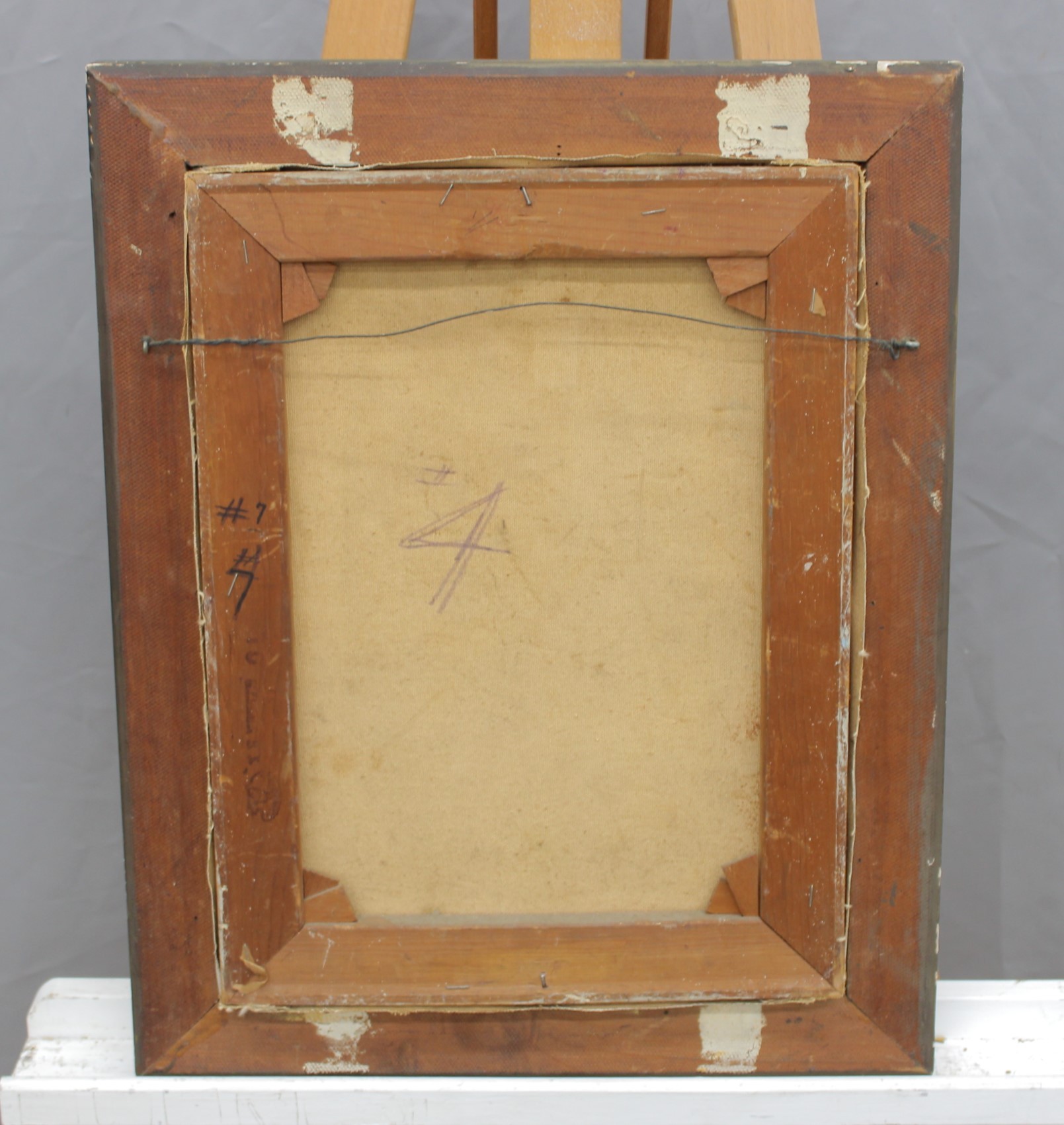 The painting is housed in a decorative gilt wood frame, which complements the subdued palette and period character of the work. The reverse shows traditional stretcher construction consistent with hand-painted canvas works.