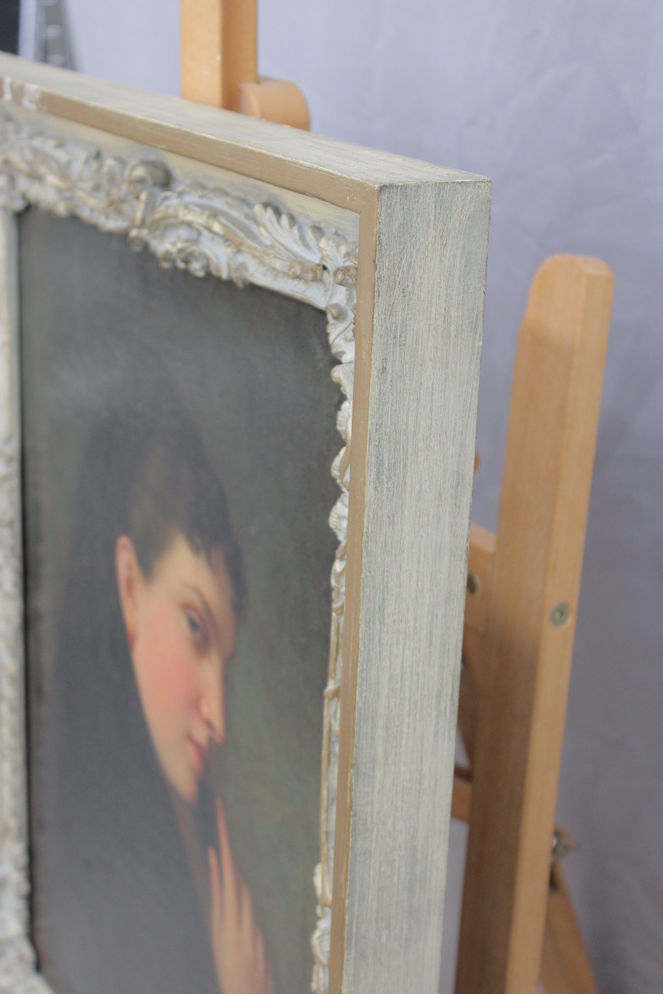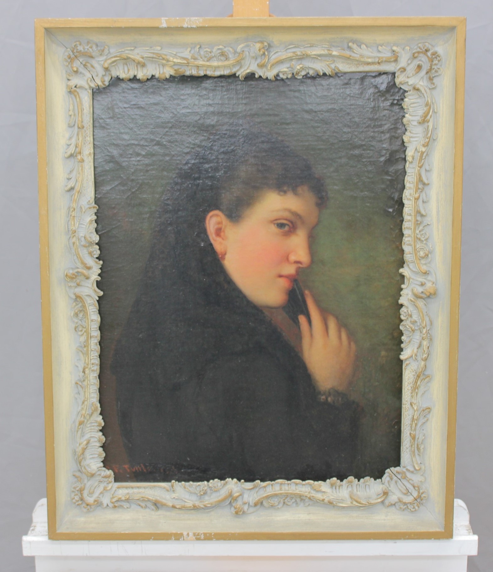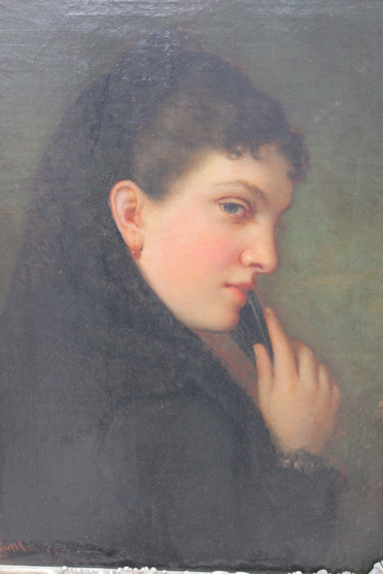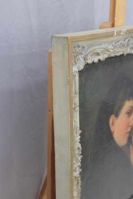 an original signed oil on canvas portrait, depicting a young woman shown in three-quarter profile against a softly shaded background. The subject is rendered with refined facial detail and subtle coloration, conveying a contemplative and intimate mood consistent with late-19th to early-20th-century portrait traditions.