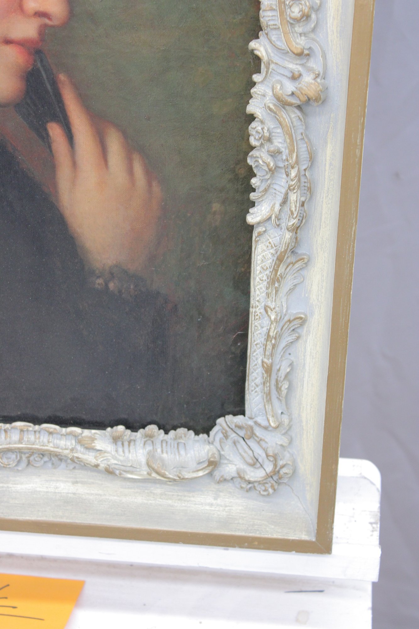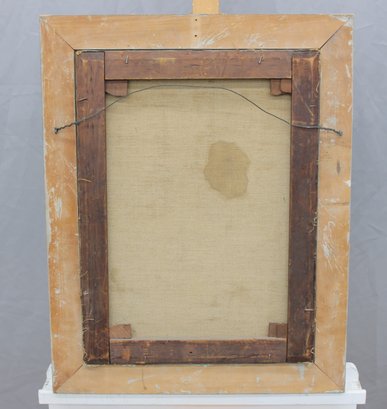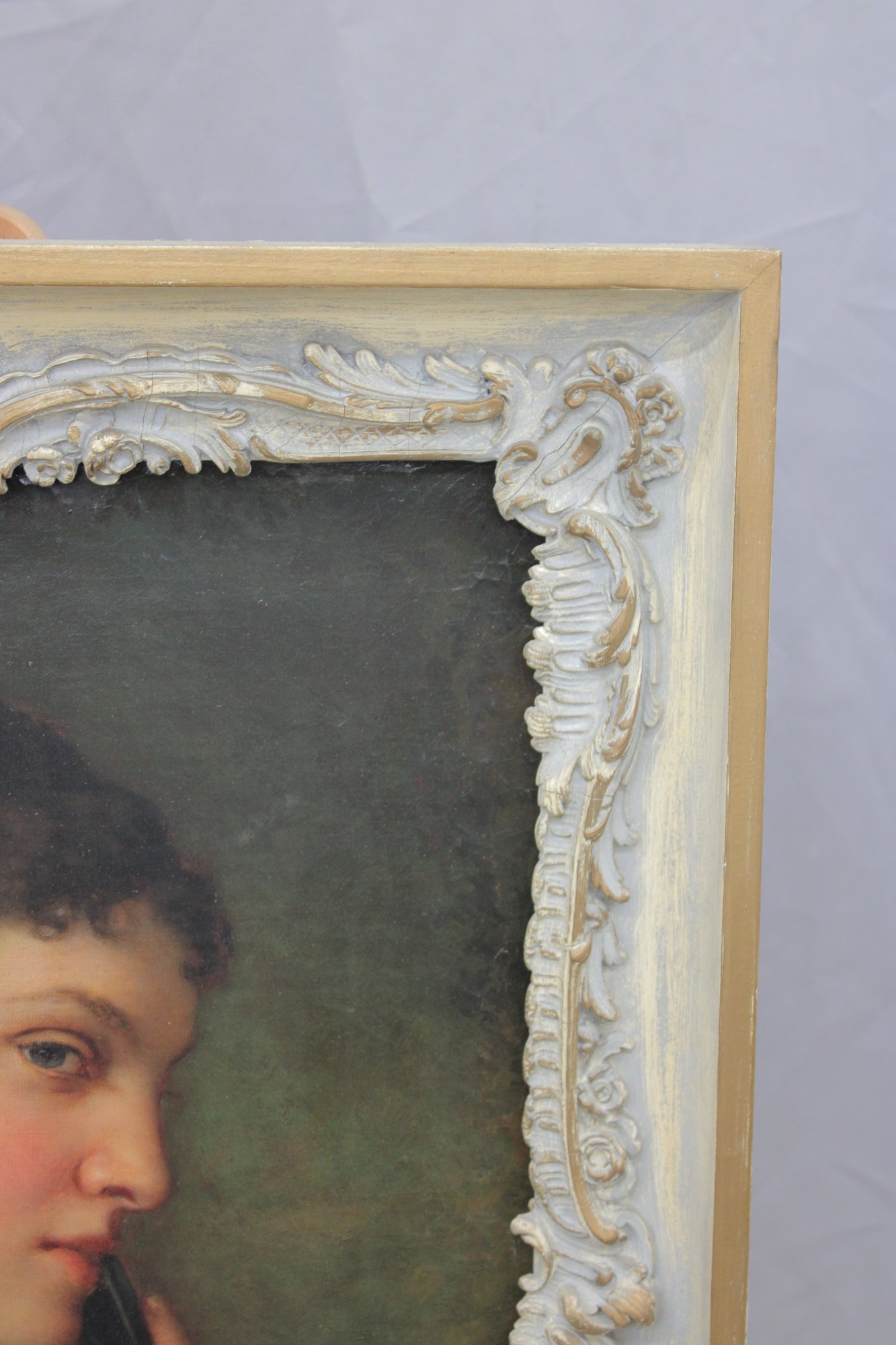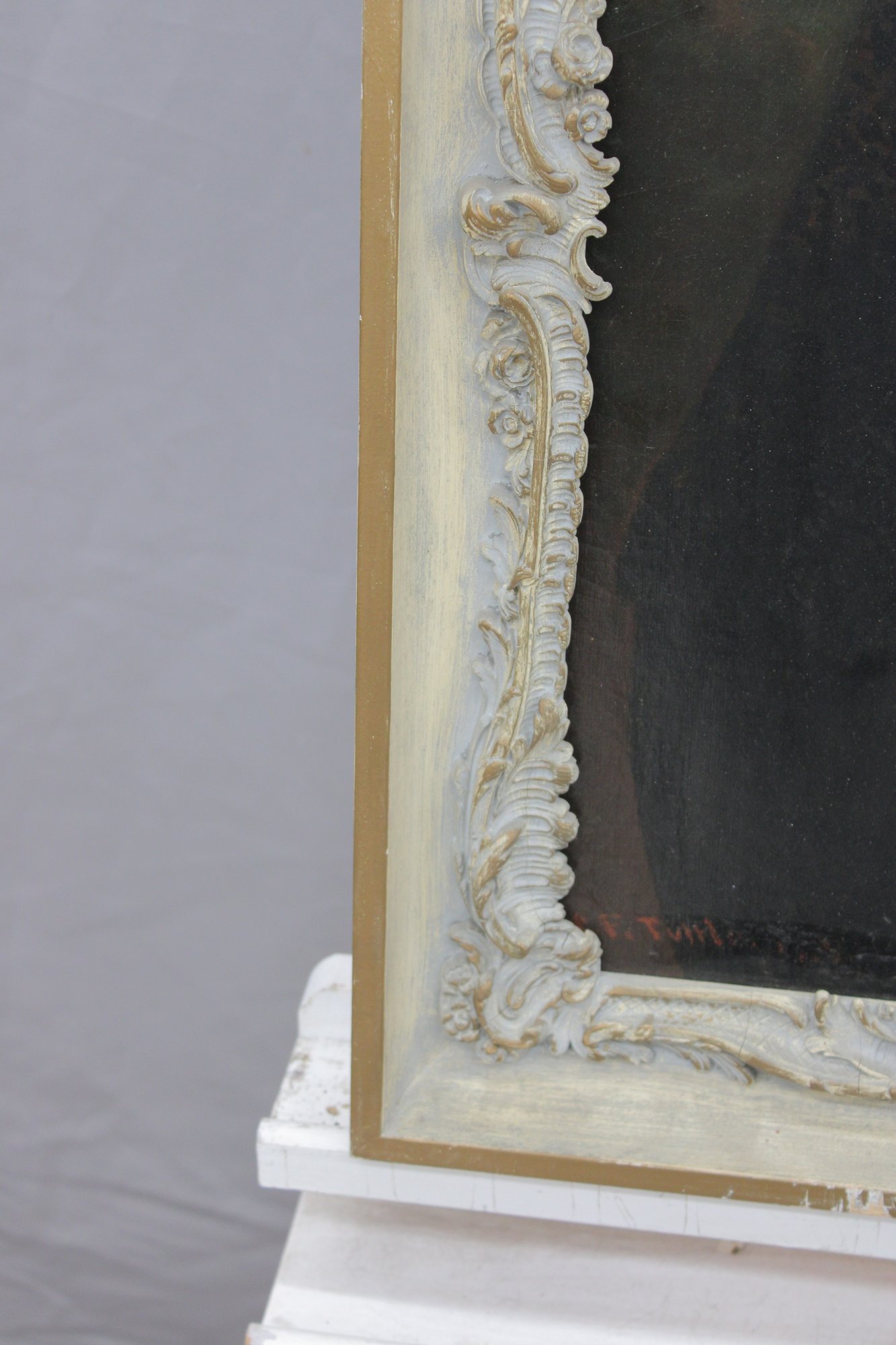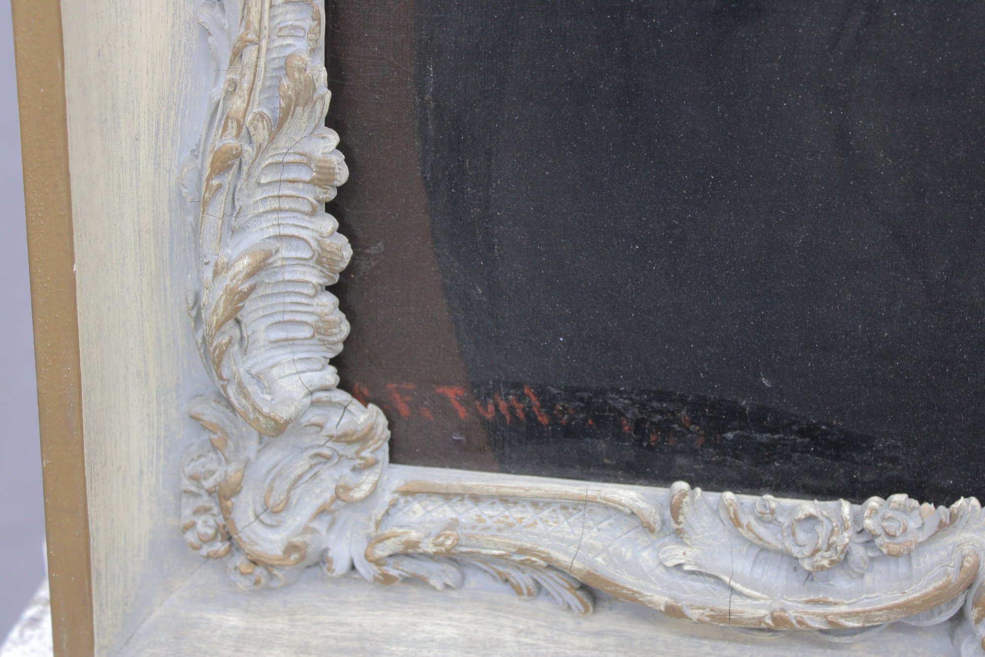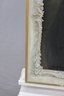 The painting is signed at the lower right (signature visible but not fully legible; artist attribution unverified) and is housed in a decorative molded frame with applied relief ornamentation that complements the classical presentation.