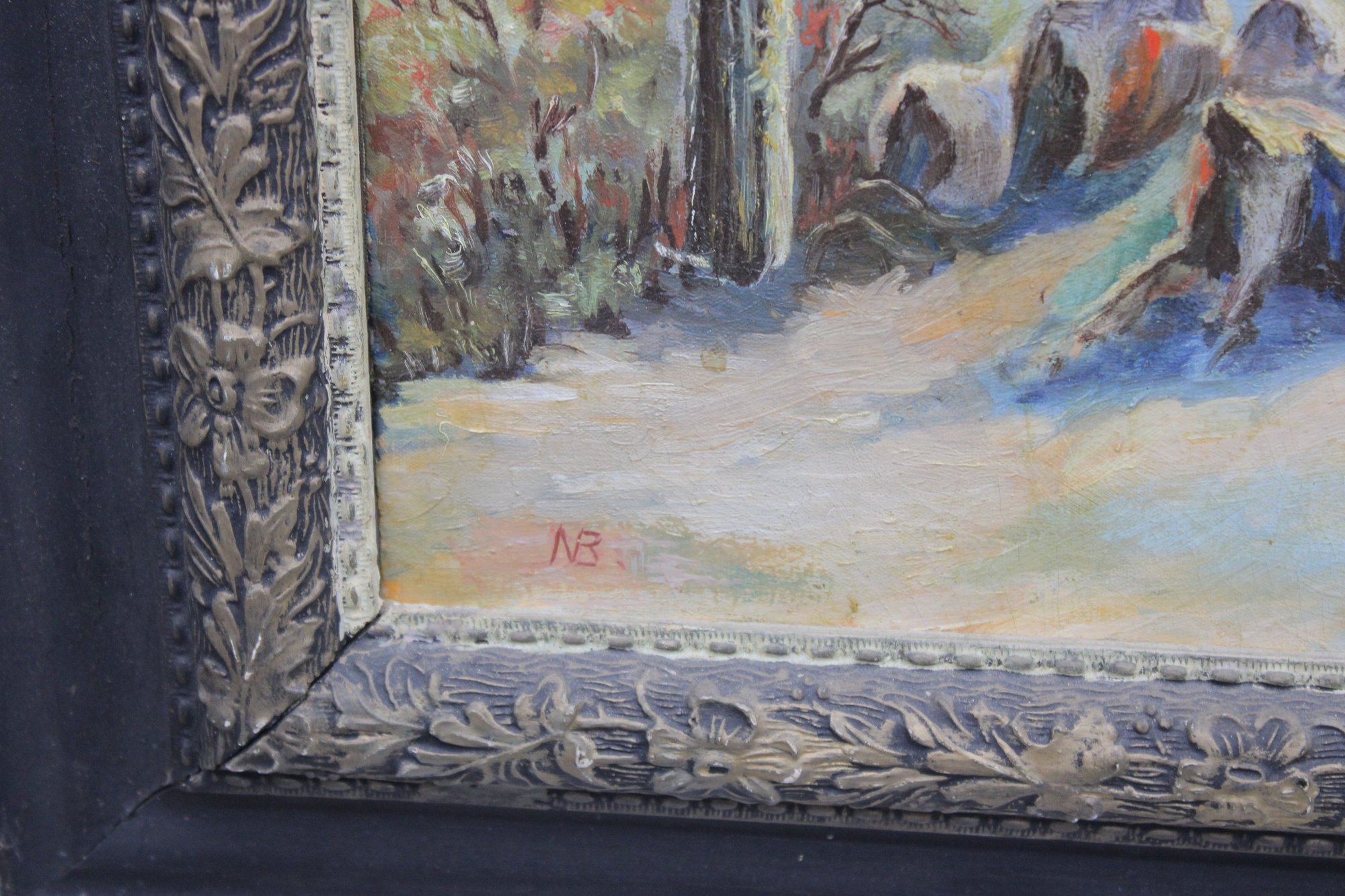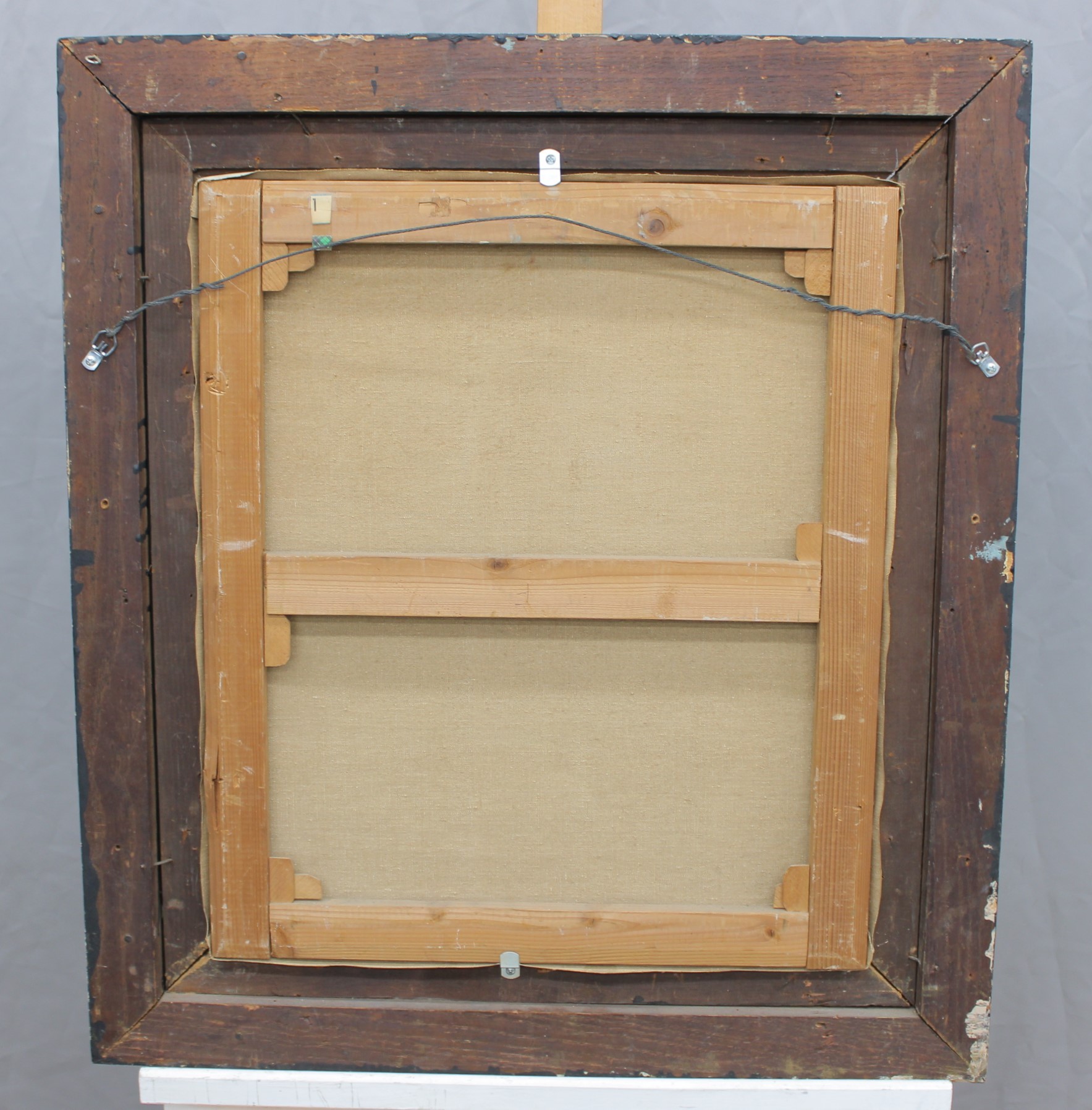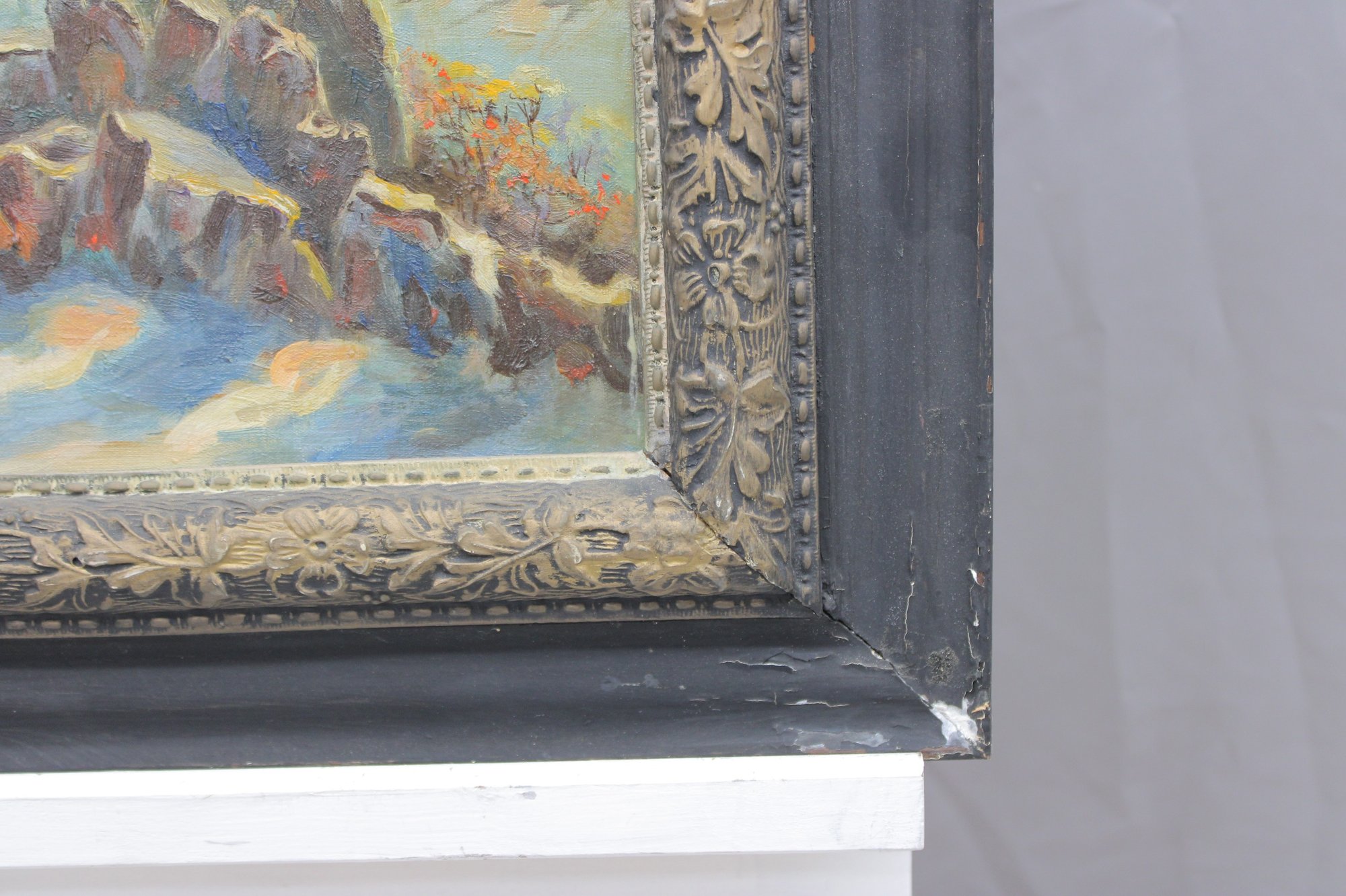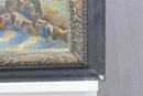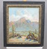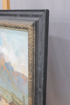 Warm earth tones are balanced by cool blues and soft sky hues, creating a harmonious composition that draws the viewer into the scene. The painting is signed in the lower right and is attractively presented in a black and gilt carved wood frame, which enhances the painting’s visual impact and period character.