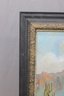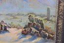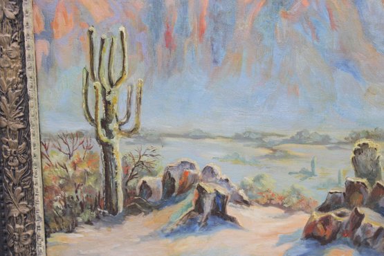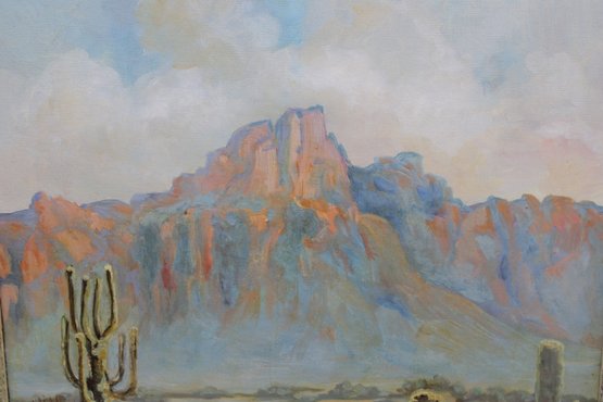 signed oil on canvas landscape painting depicting a sweeping Southwestern desert scene with cacti, rocky foreground, and a dramatic mesa rising in the distance. The artist employs a soft, painterly palette with layered brushwork to convey depth, atmosphere, and the vast openness characteristic of the American Southwest.