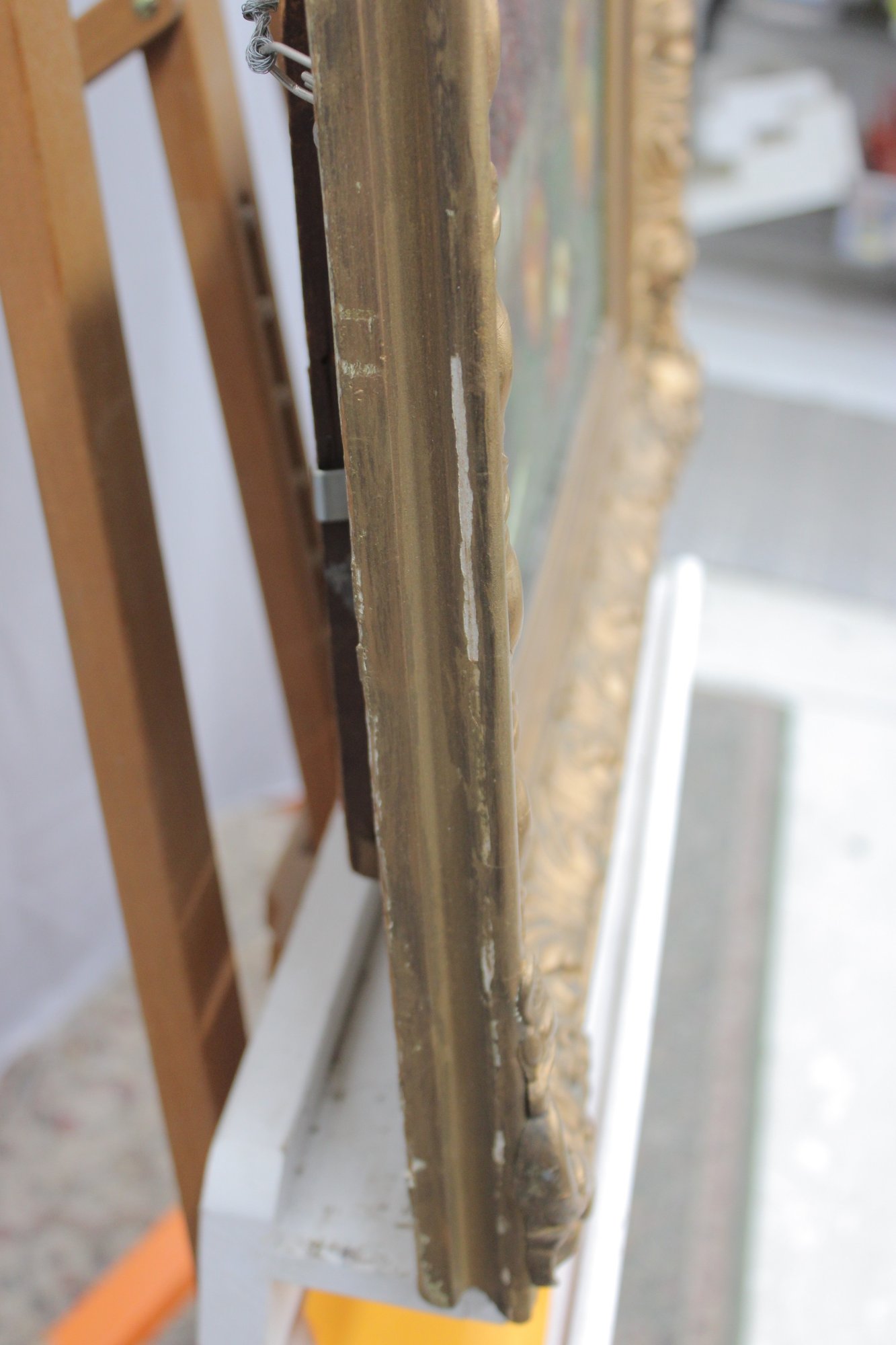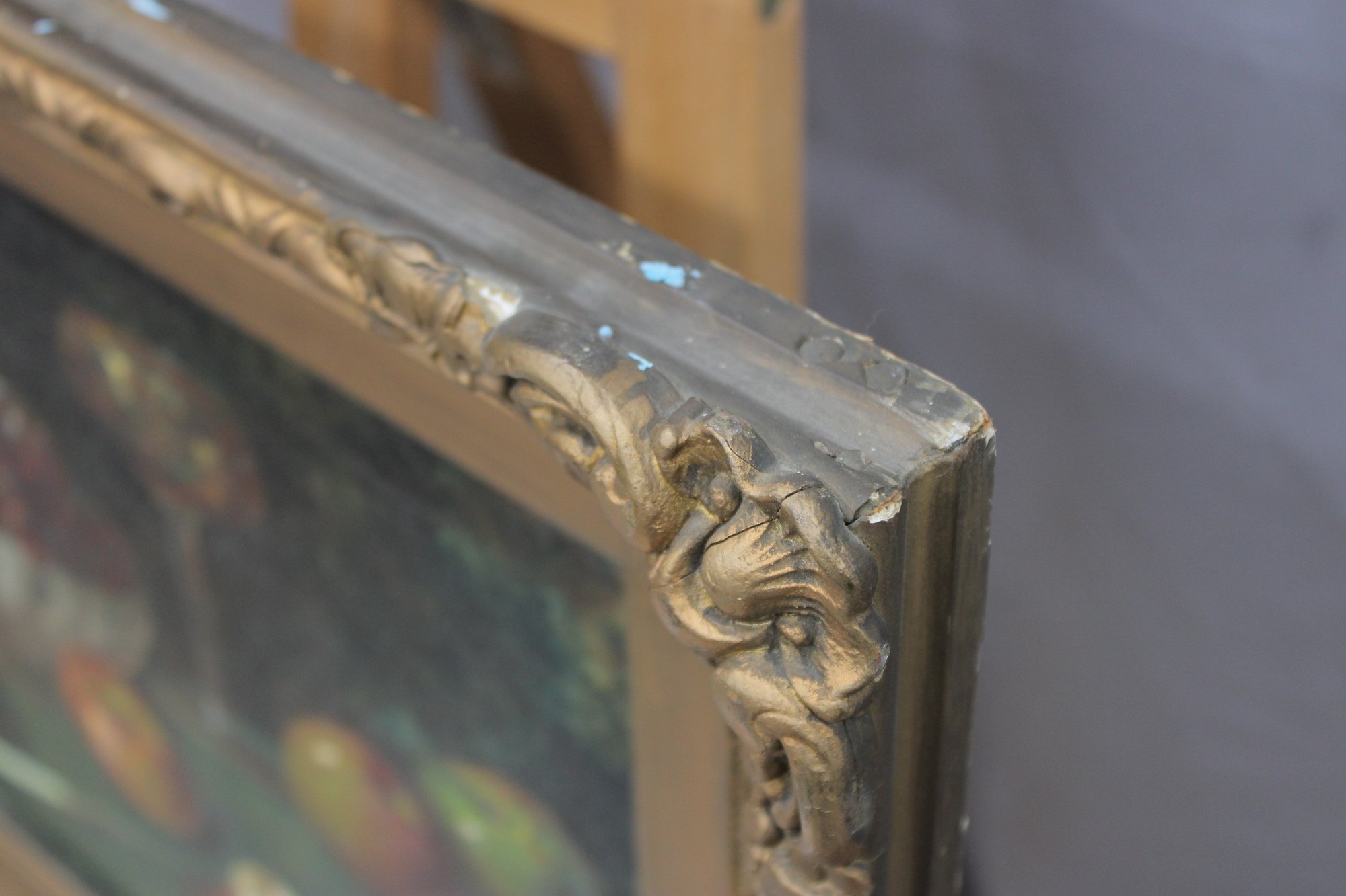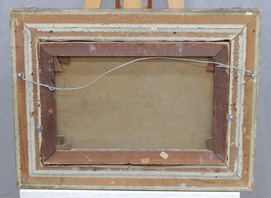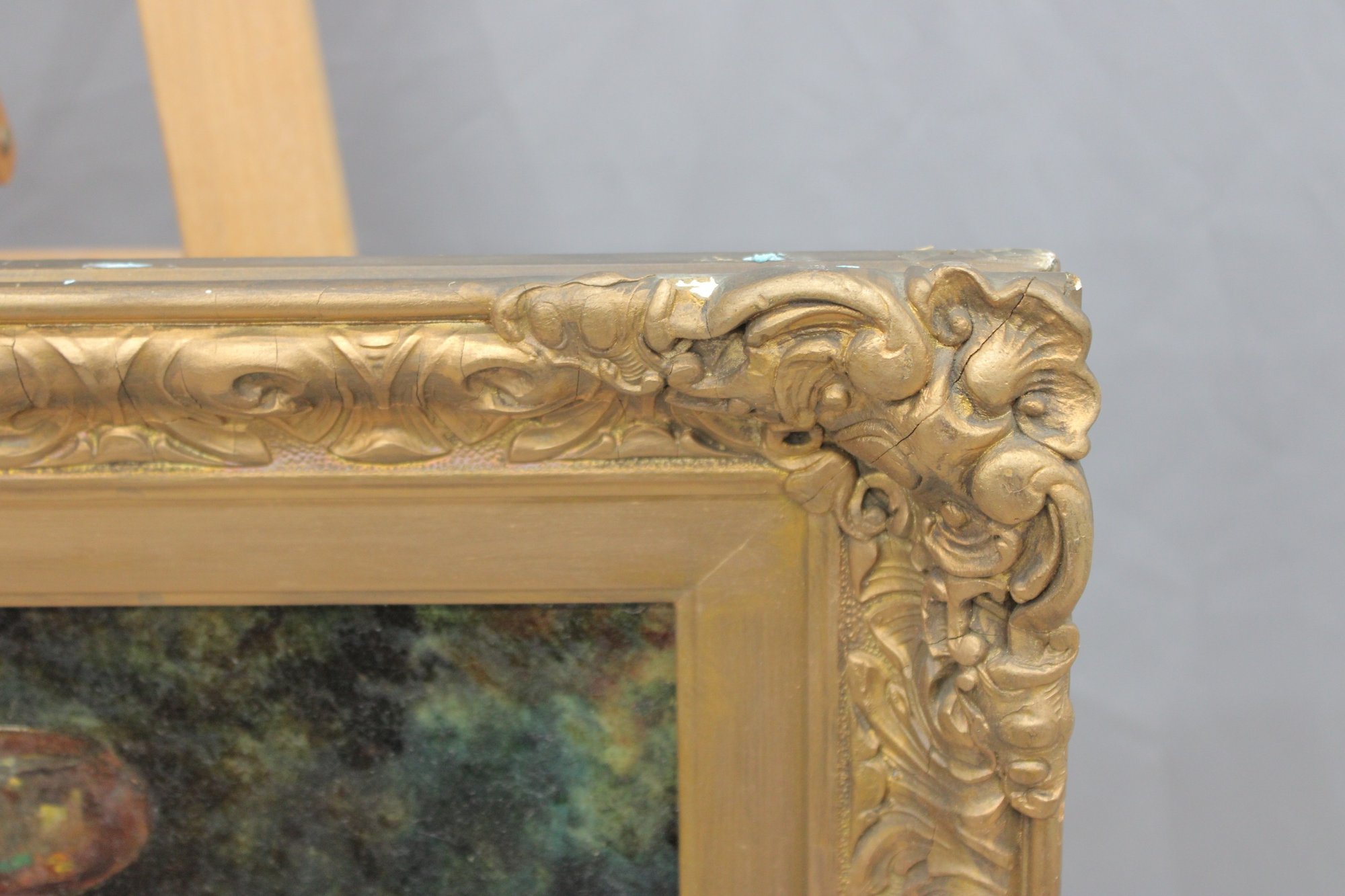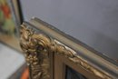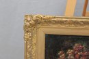 The painting is signed in the lower right (signature partially legible) and is presented in an impressive ornate gilt wood frame with scrolling and foliate detailing, which greatly enhances the overall presentation and decorative appeal of the work.