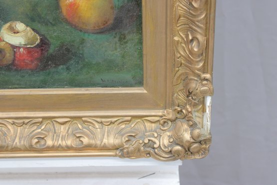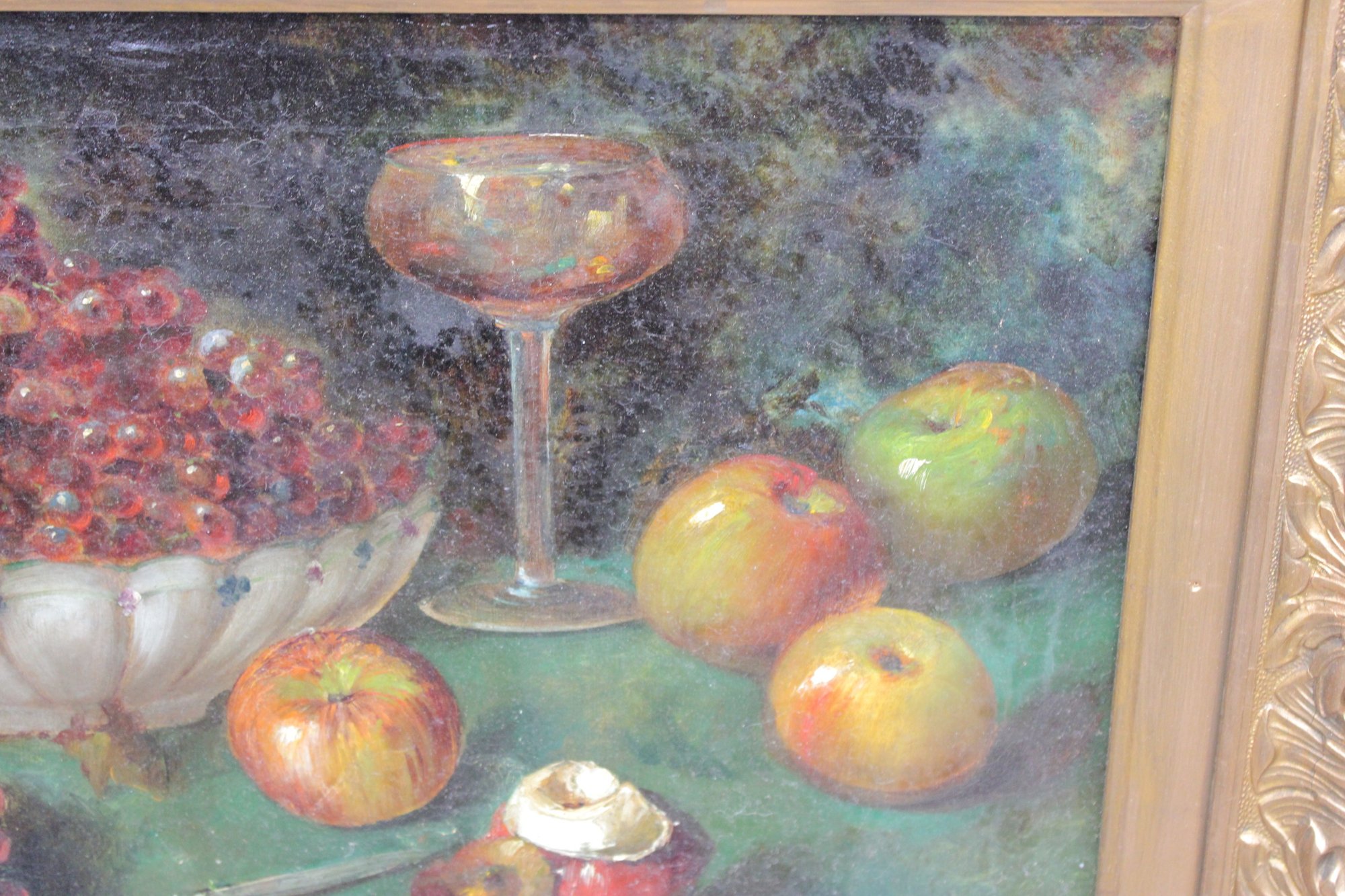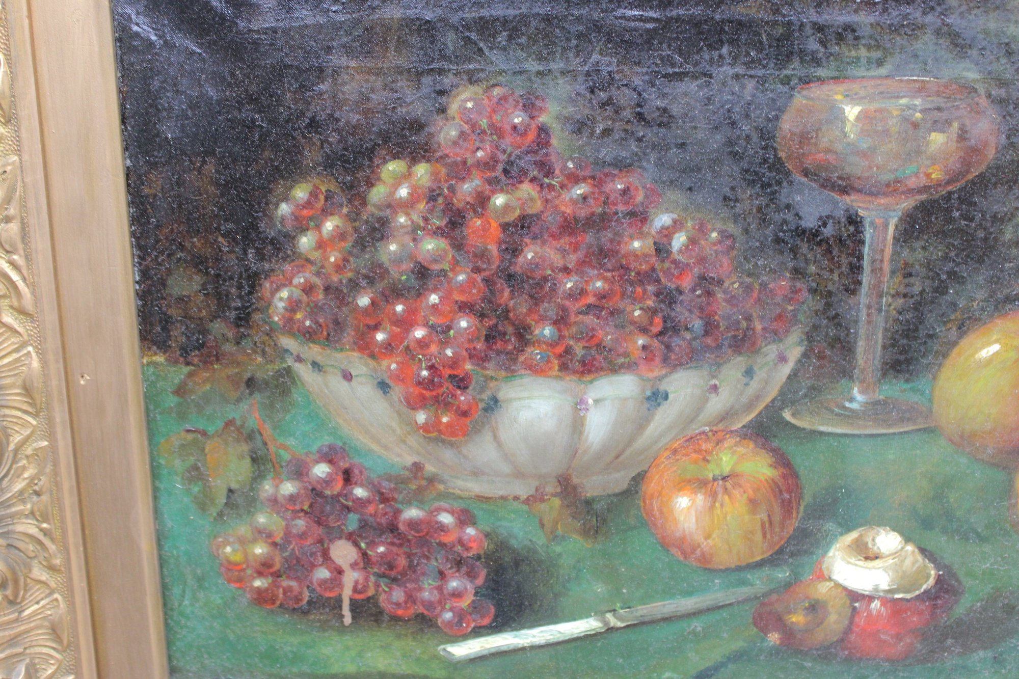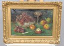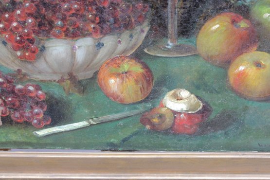 signed oil on canvas still life painting depicting a carefully arranged tabletop composition featuring grapes in a glass bowl, apples, a stemmed glass, and a small knife, set against a dark, atmospheric background. The artist displays strong control of color, light, and texture, giving the fruit a rich, dimensional presence and a traditional European still life character.