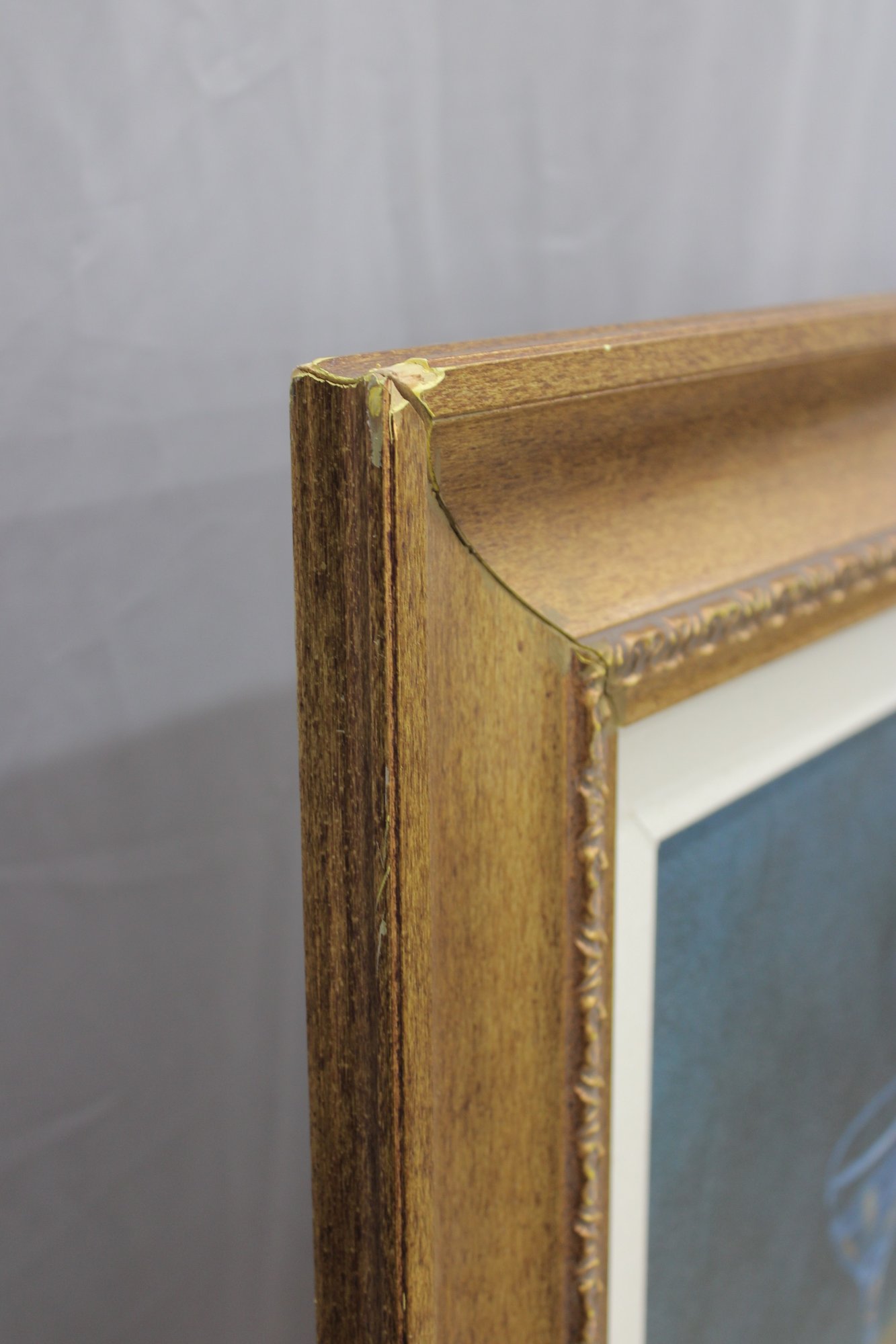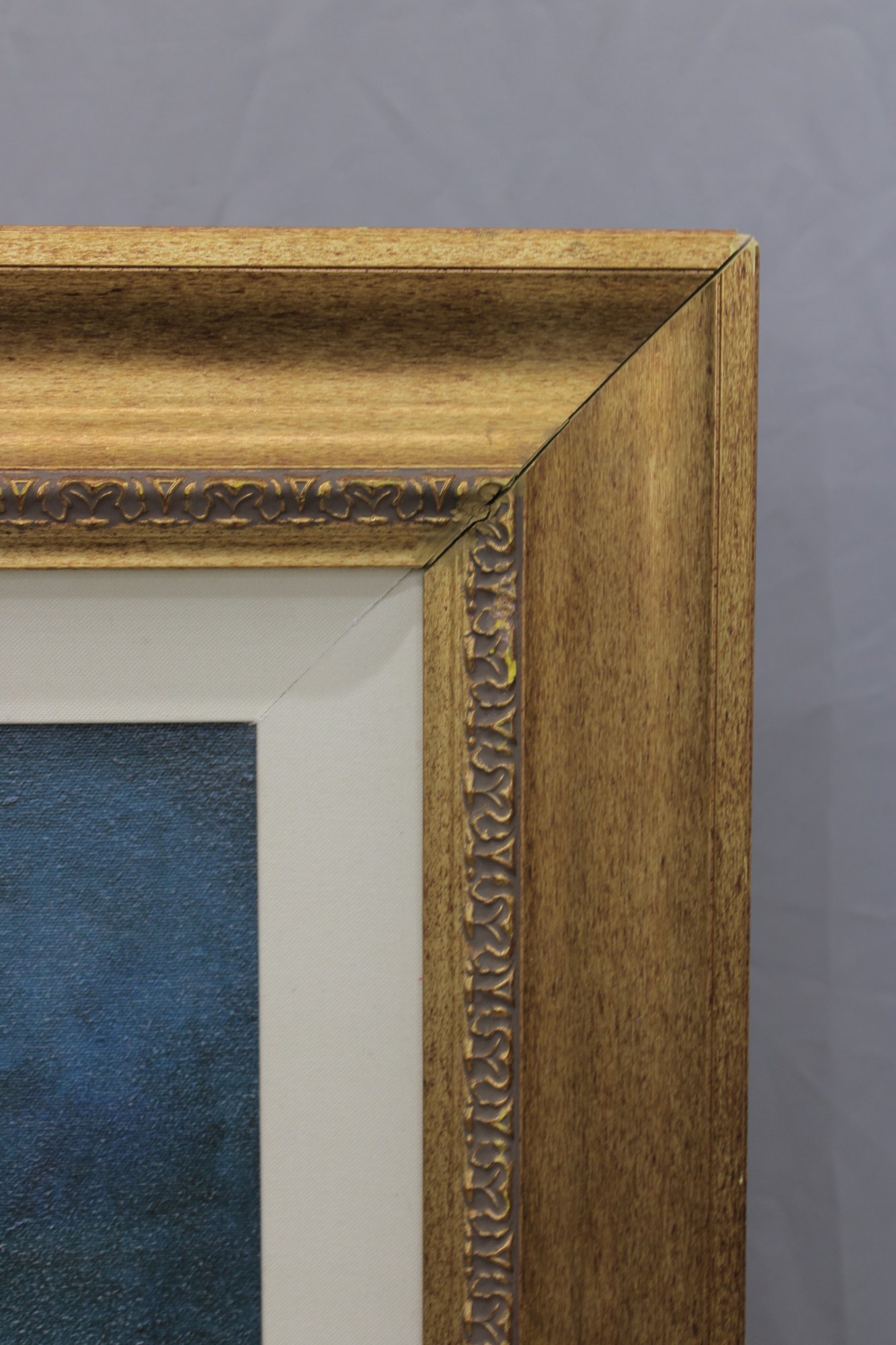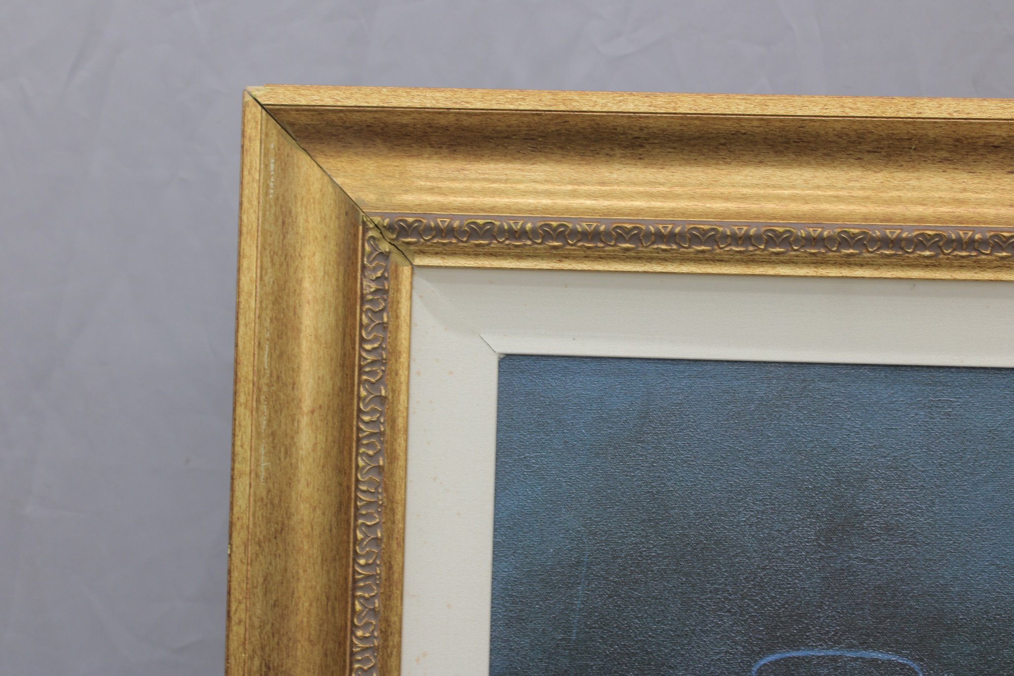 Warm earth tones of the table contrast beautifully with the cool blue-gray background, allowing the objects to stand out while maintaining a cohesive, restrained palette. The painting is signed and is attractively presented in a gilt wood frame, giving the work a polished and elegant presence suitable for both traditional and contemporary interiors.