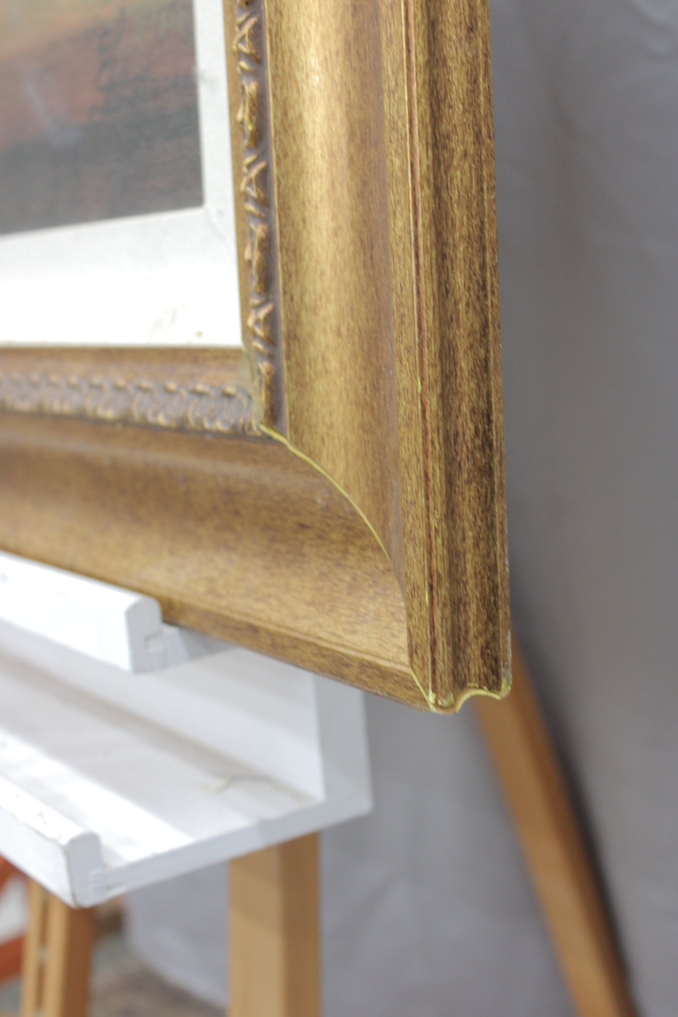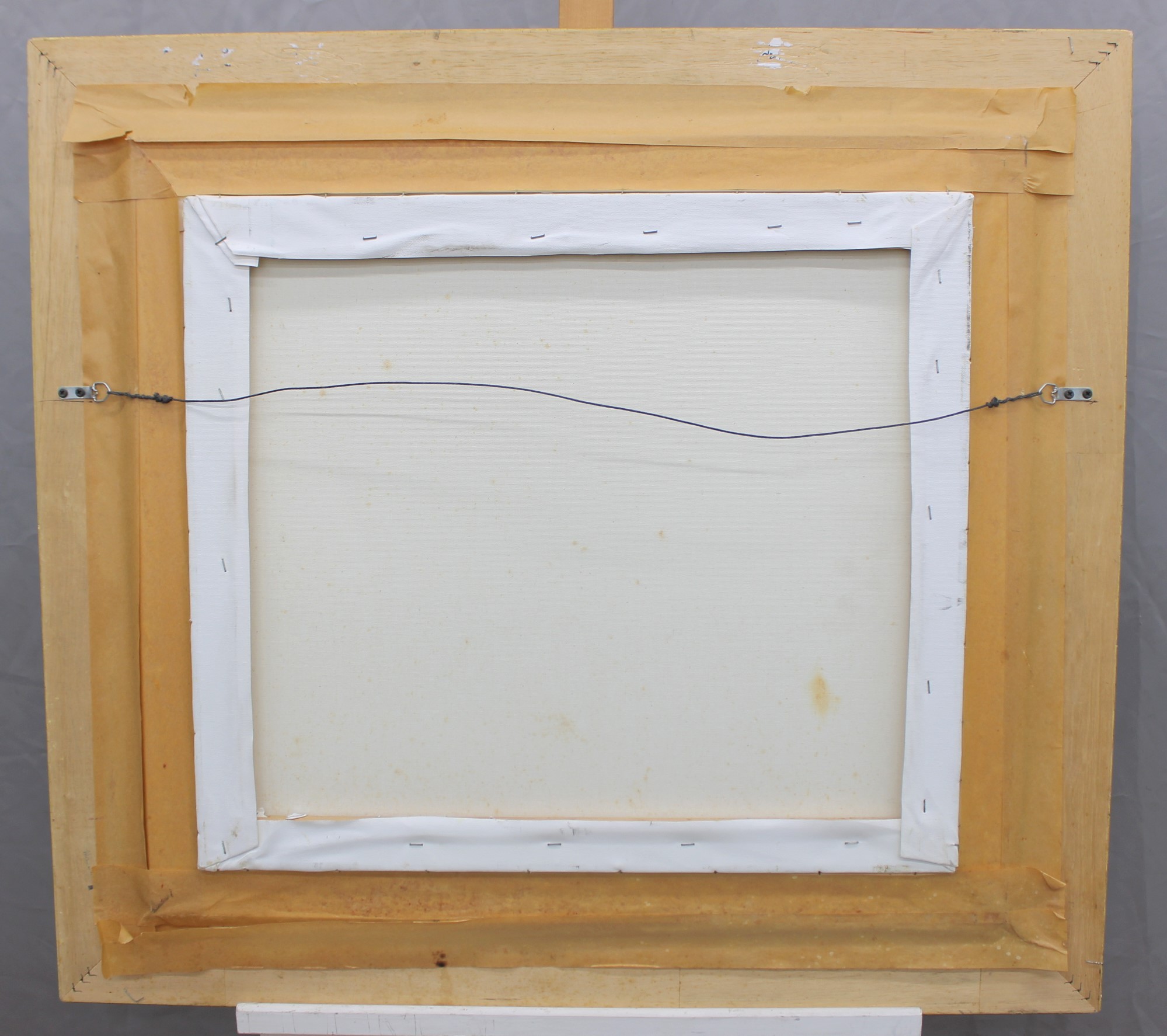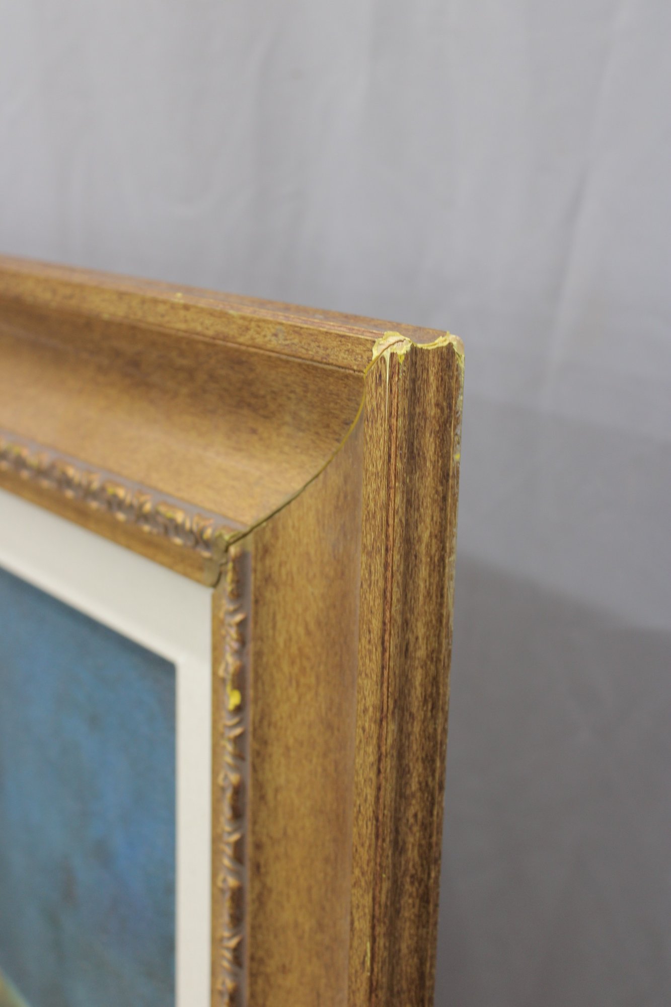 Warm earth tones of the table contrast beautifully with the cool blue-gray background, allowing the objects to stand out while maintaining a cohesive, restrained palette. The painting is signed and is attractively presented in a gilt wood frame, giving the work a polished and elegant presence suitable for both traditional and contemporary interiors.