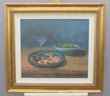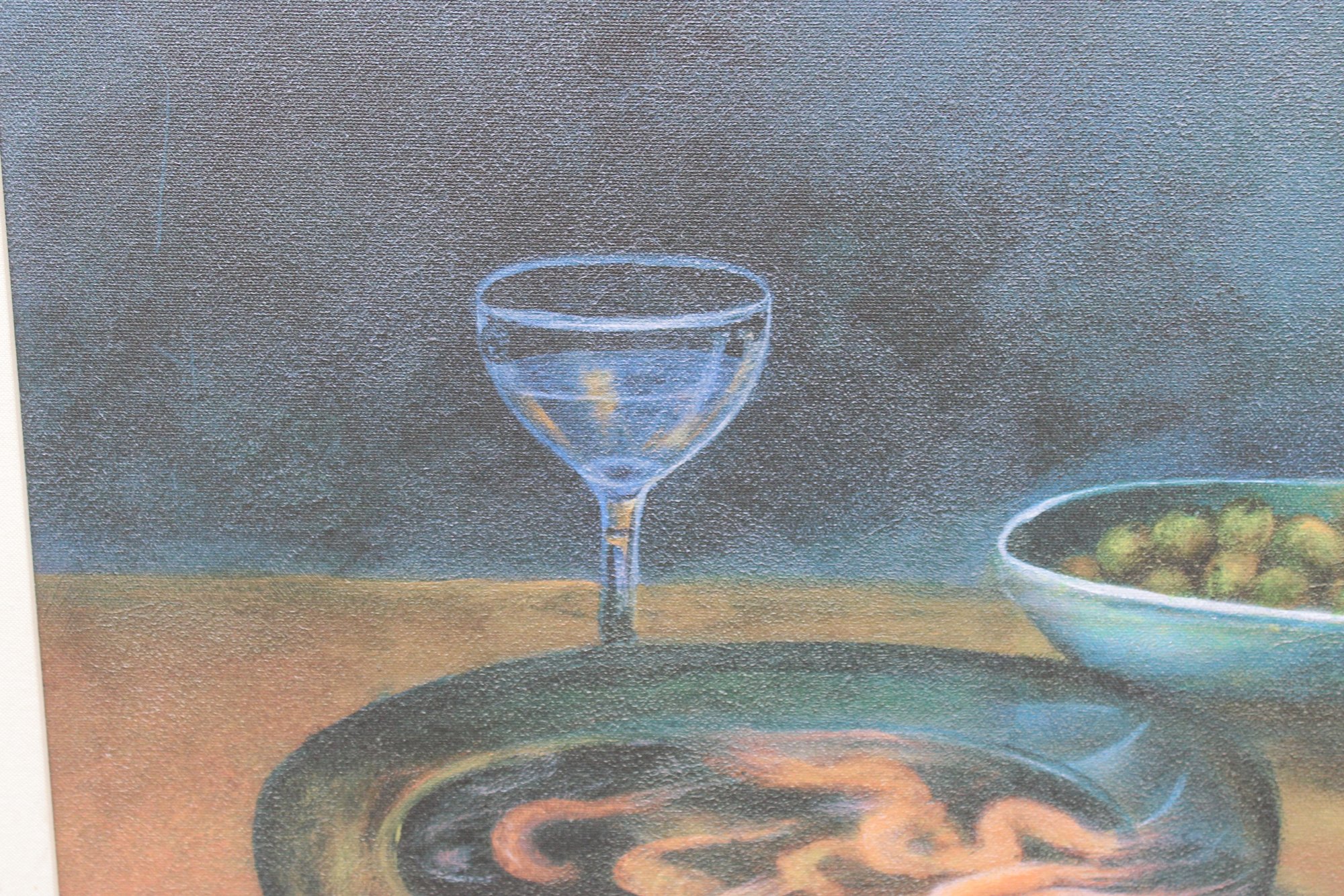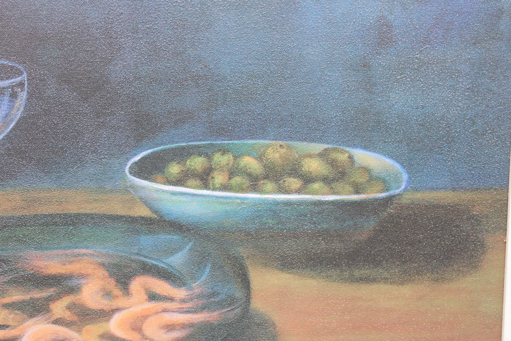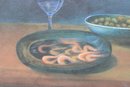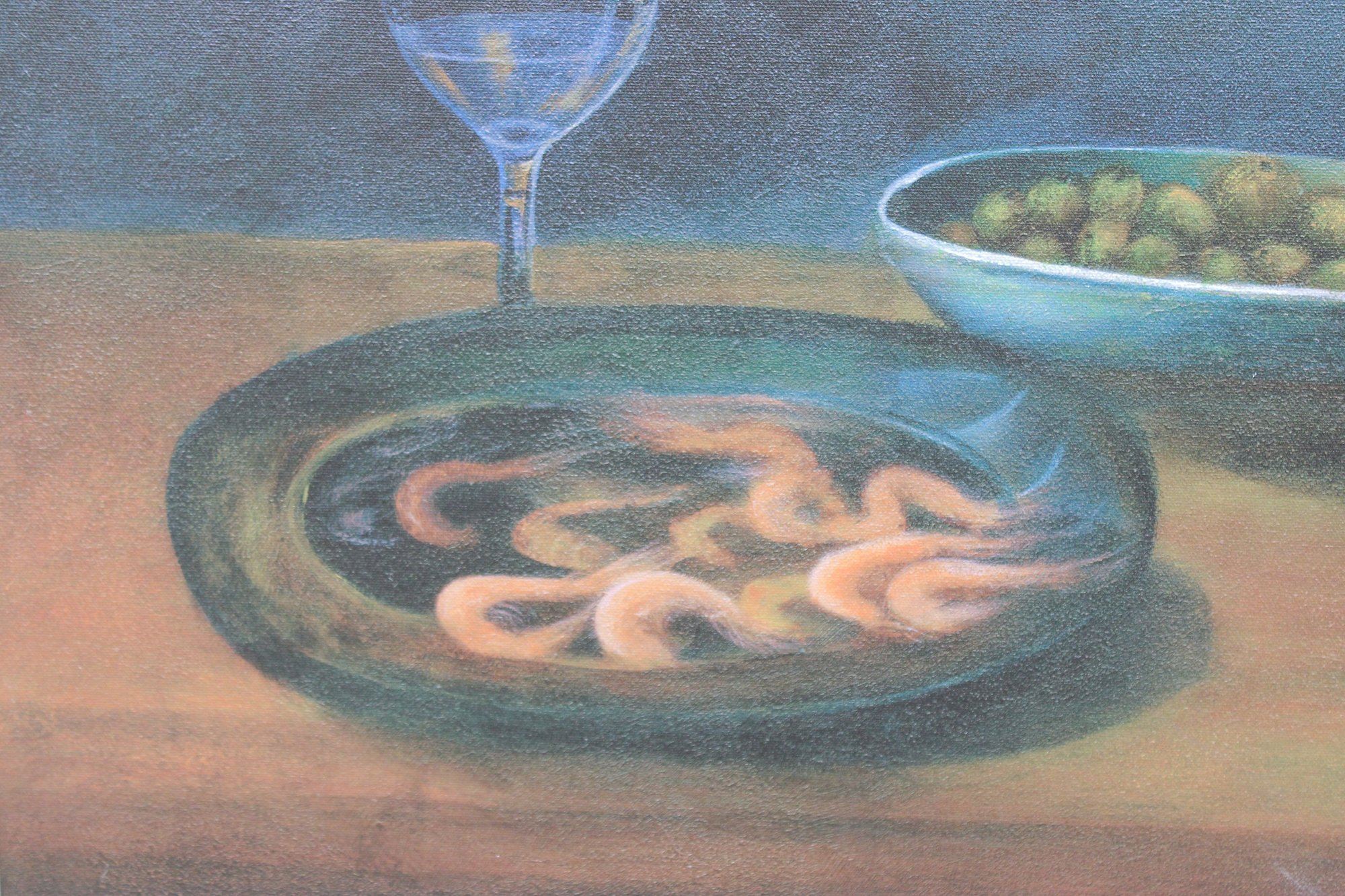 a signed oil on canvas still life painting depicting a carefully arranged tabletop scene featuring a dish of shrimp, a bowl, and a wine glass set against a softly toned background. The composition balances realism with a painterly approach, using subtle color transitions and controlled brushwork to create depth, atmosphere, and quiet sophistication.
