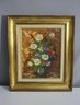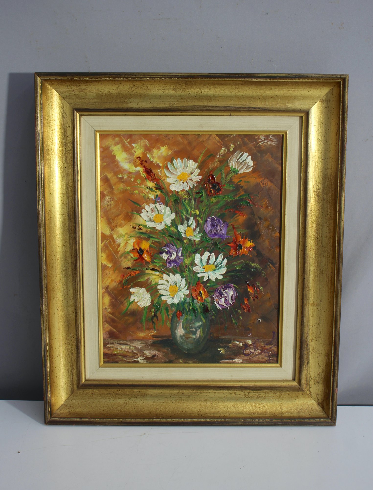 An exquisite original oil painting featuring a vibrant bouquet of flowers in a glass vase, signed by the artist. The dynamic brushstrokes and rich color palette create a lively and textured depiction of daisies, roses, and other blossoms against a warm, earthy background. The painting is presented in a luxurious gold frame with a cream-colored inner border.