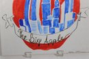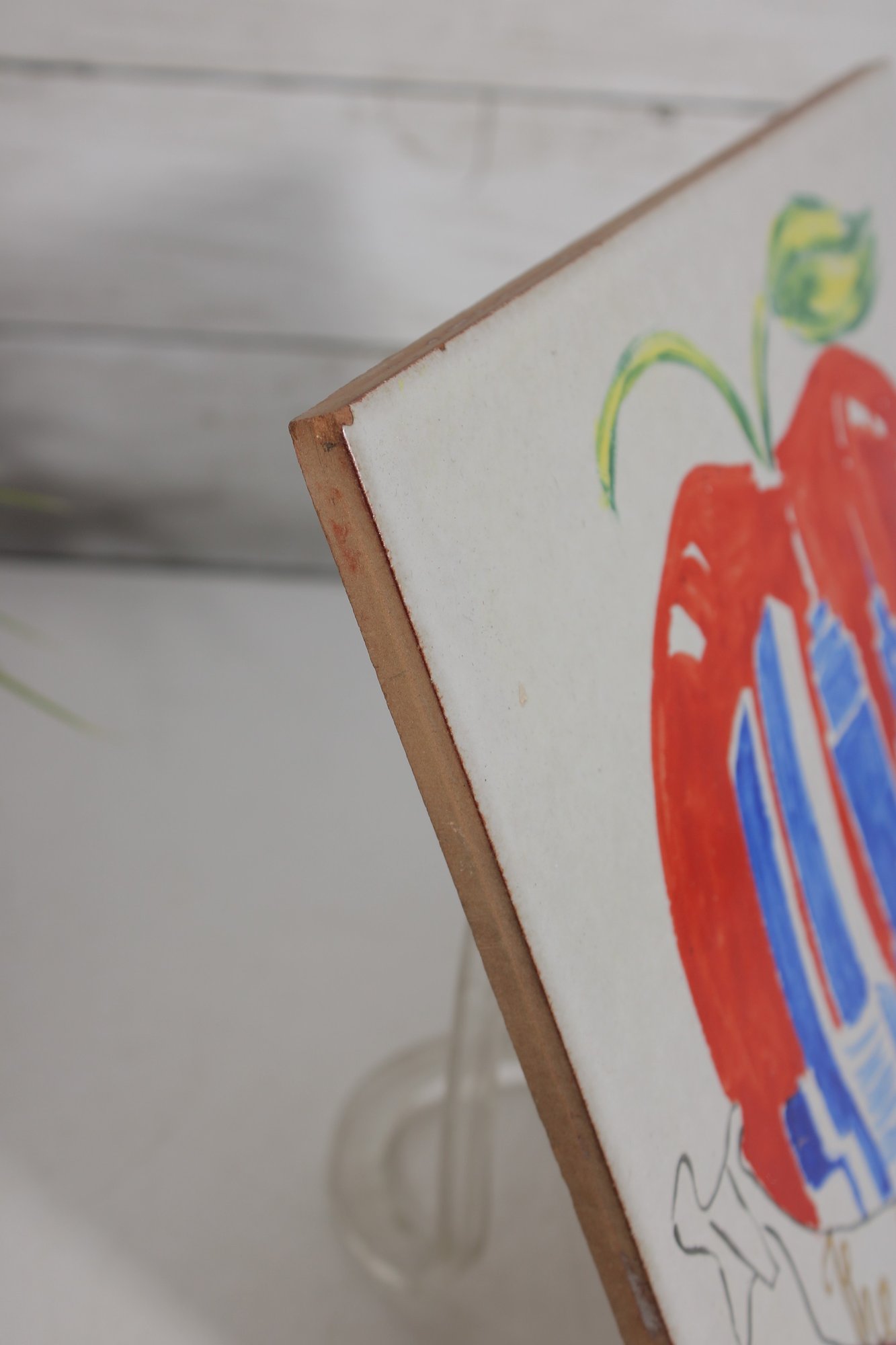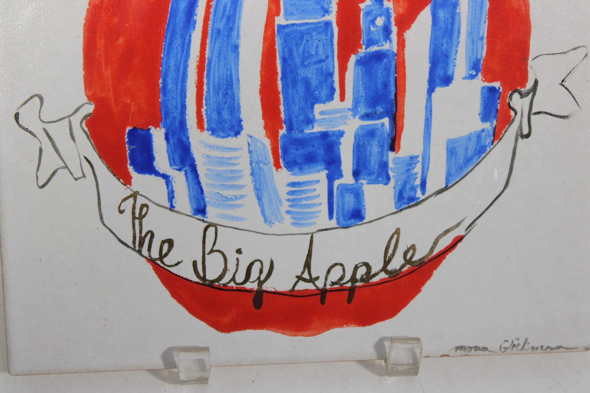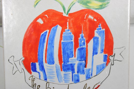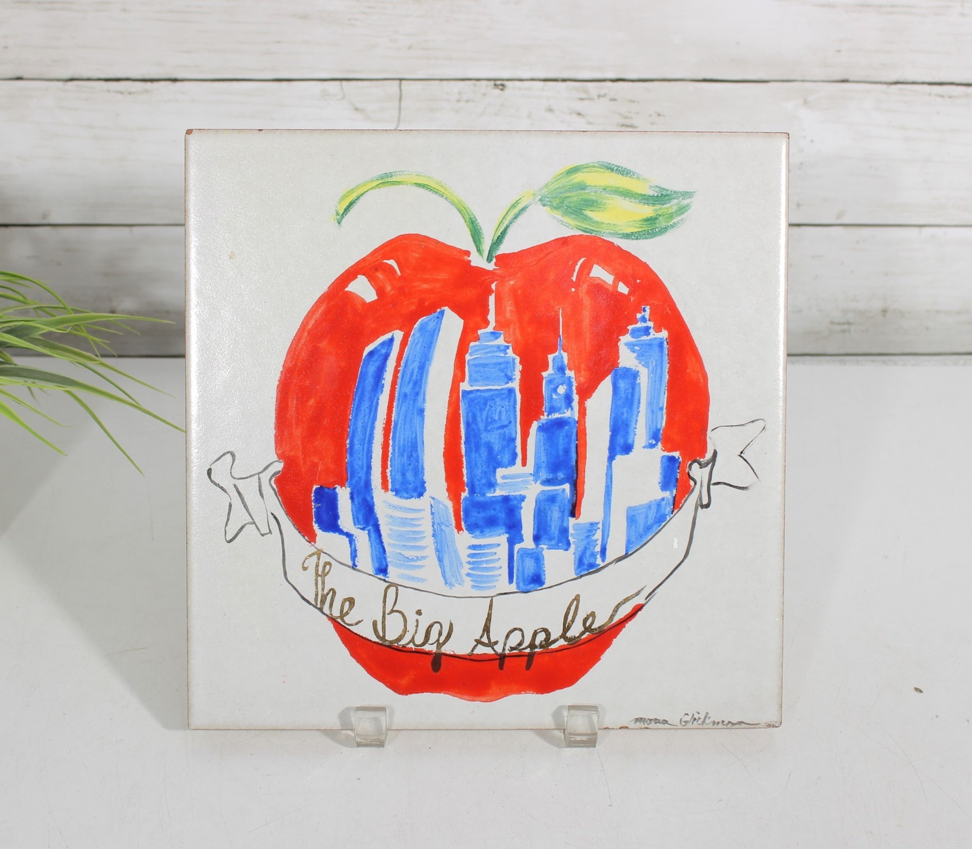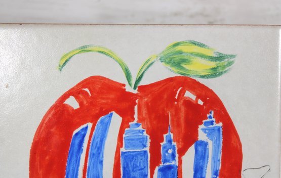 Vibrant and eye-catching signed ceramic tile featuring a bold pop art interpretation of New York City, titled “The Big Apple.” This hand-painted piece showcases a stylized blue skyline set within a bright red apple, blending iconic city imagery with playful, graphic design.