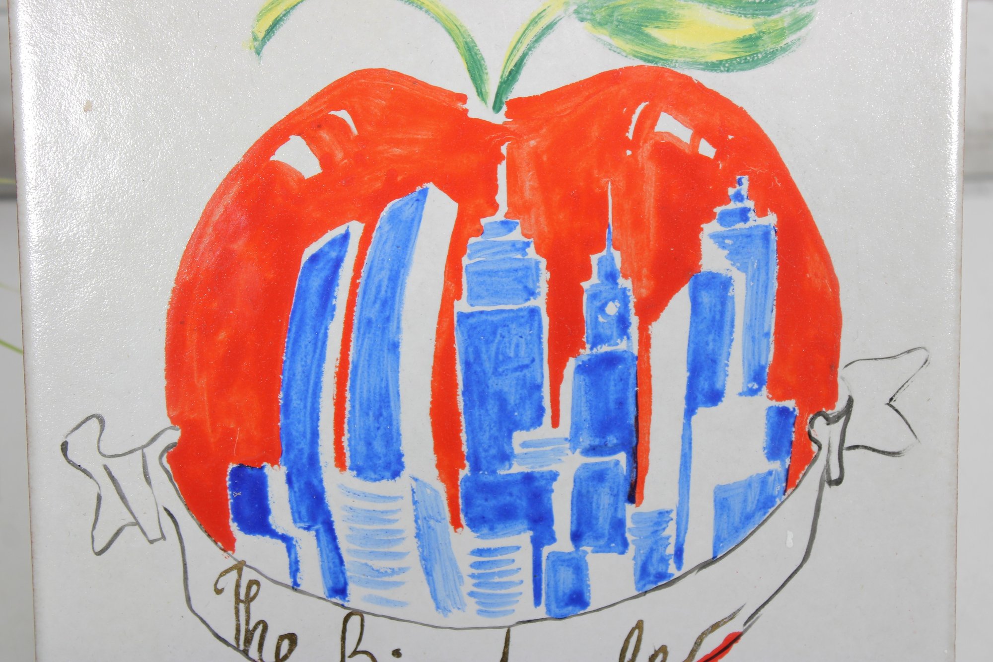 Executed on a 10” x 10” ceramic tile (marked “Made in Italy” on the reverse), the artwork has a lively, contemporary feel with expressive brushwork and strong color contrast. The lower portion includes a ribbon banner reading “The Big Apple,” adding to its charm and thematic appeal.