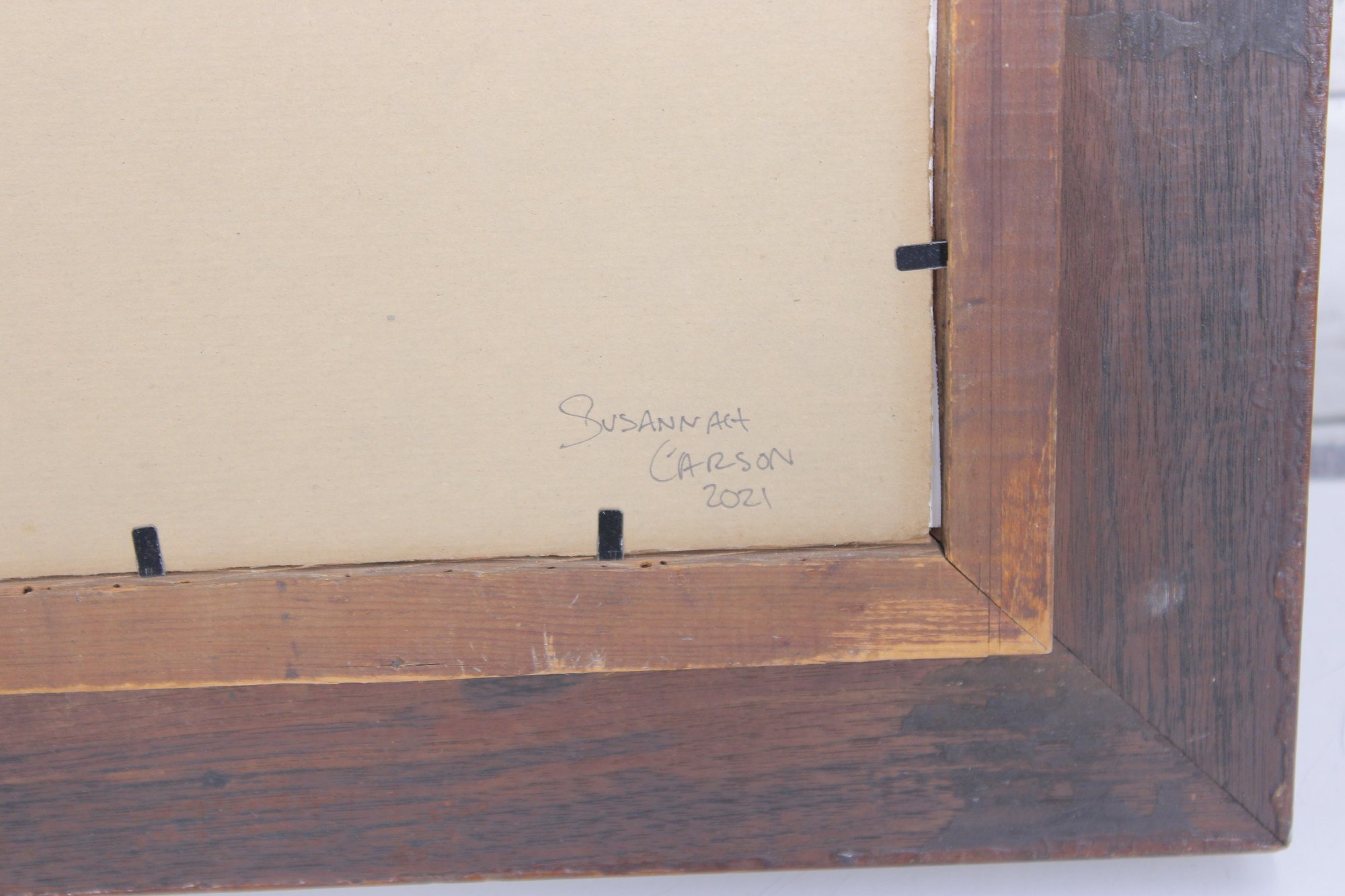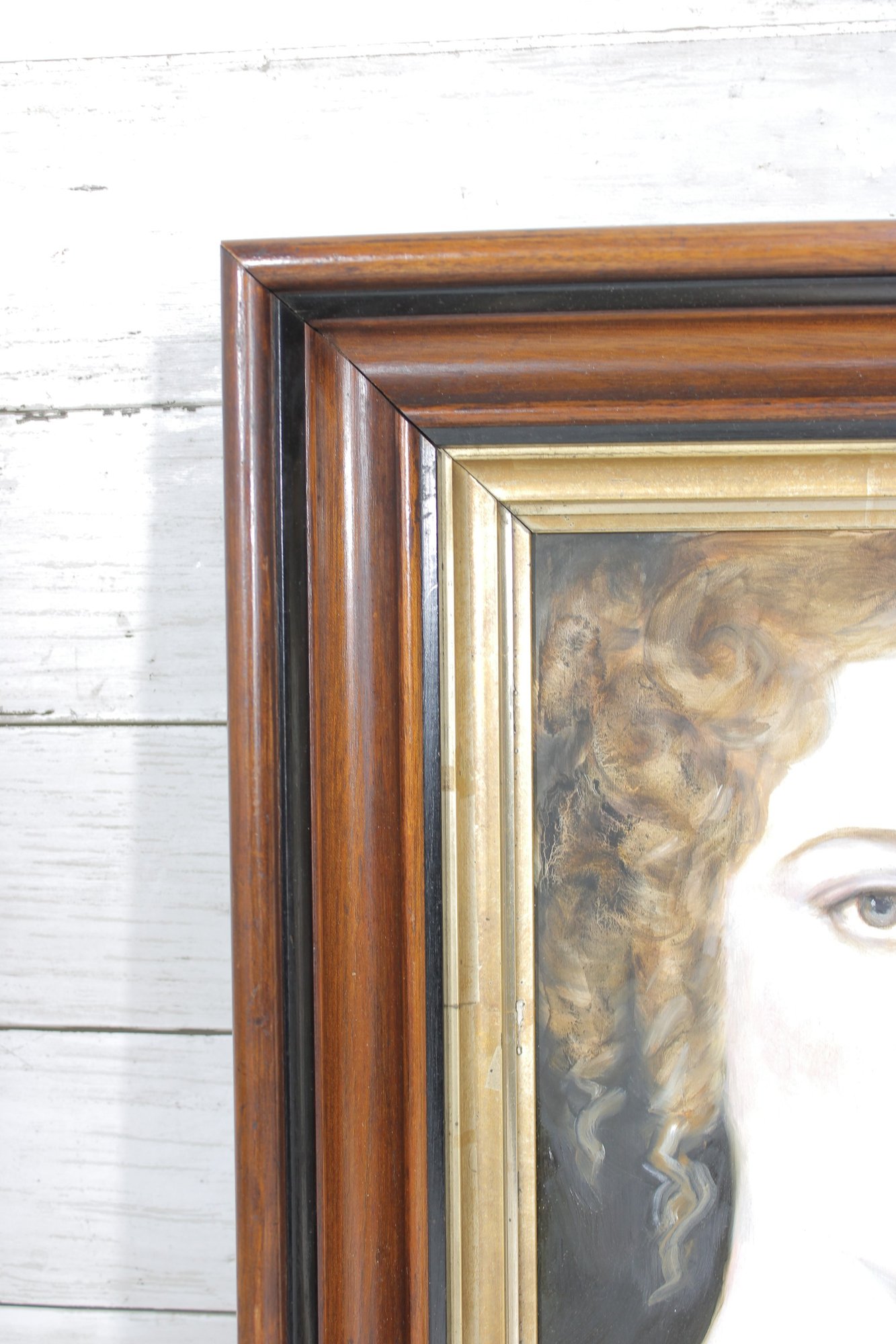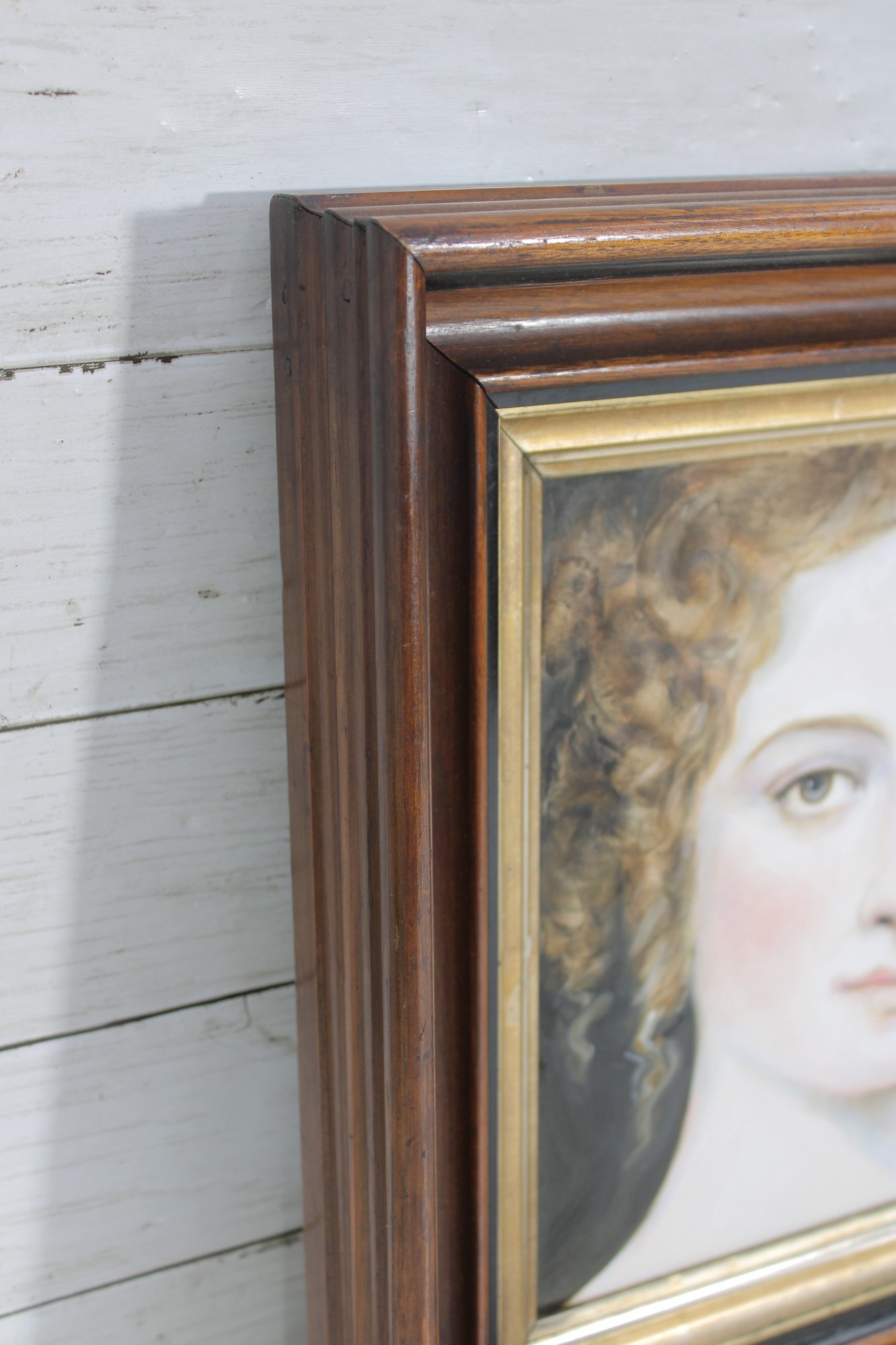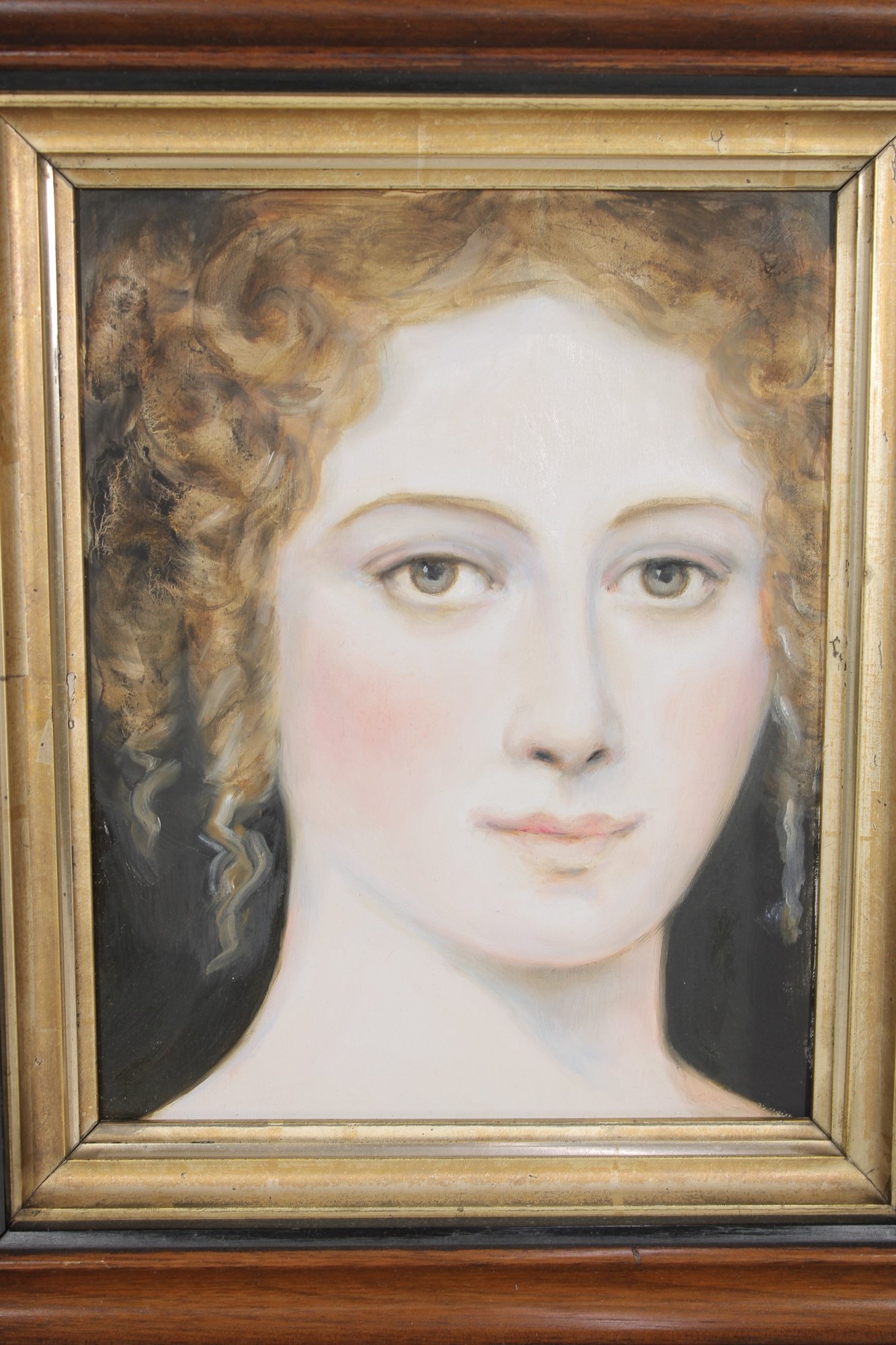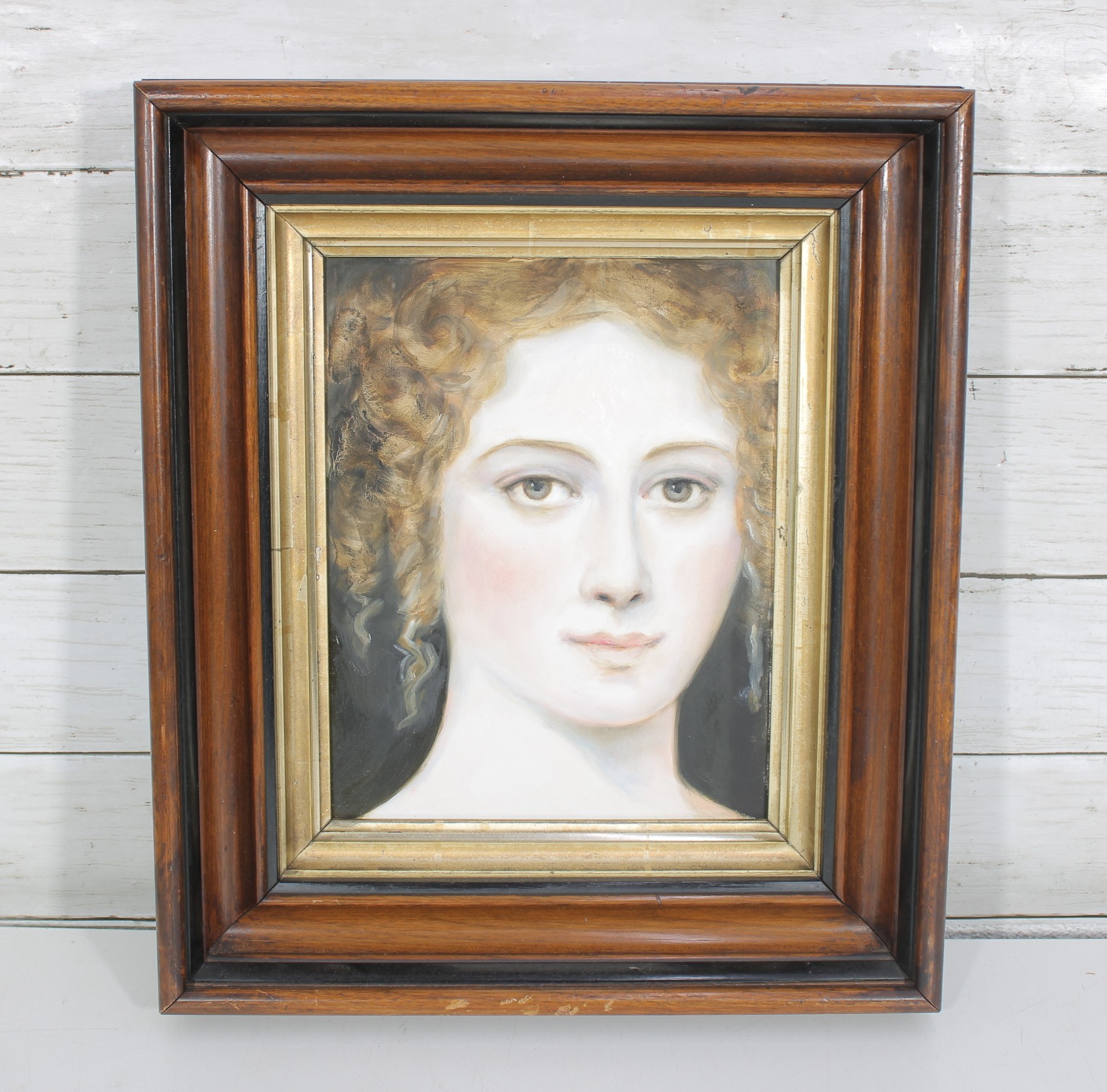 Beautiful original portrait painting on board, signed Susan Act Carson (2021). This finely executed piece depicts a serene female subject with soft features, delicate expression, and classical styling.
