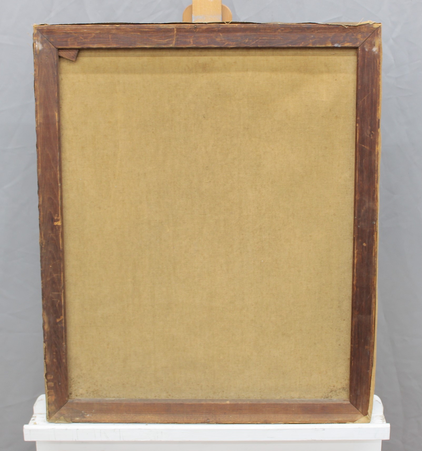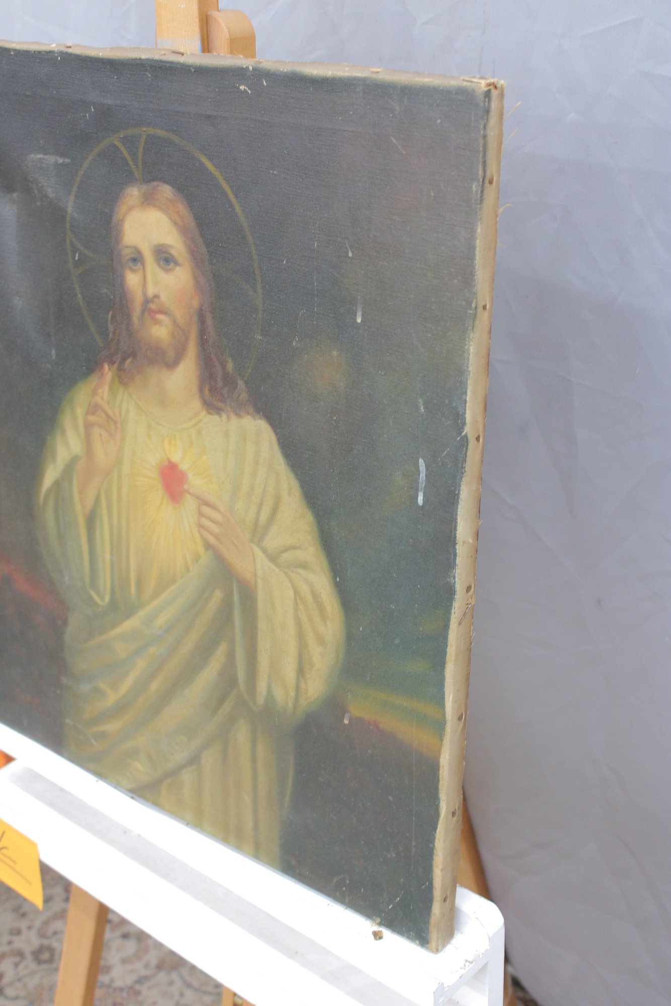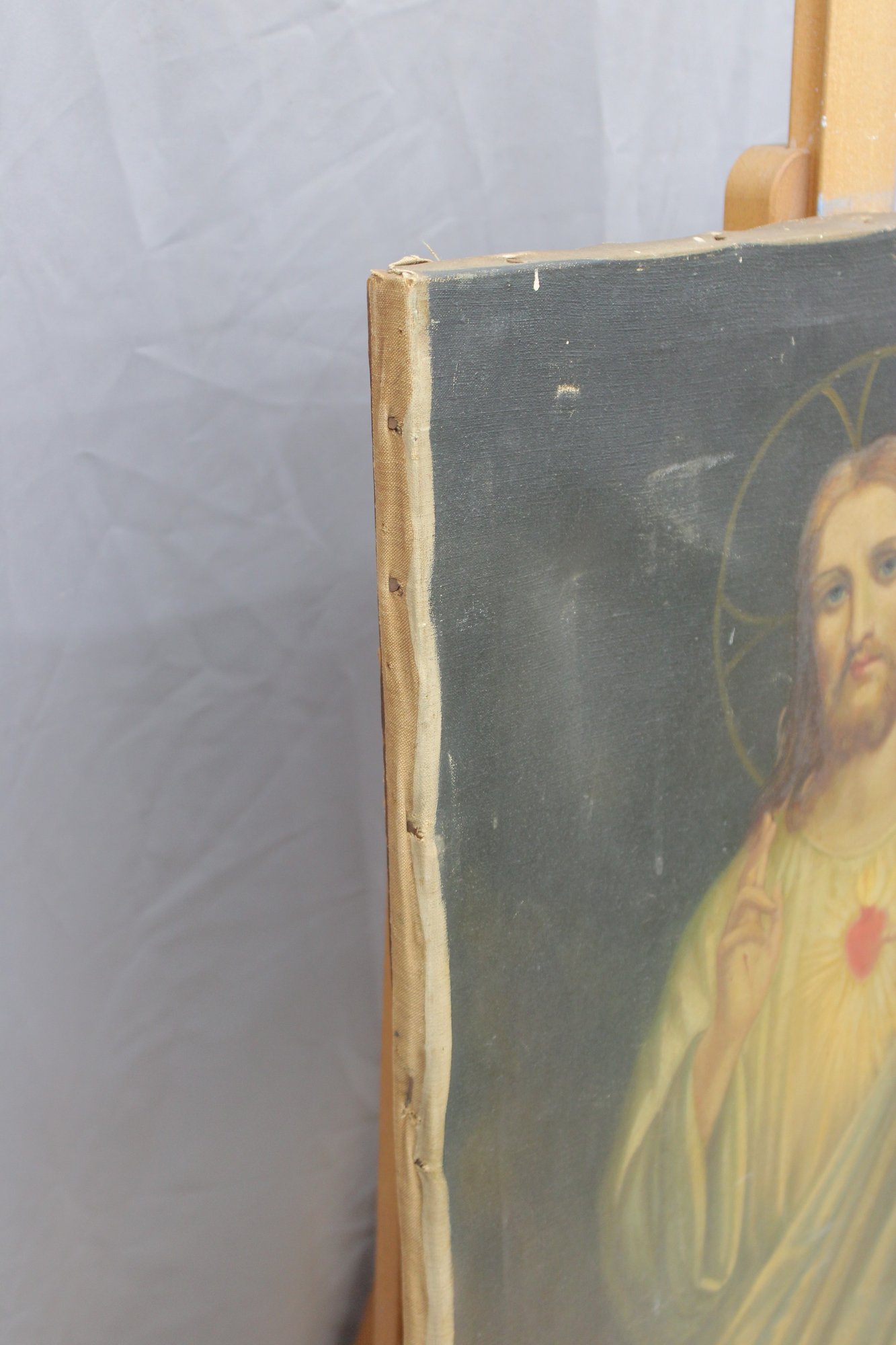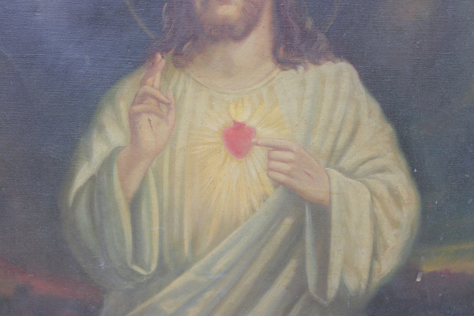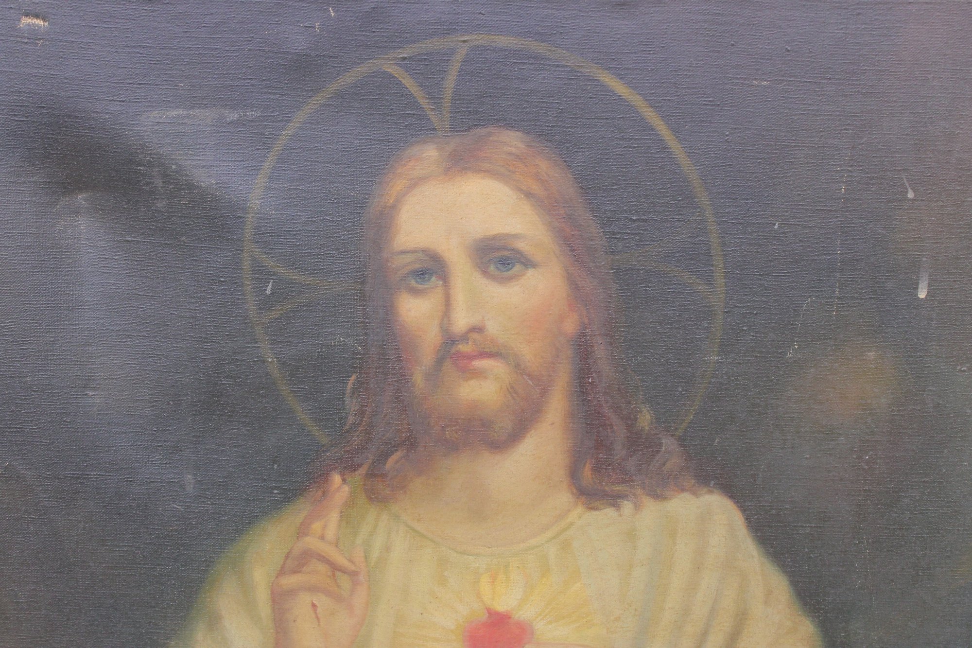 The canvas shows visible age-related wear along the edges and surface, consistent with devotional artworks of this type and period, contributing to its authentic character.