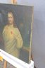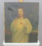 signed oil on canvas depicts a traditional devotional image of Christ with the Sacred Heart, rendered in a classical religious style. Christ is shown frontally with a serene expression, one hand raised in blessing while the other gestures toward the radiant Sacred Heart, symbolizing compassion, sacrifice, and divine love. A softly painted halo and atmospheric background enhance the spiritual presence of the composition.
