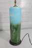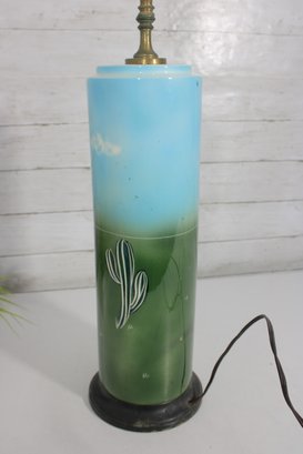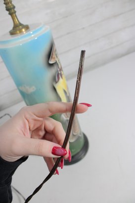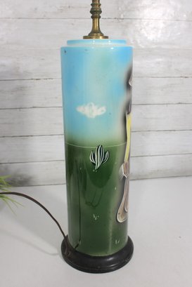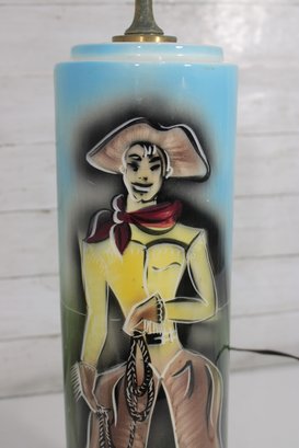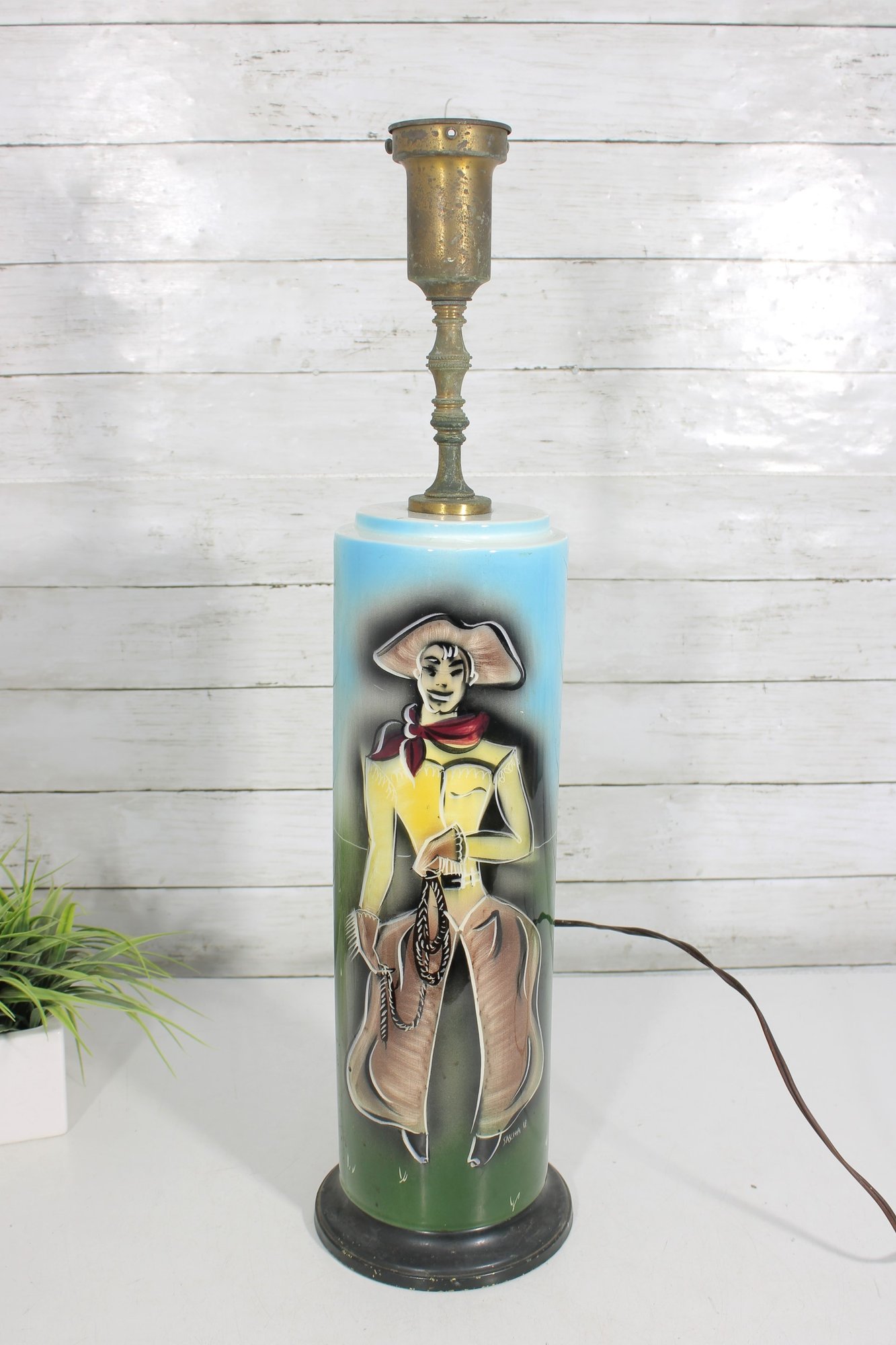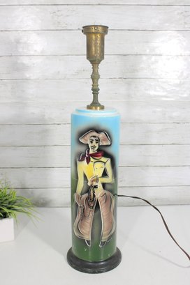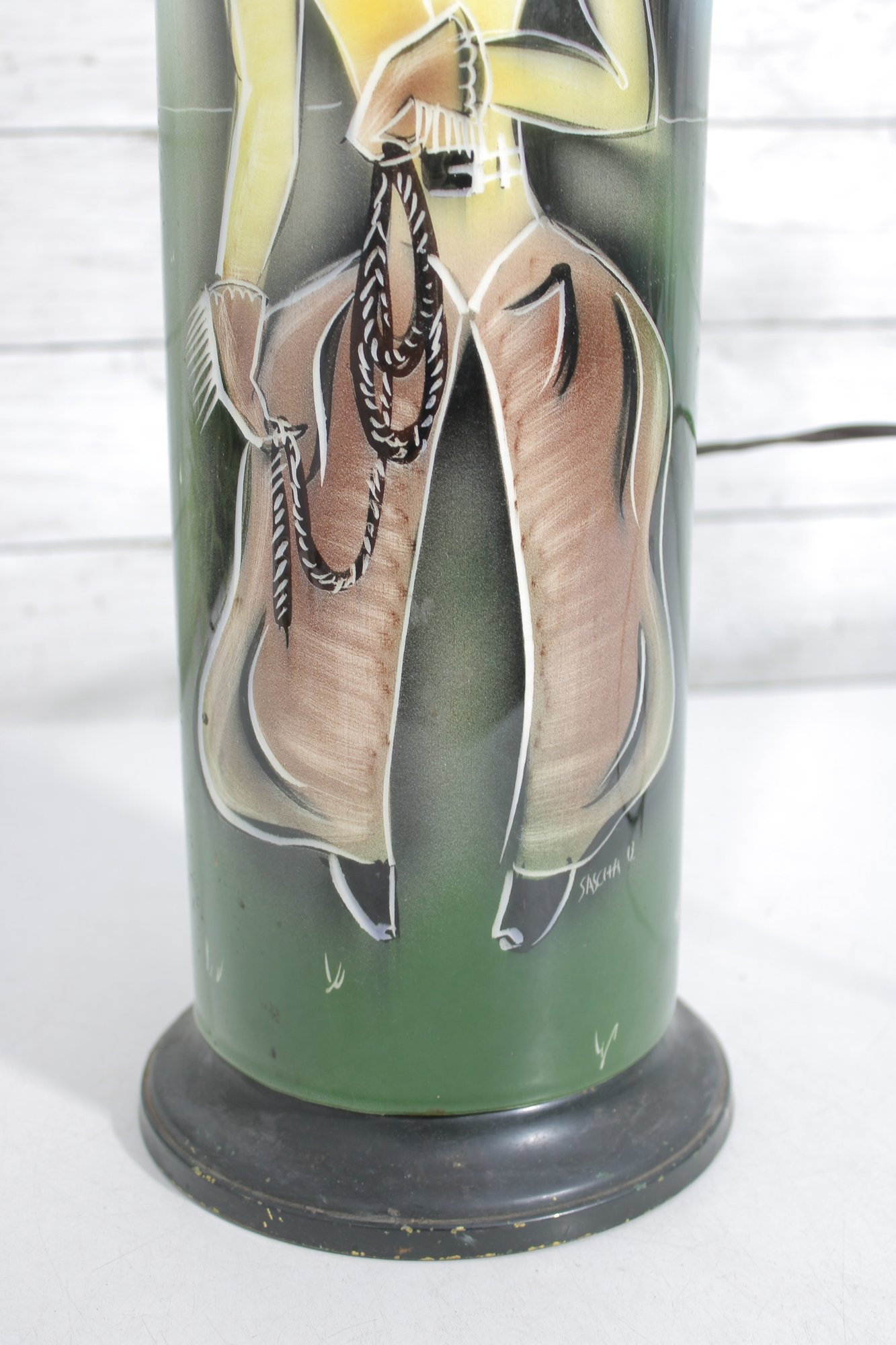 Striking signed Sascha Brastoff table lamp featuring a beautifully hand-painted figural design in classic mid-century modern style. This tall lamp measures approximately 26 inches and showcases Brastoff’s distinctive artistic flair, with a stylized figure in western attire set against a vibrant gradient background.
