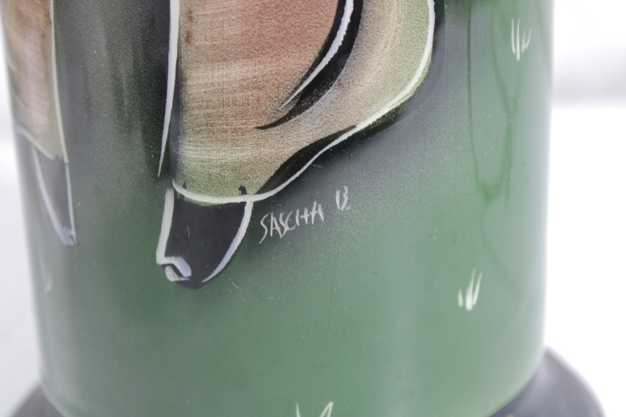 The ceramic body displays wonderful color transitions from green to blue, with detailed linework and a bold, expressive figure. The piece is signed “Sascha B” near the lower portion, confirming its authenticity.