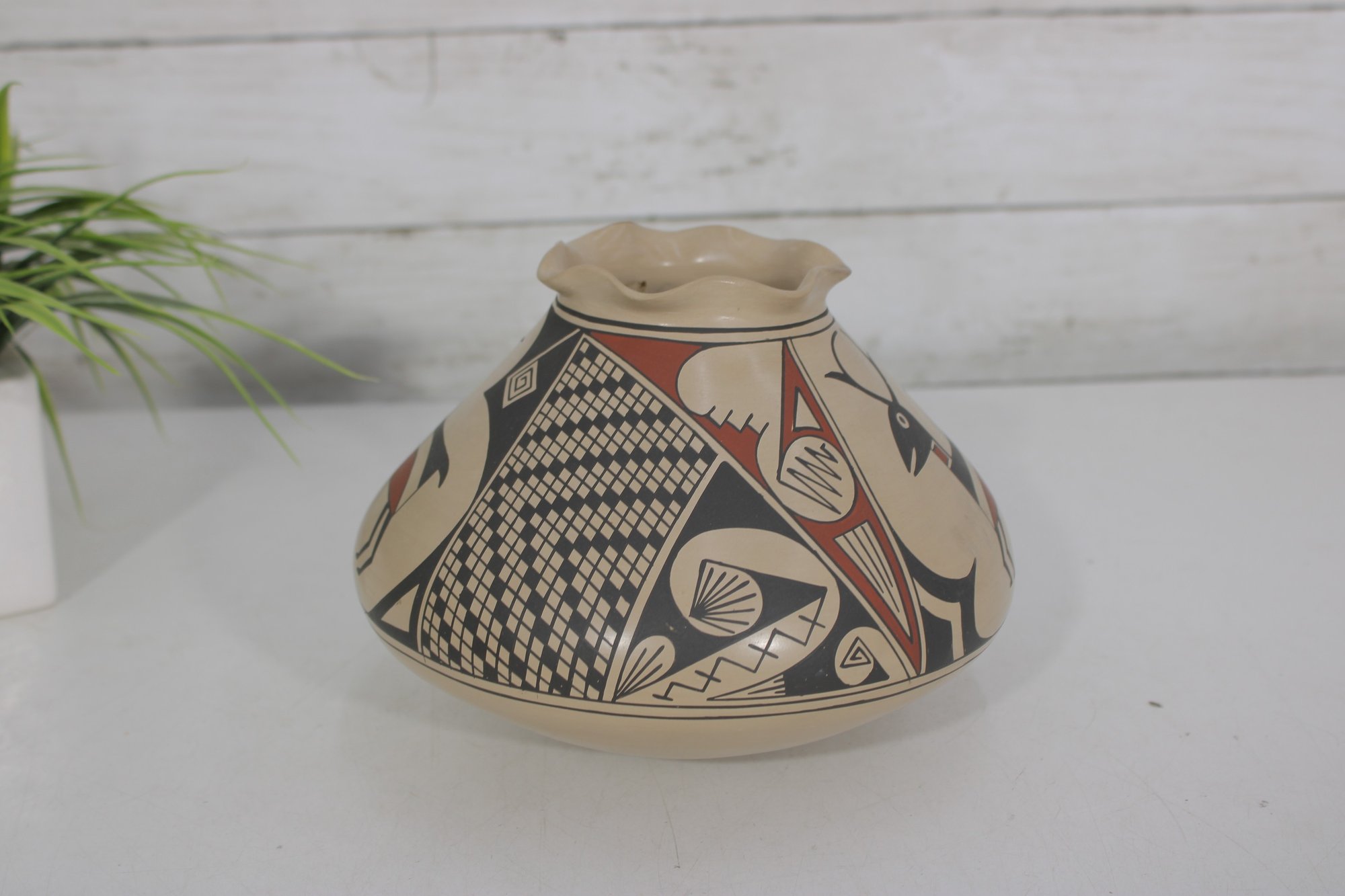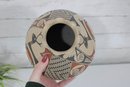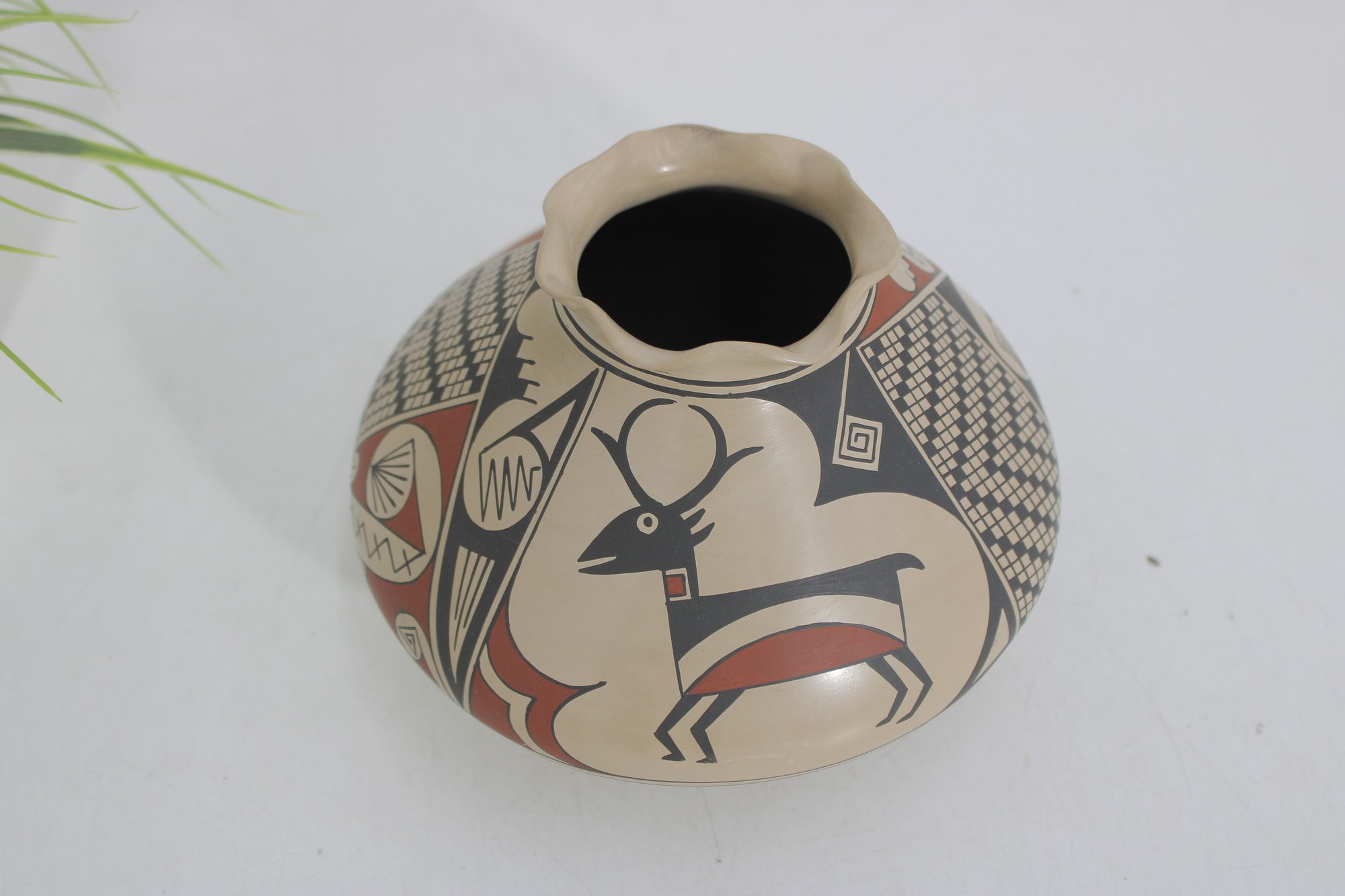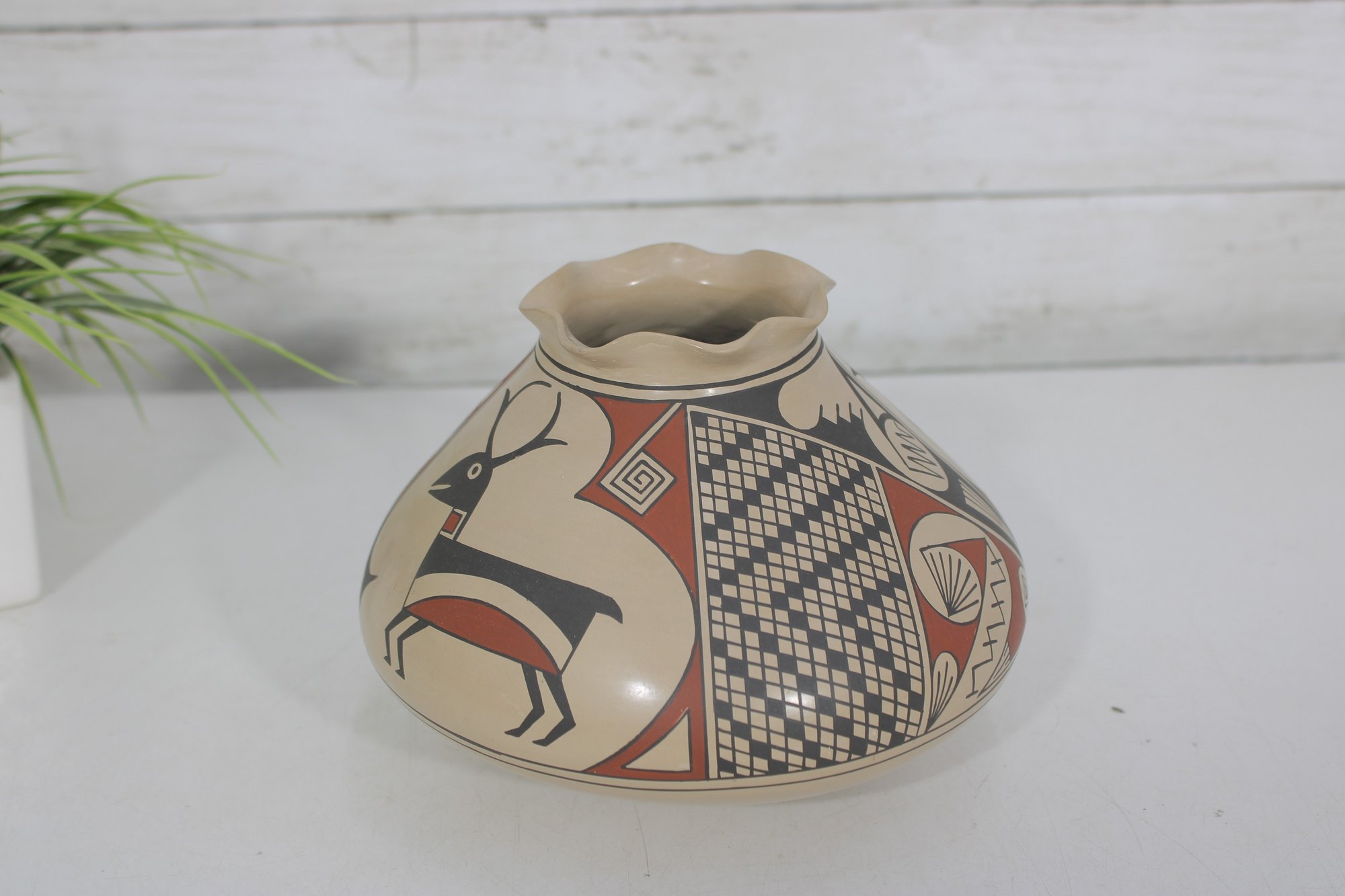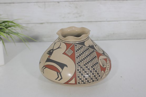 The vase has a distinctive low, wide, rounded form with a gently flared neck. It is decorated with hand-painted designs including a stylized deer figure along with intricate geometric and patterned elements in black and rust tones against a natural clay background. The artwork reflects classic Southwestern design influences.