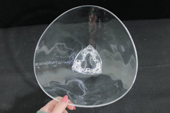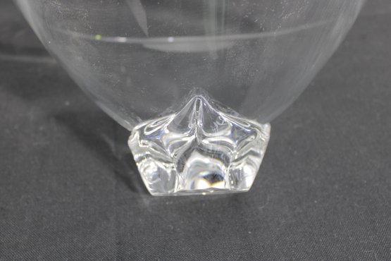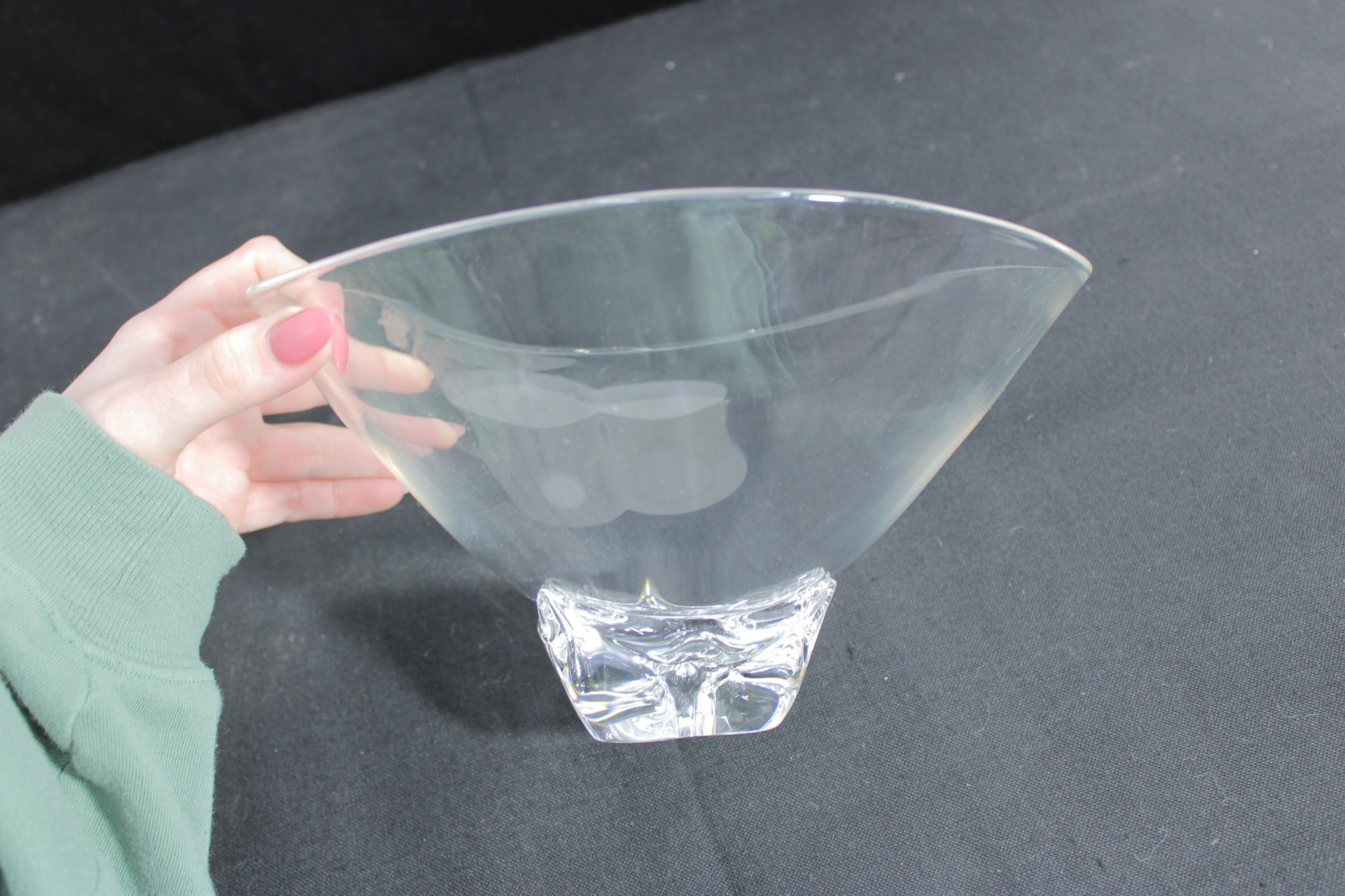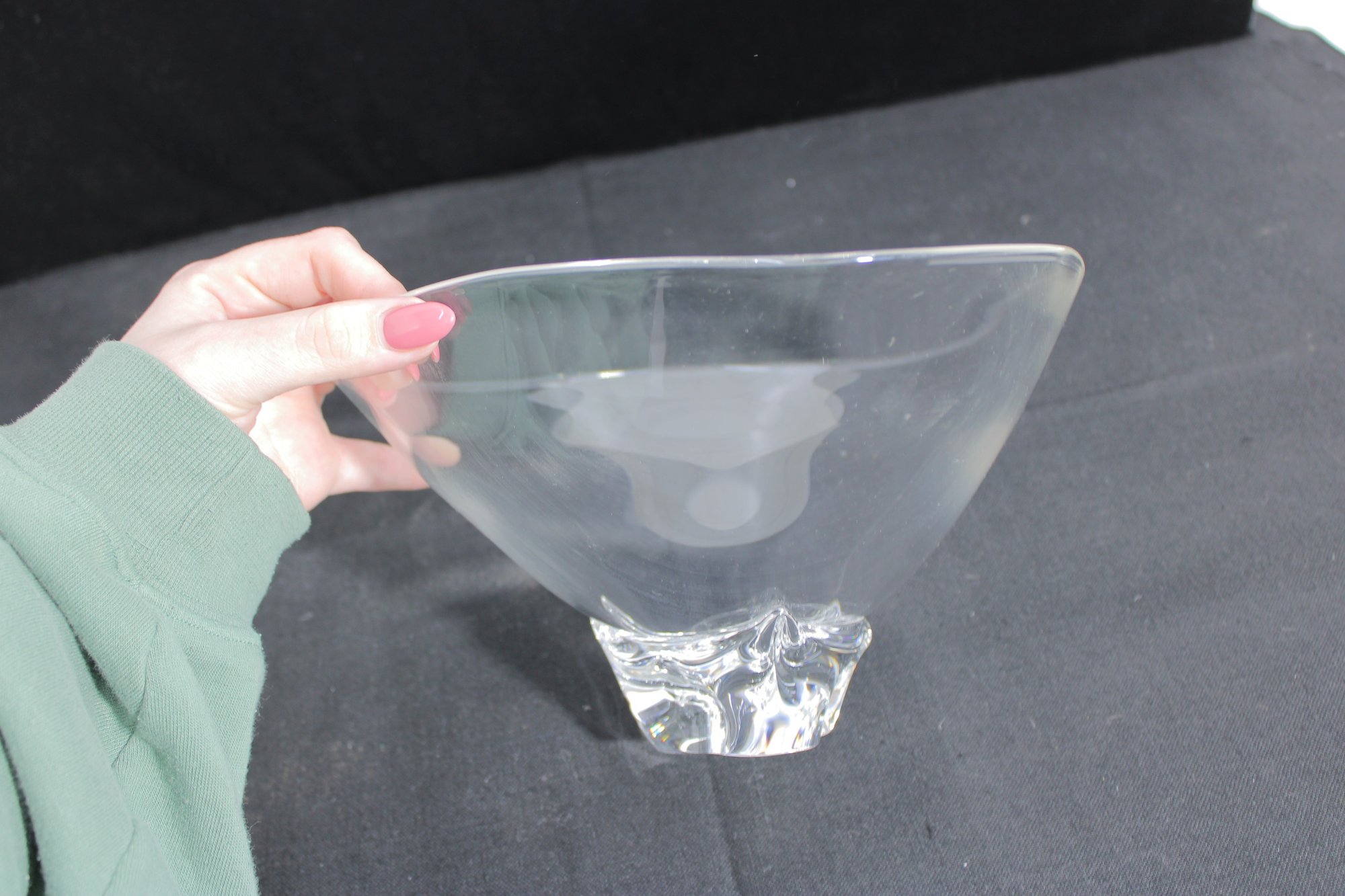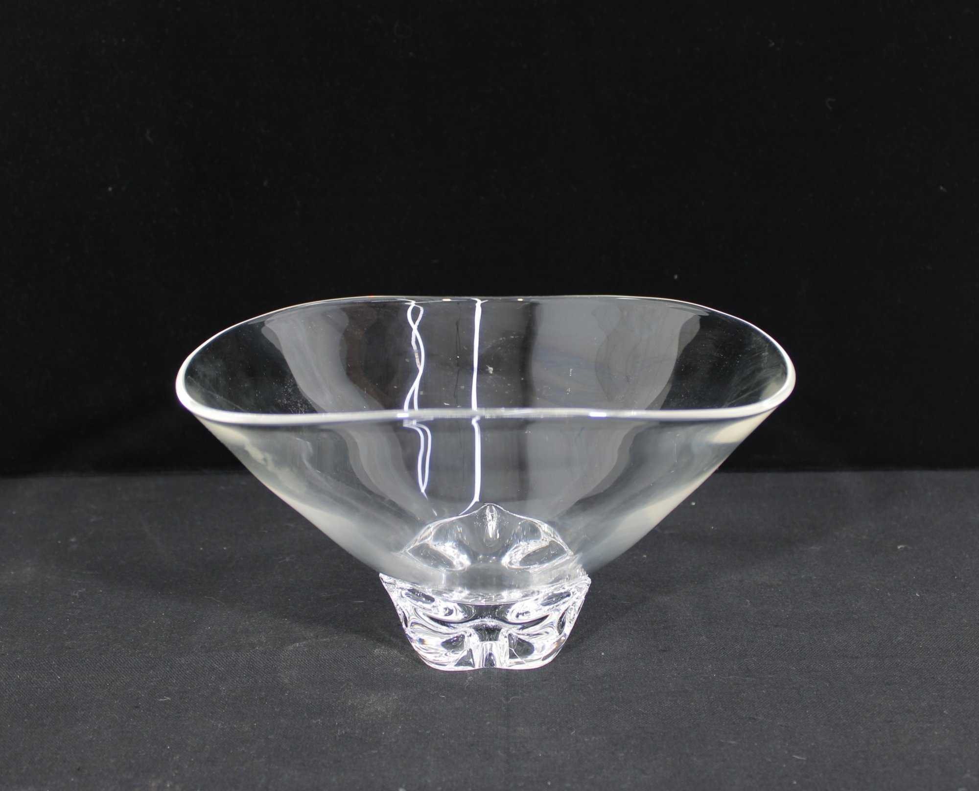 vintage Steuben crystal “Trillium” bowl designed by Donald Pollard, showcasing the brand’s signature artistry and craftsmanship. This sculptural piece features a softly flared, organic form reminiscent of a blooming flower, supported by a distinctive three-lobed base.