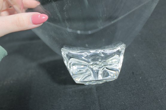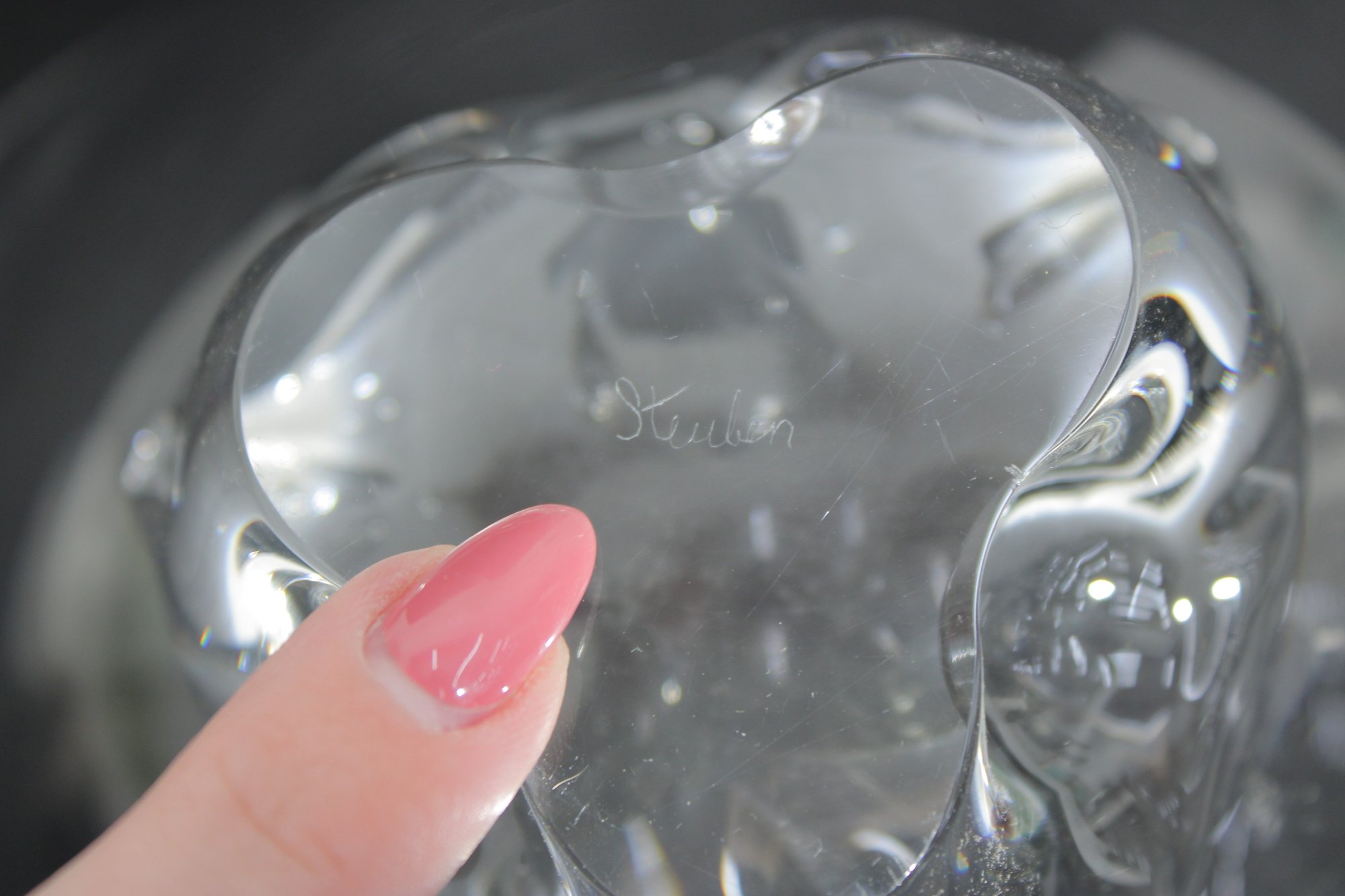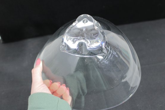 Crafted from high-quality clear crystal, the bowl displays exceptional clarity and light refraction. The underside is signed “Steuben,” confirming authenticity. Its minimalist yet artistic design makes it a standout decorative centerpiece or collectible piece of American art glass.