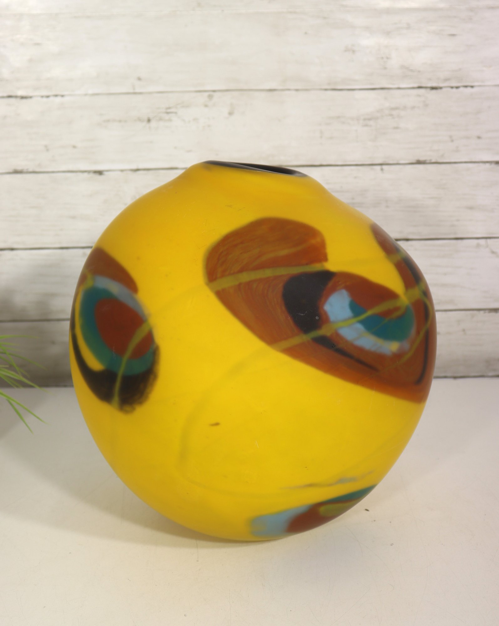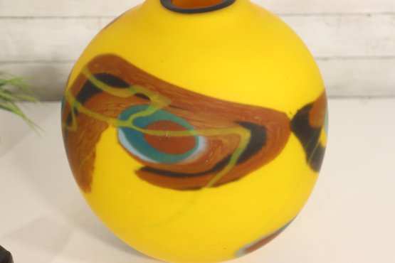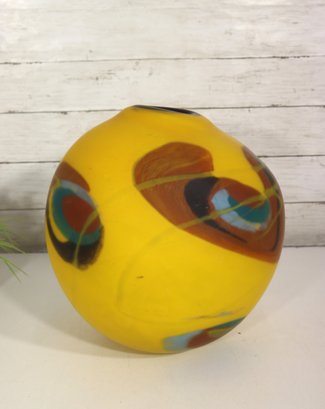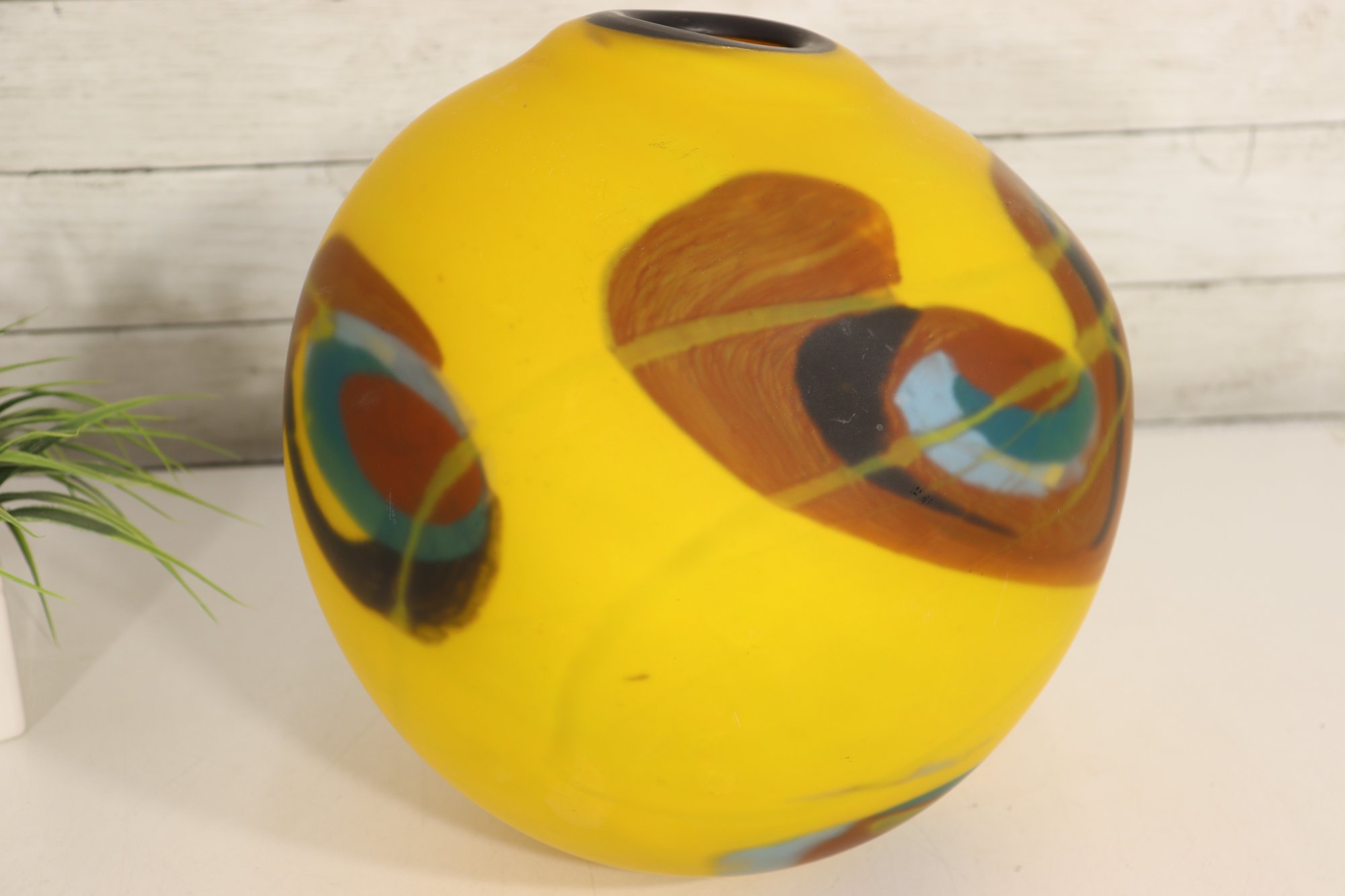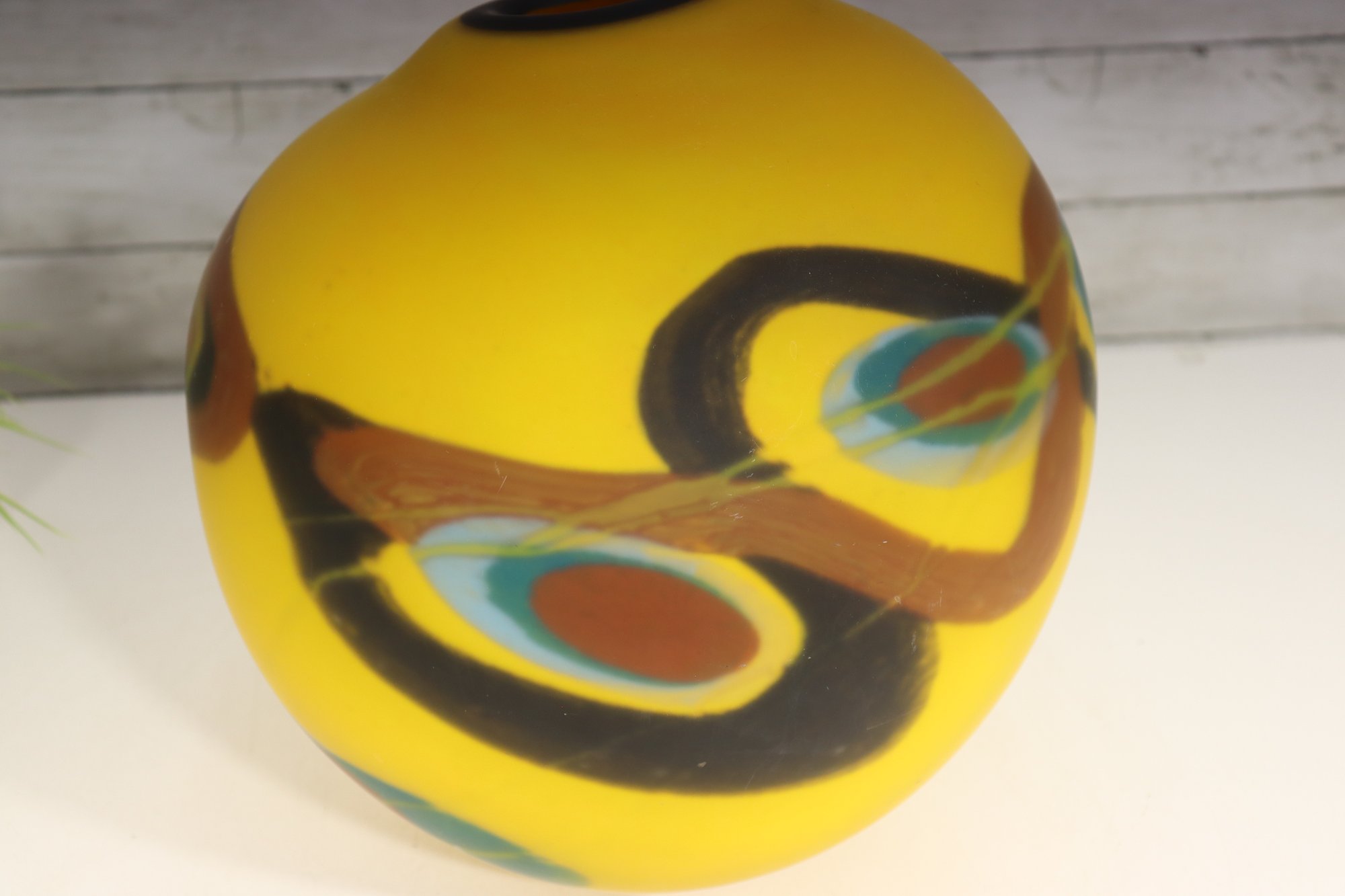 Stunning signed studio art glass vase featuring a bold bright yellow body with abstract hand-applied multi-color design elements throughout. This piece has a strong modernist / contemporary art glass look with rich color movement, great form, and artistic presence.