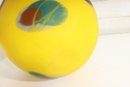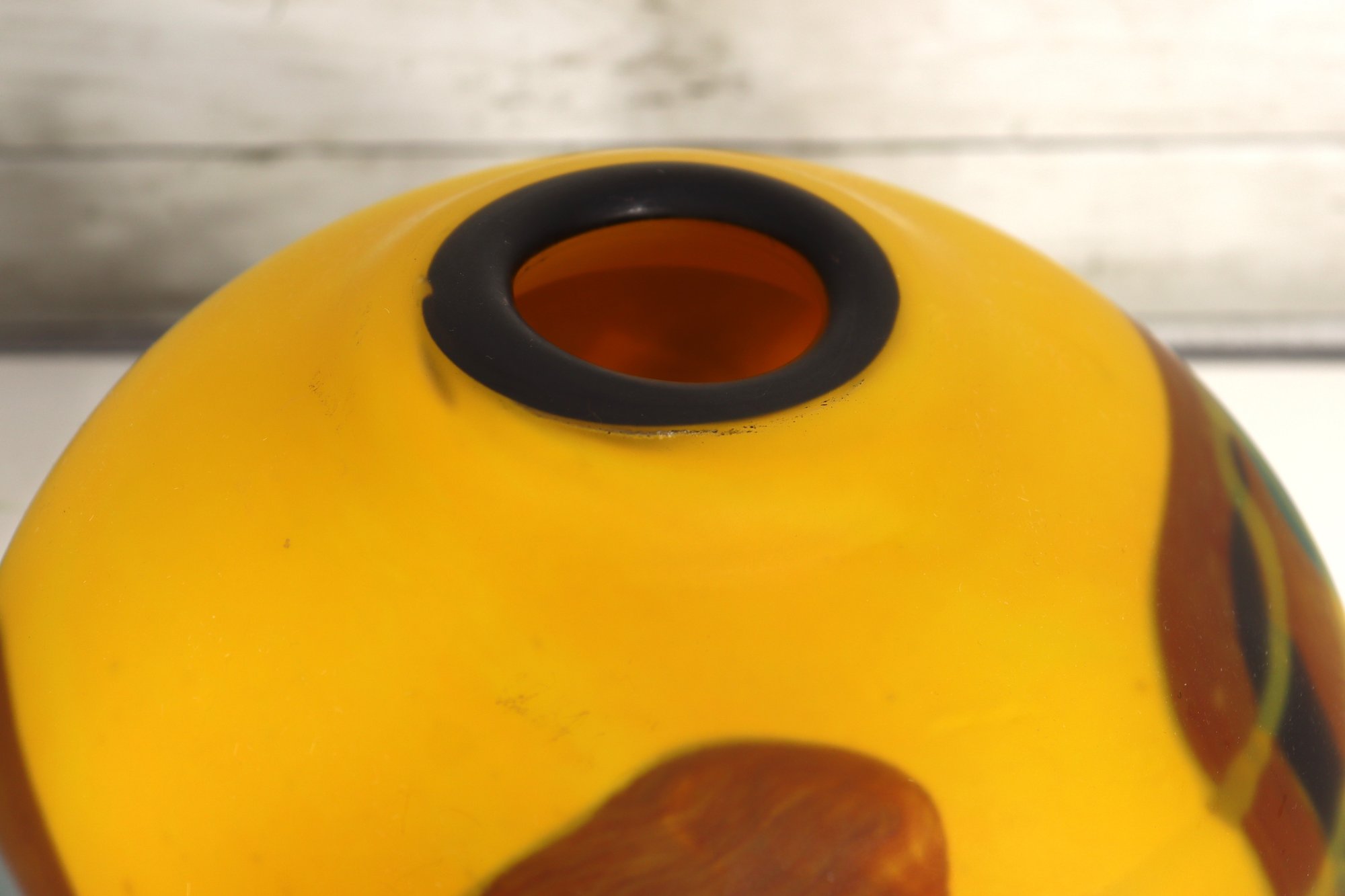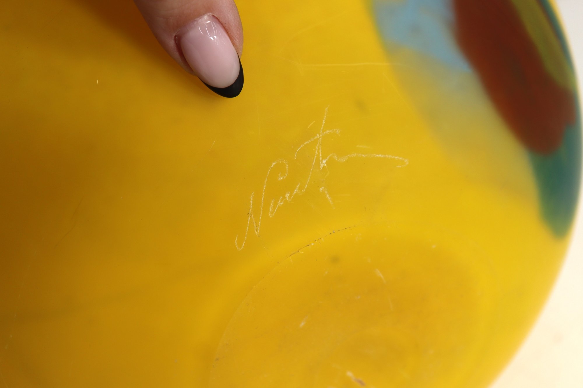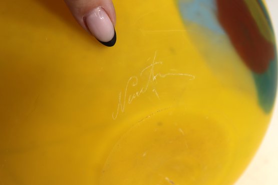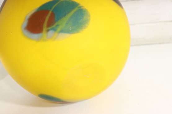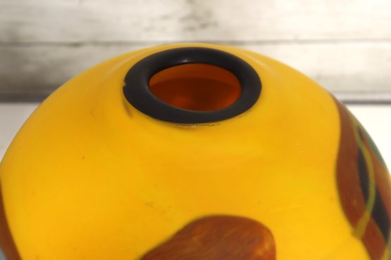 Stunning signed studio art glass vase featuring a bold bright yellow body with abstract hand-applied multi-color design elements throughout. This piece has a strong modernist / contemporary art glass look with rich color movement, great form, and artistic presence.