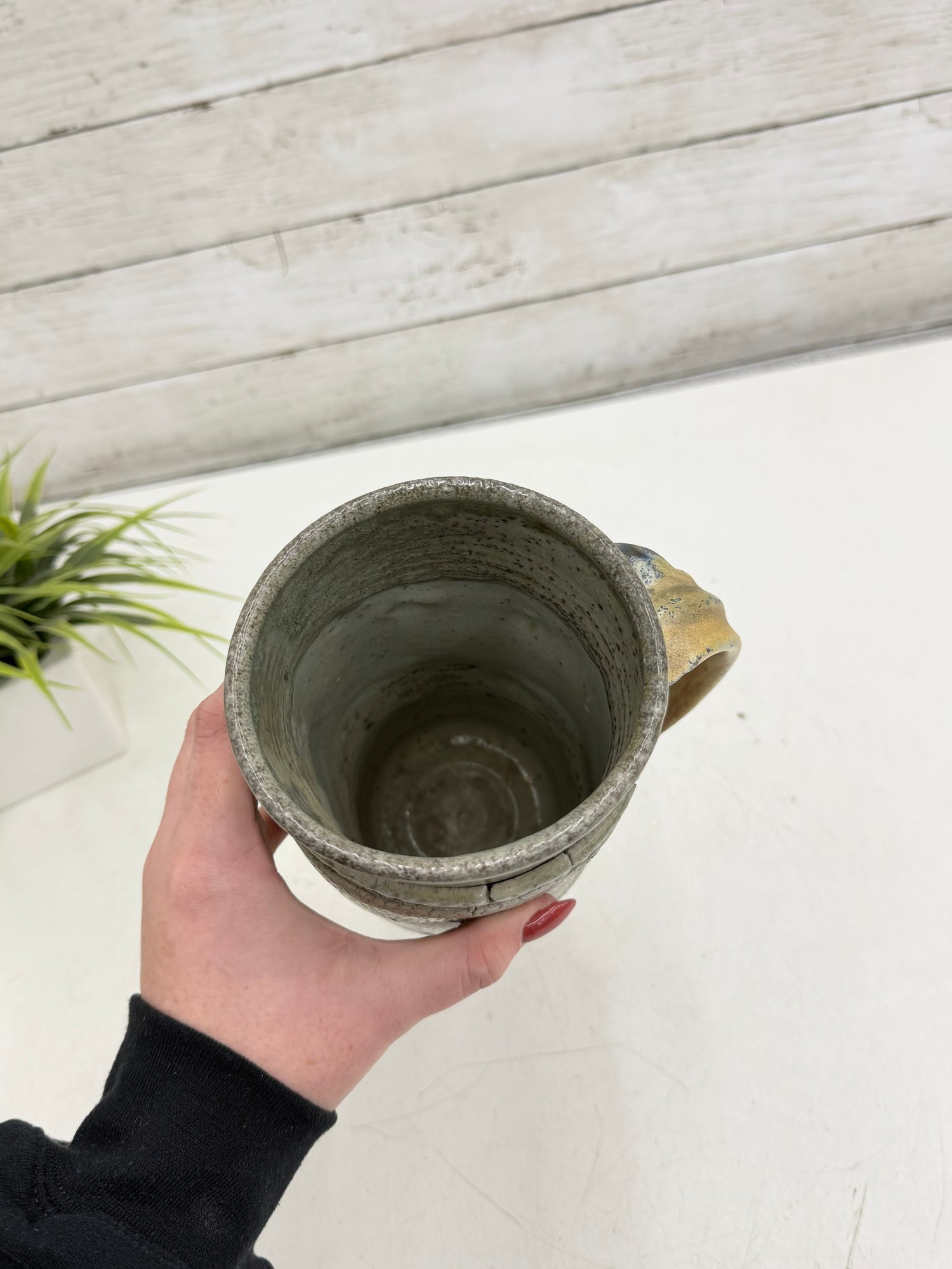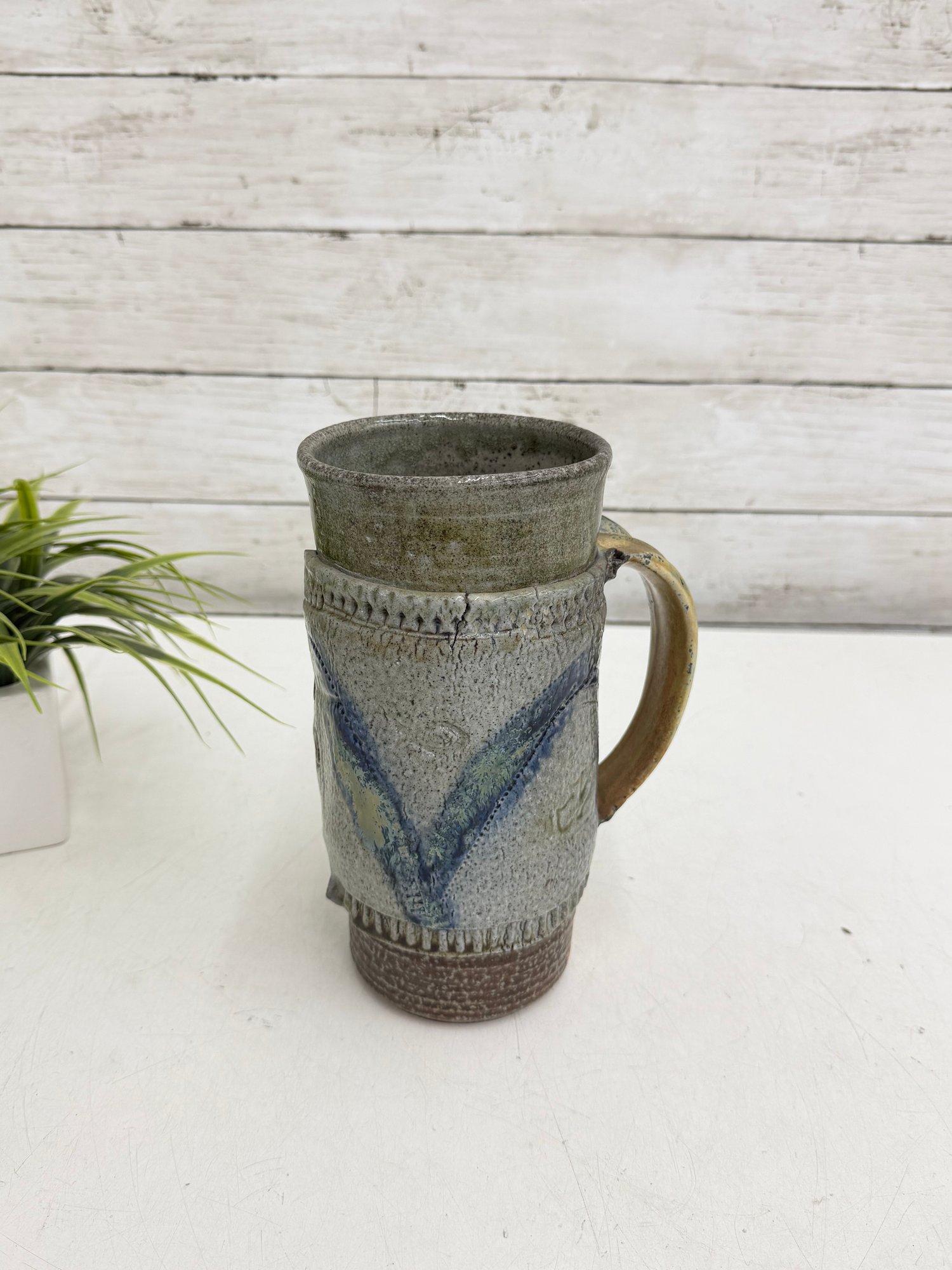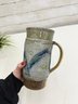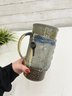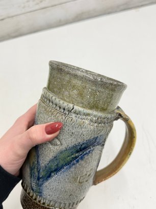Signed studio pottery tankard is hand-thrown from stoneware and features a beautifully textured surface with a flowing blue slip-decorated design. The tall form is accented by a substantial pulled handle, giving the piece both visual balance and functional presence.