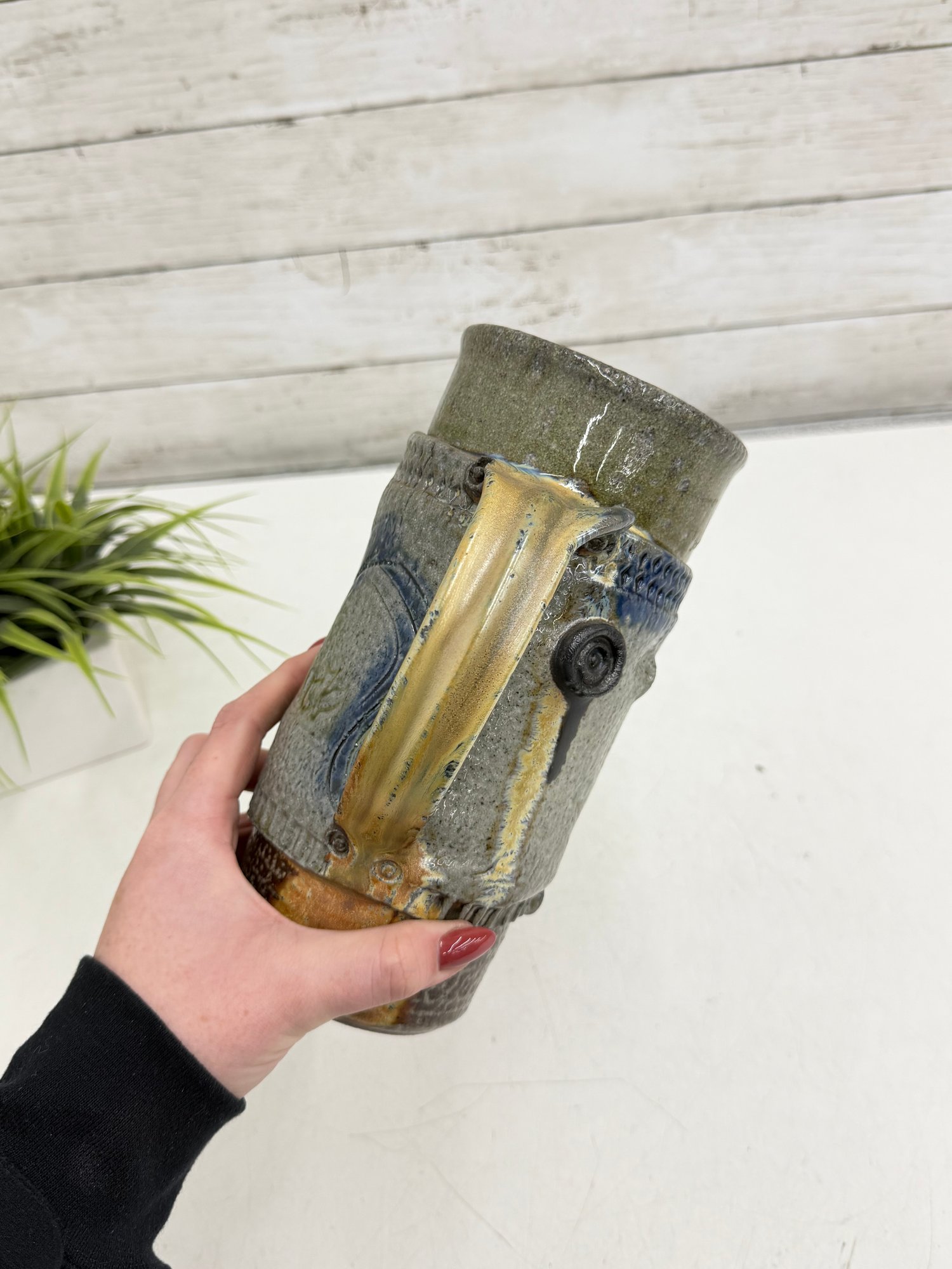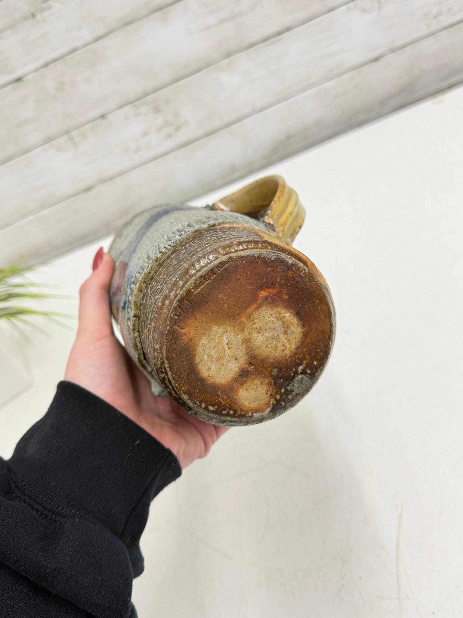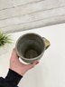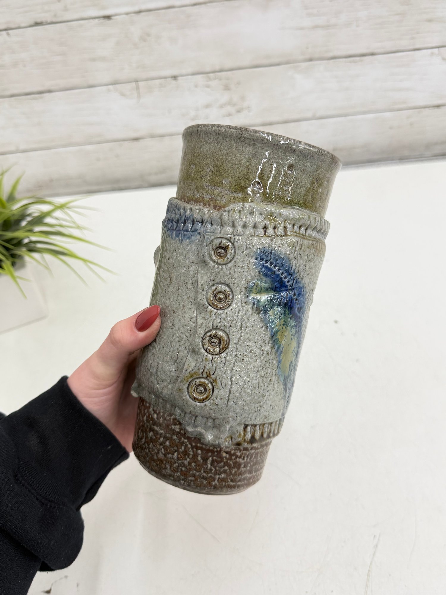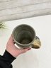 Natural glaze tones of gray, cream, and earthy brown combine with the expressive blue motif, while visible throwing lines and textured details highlight the artisan craftsmanship. The base is artist signed, confirming its studio origin.
