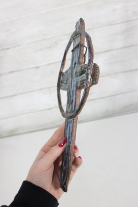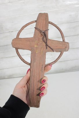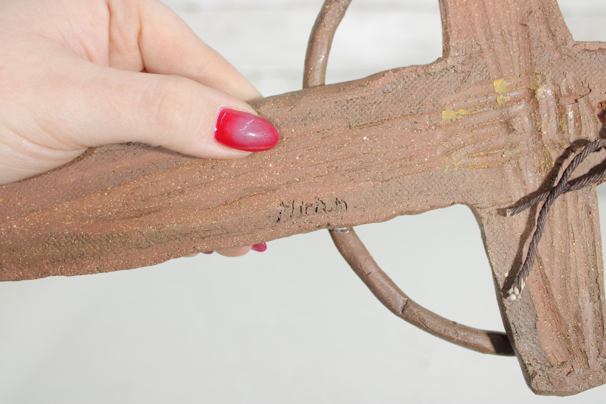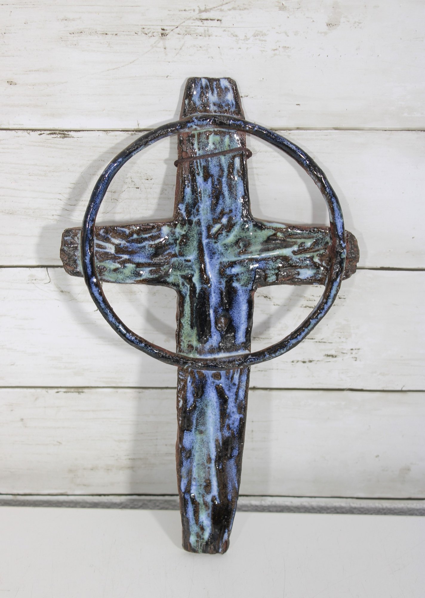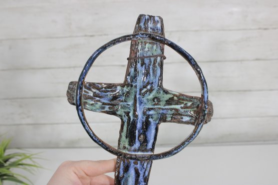 Striking handcrafted studio pottery wall cross featuring a classic Celtic-inspired ring design. This unique piece combines rustic ceramic craftsmanship with a sculptural metal ring element, creating a bold and meaningful decorative statement.