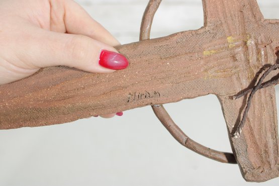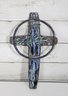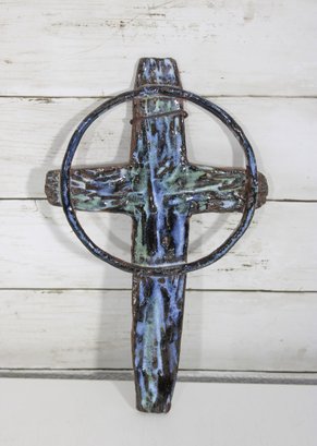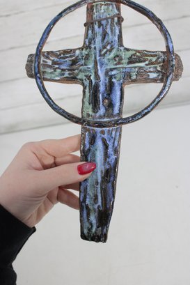 The cross is finished in rich, textured glazes with flowing tones of blue, green, and earthy browns, giving it depth and visual interest. The back is signed by the artist (appears to read “Hirsch”), adding to its collectible appeal.