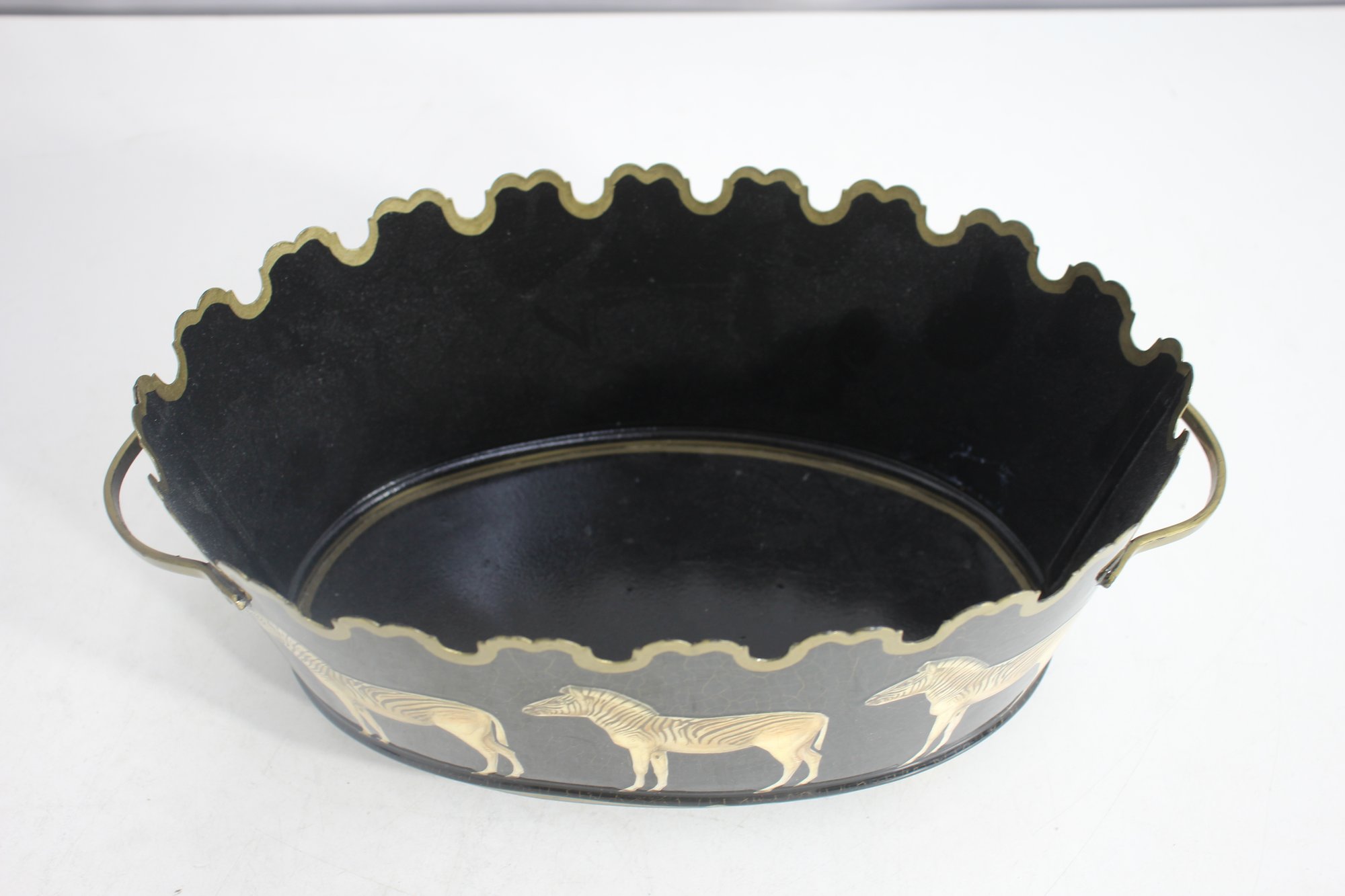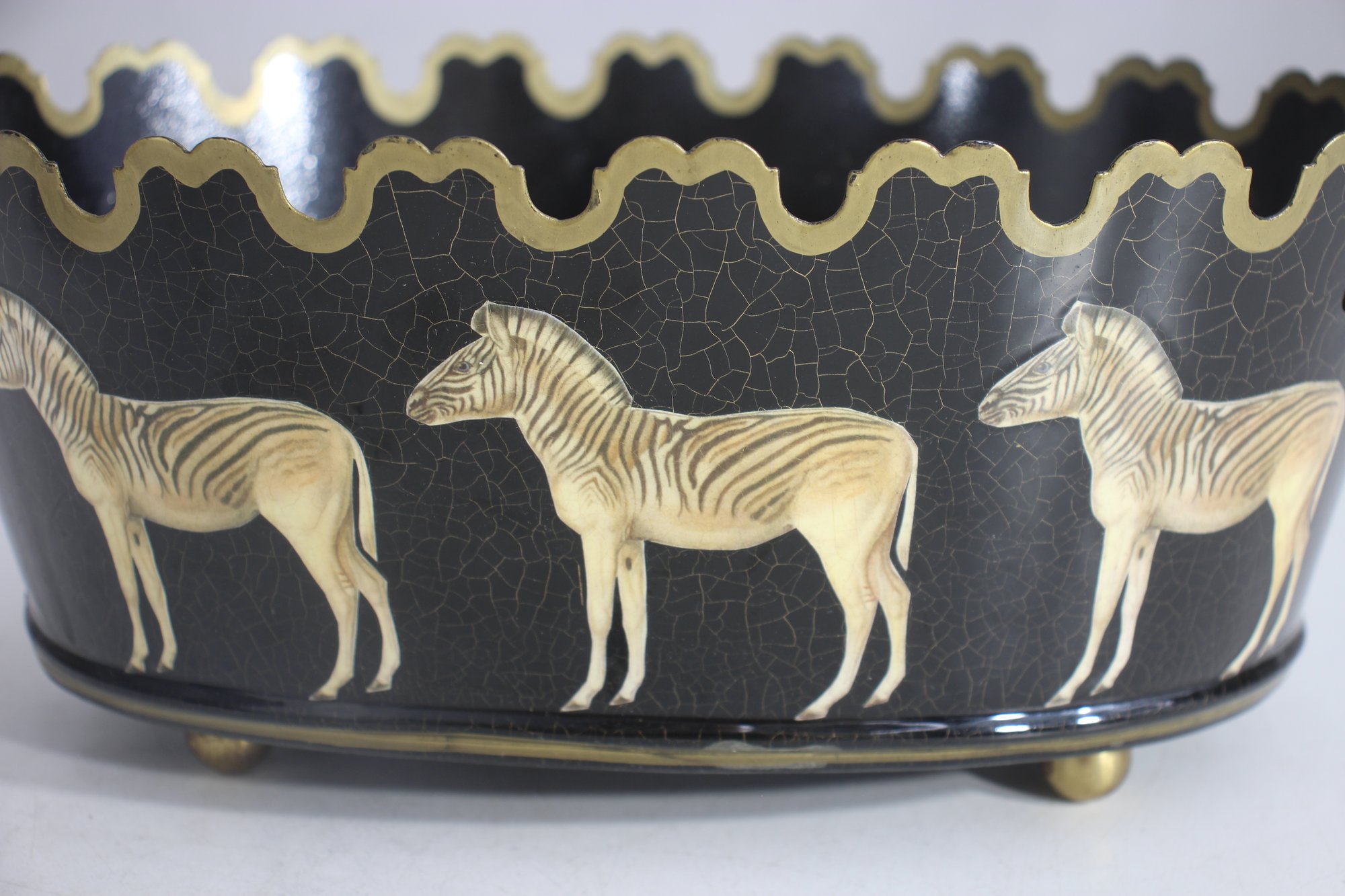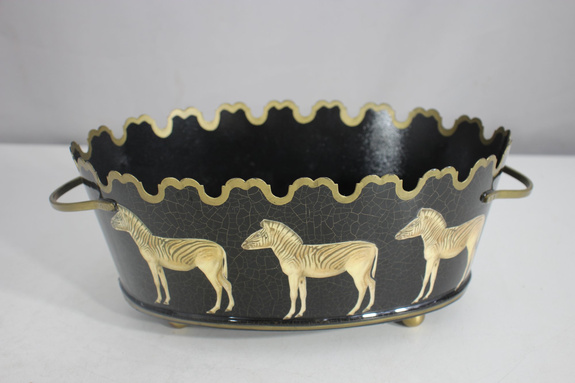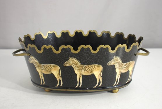 This stunning hand-painted metal planter by Tennille features an elegant zebra motif against a rich black crackle-textured background, accented with gold detailing. The scalloped rim and curved brass handles give it a sophisticated and decorative appeal, making it a perfect accent piece for any space.