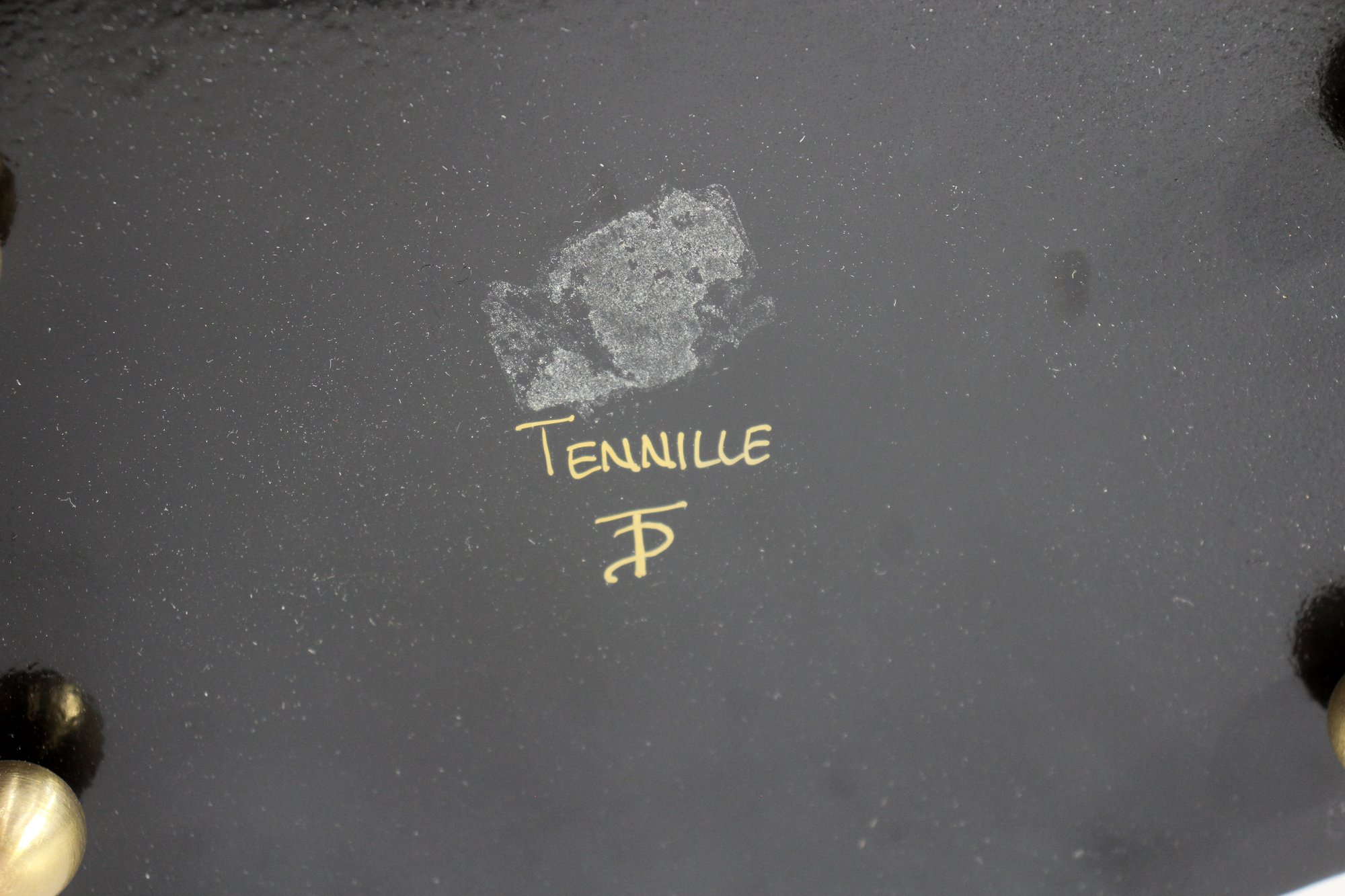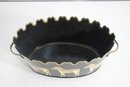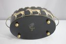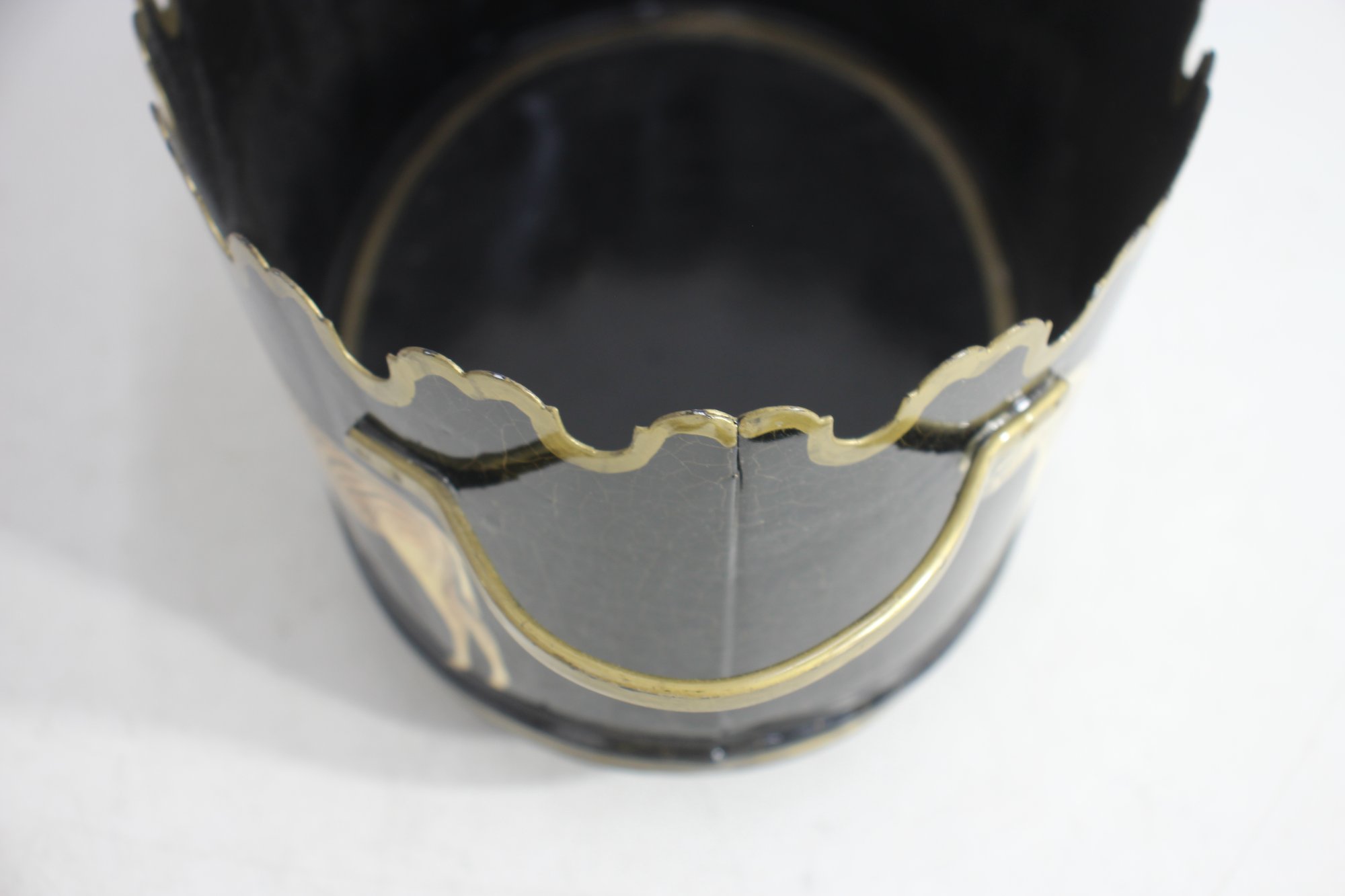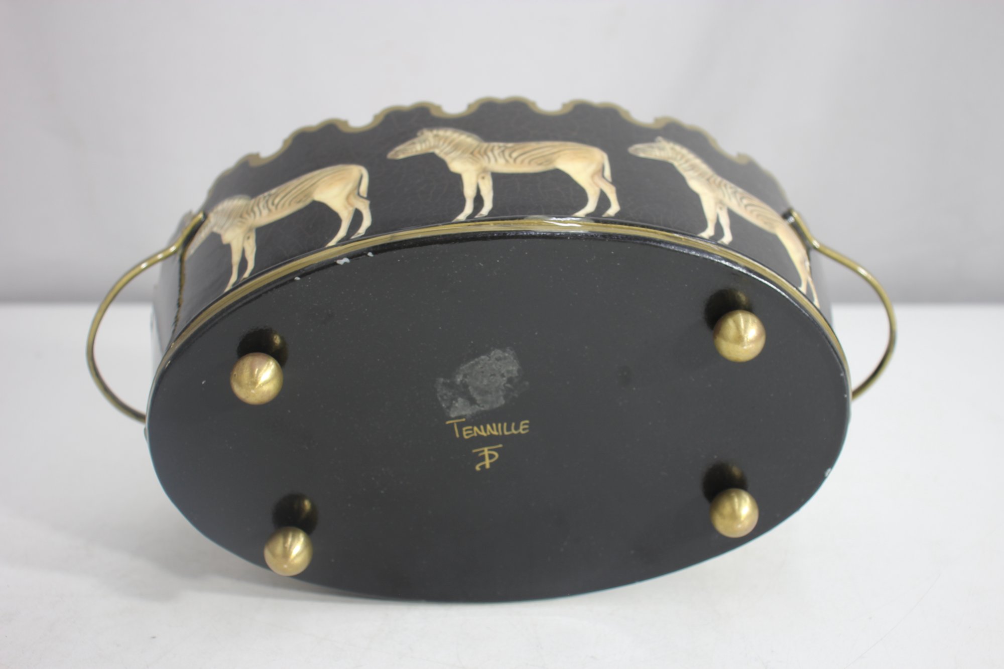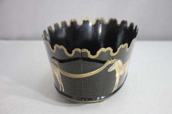 This stunning hand-painted metal planter by Tennille features an elegant zebra motif against a rich black crackle-textured background, accented with gold detailing. The scalloped rim and curved brass handles give it a sophisticated and decorative appeal, making it a perfect accent piece for any space.