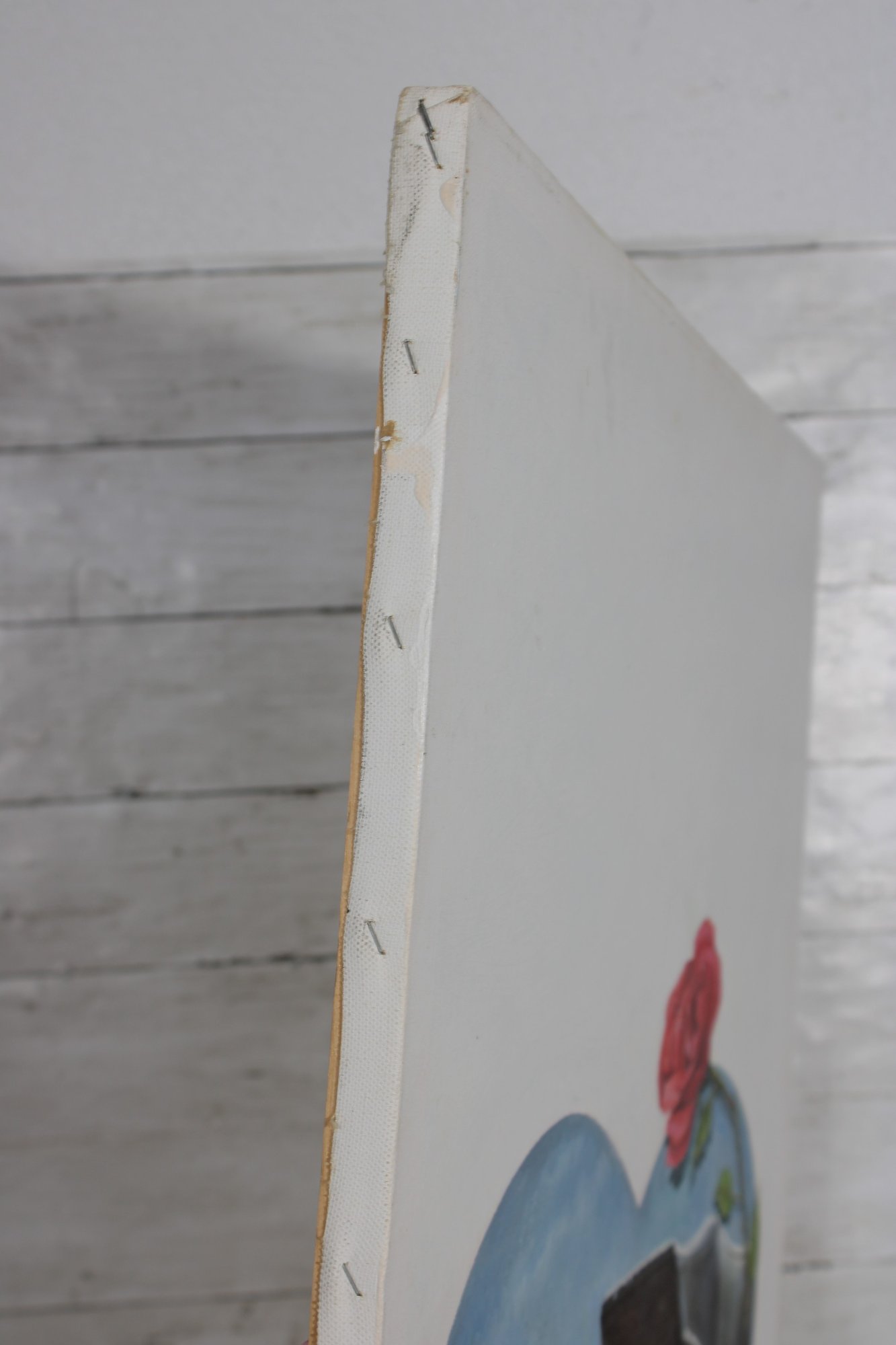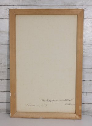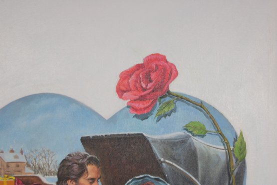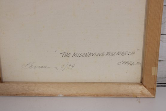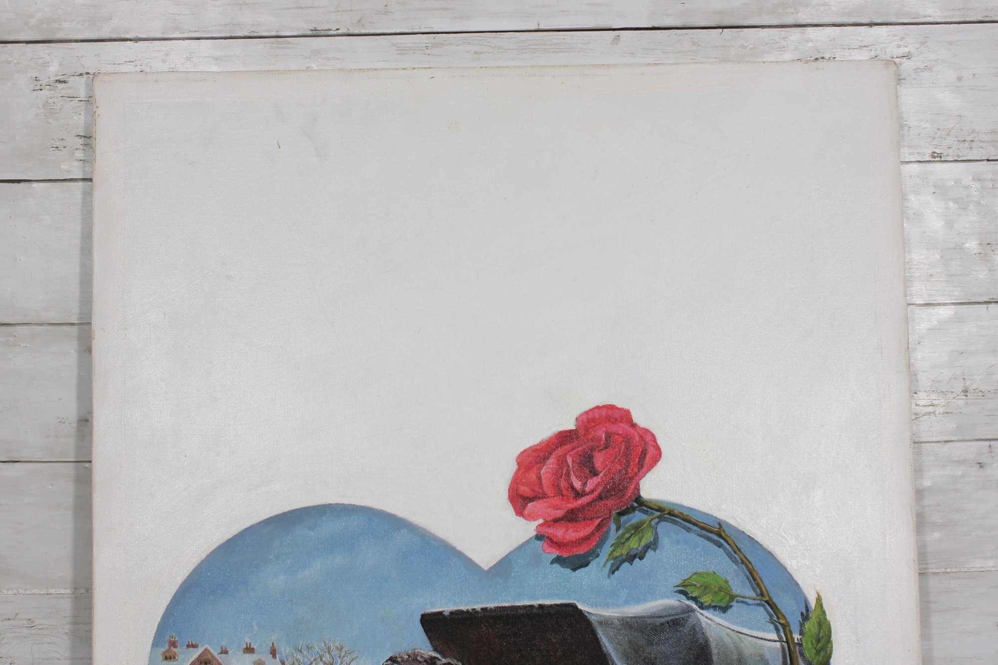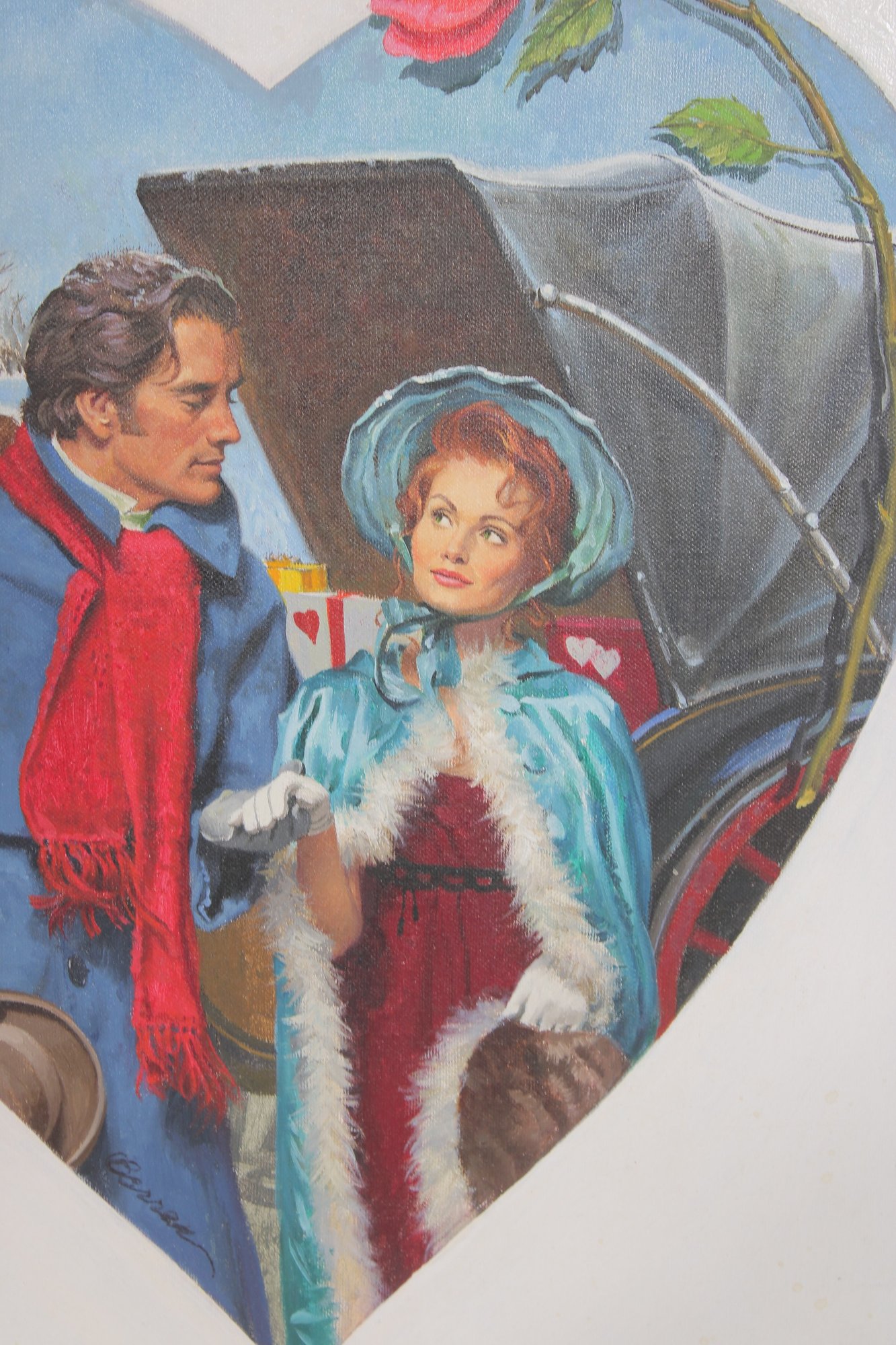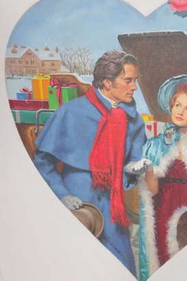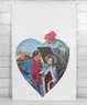 Charming signed artwork titled “The Mischievous Miscreants,” featuring a romantic heart-shaped composition depicting a Victorian-era couple beside a carriage beneath a blooming rose. The colorful imagery blends narrative charm with whimsical design, framed by a clean white border that highlights the central scene.