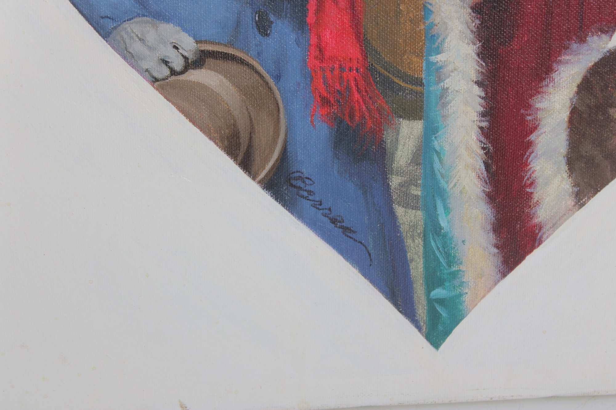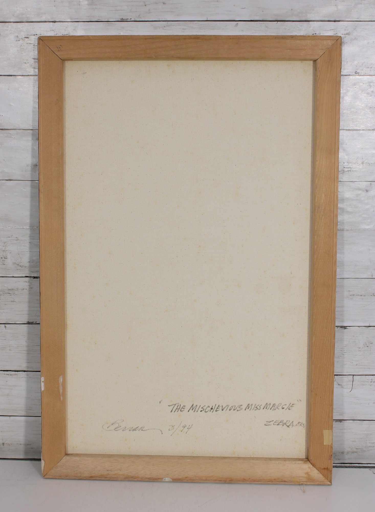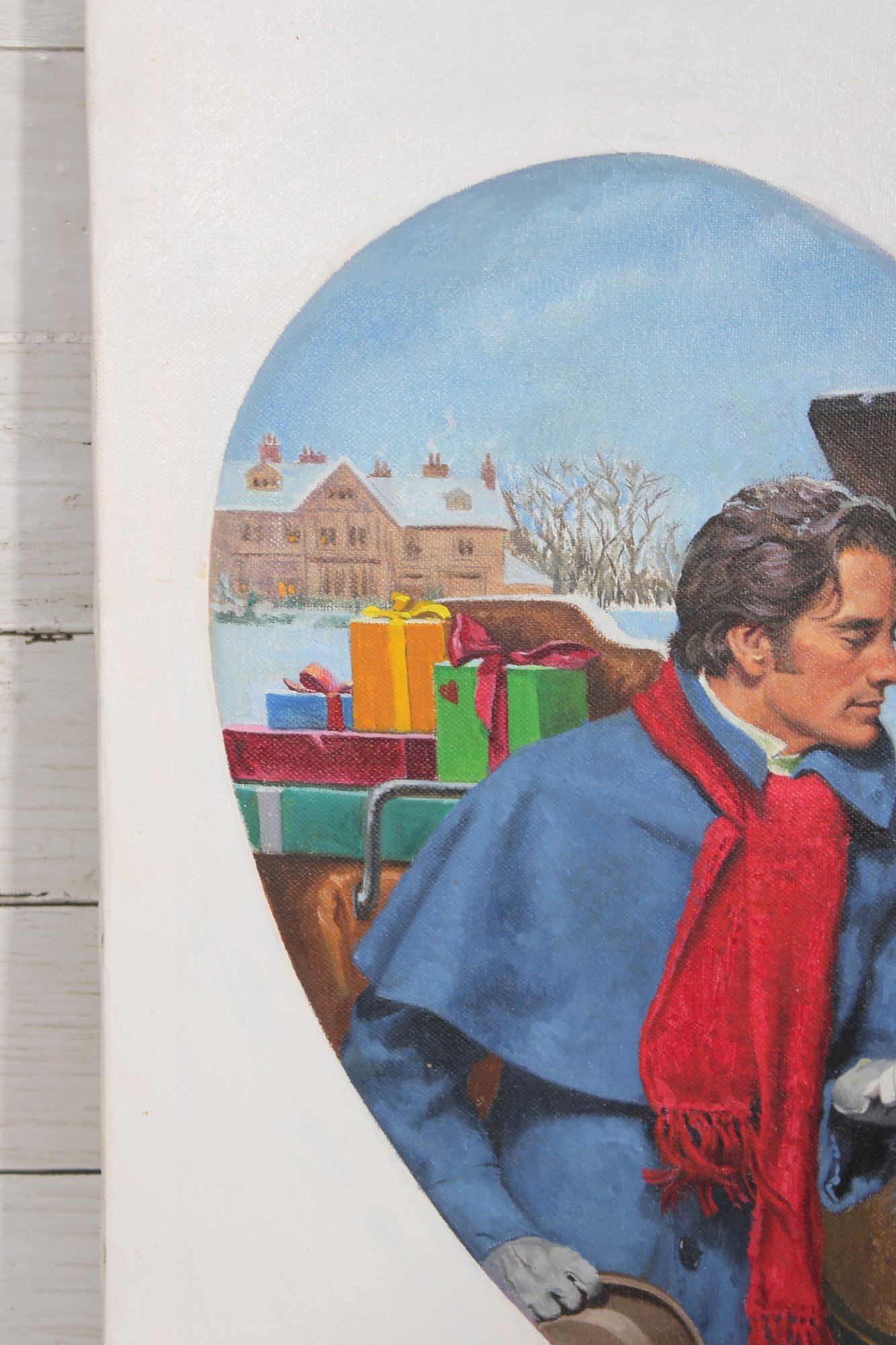 Charming signed artwork titled “The Mischievous Miscreants,” featuring a romantic heart-shaped composition depicting a Victorian-era couple beside a carriage beneath a blooming rose. The colorful imagery blends narrative charm with whimsical design, framed by a clean white border that highlights the central scene.