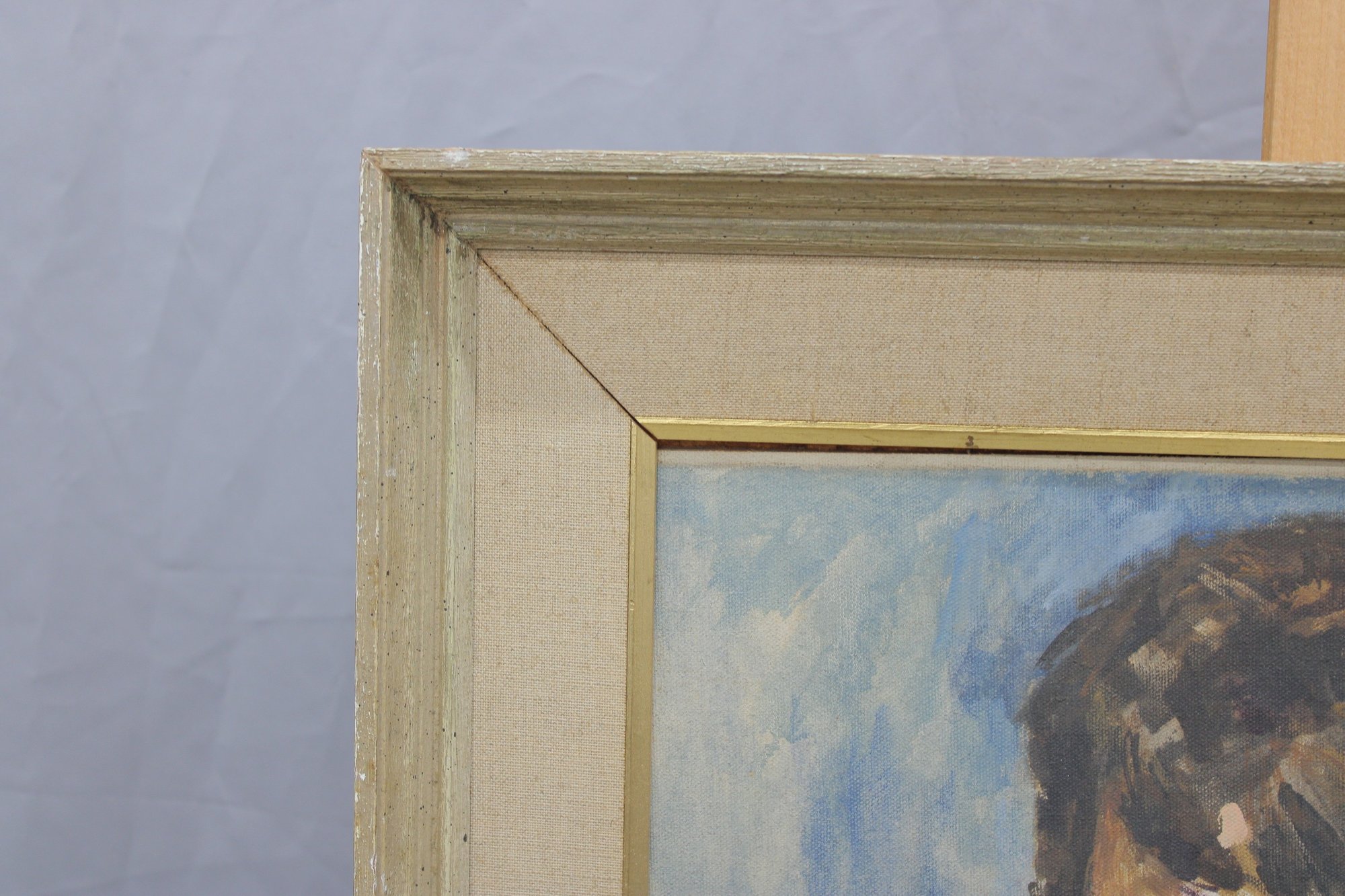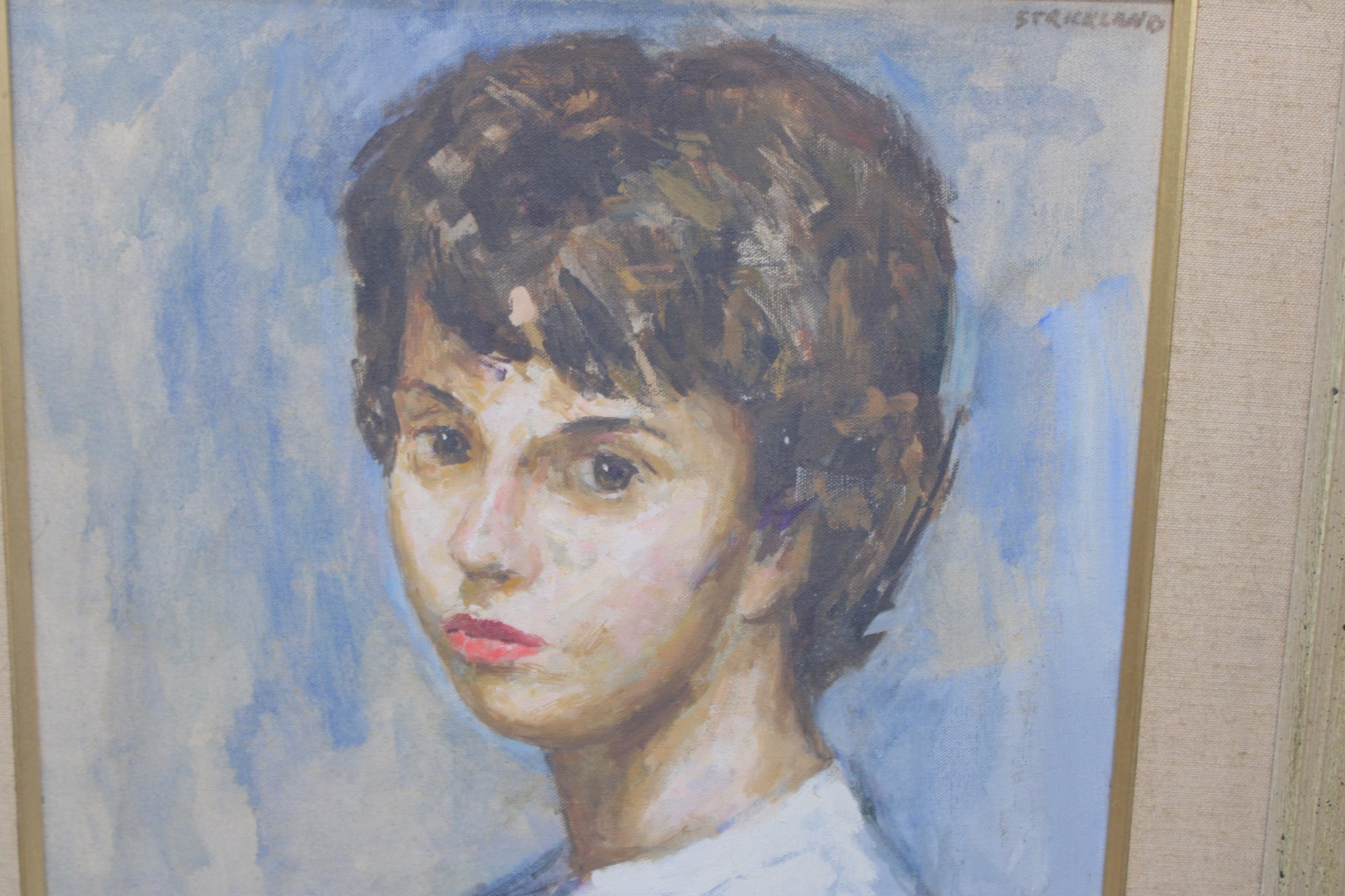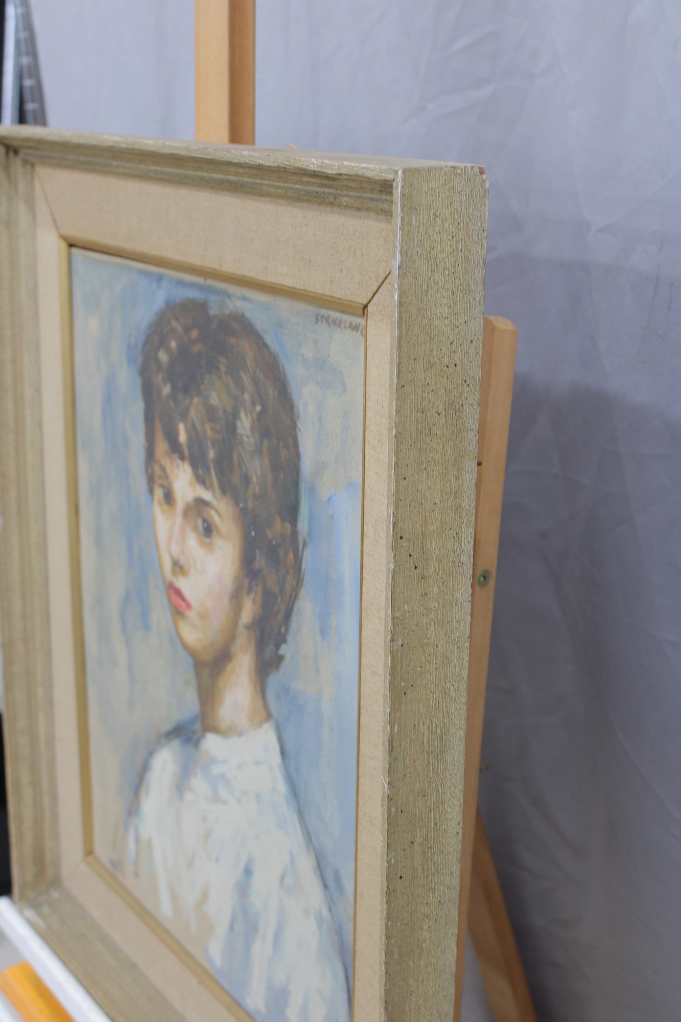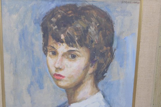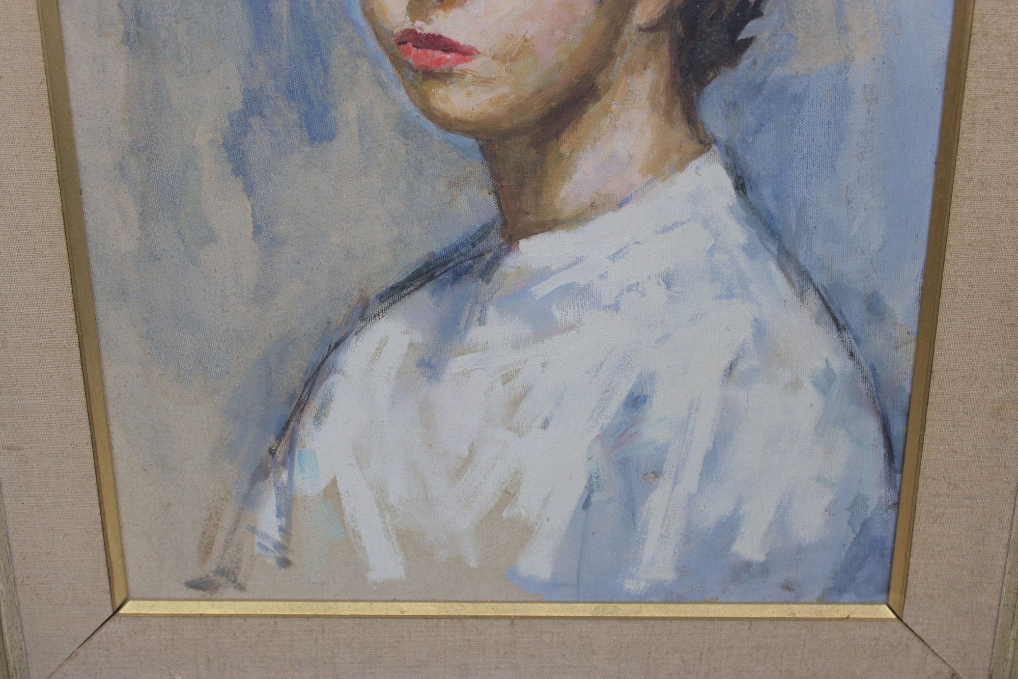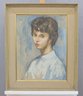 a signed original portrait oil painting on artist board, depicting a young woman rendered in soft, expressive brushstrokes with a restrained, modern palette. The portrait conveys a quiet, introspective mood, with sensitive handling of facial features and light.