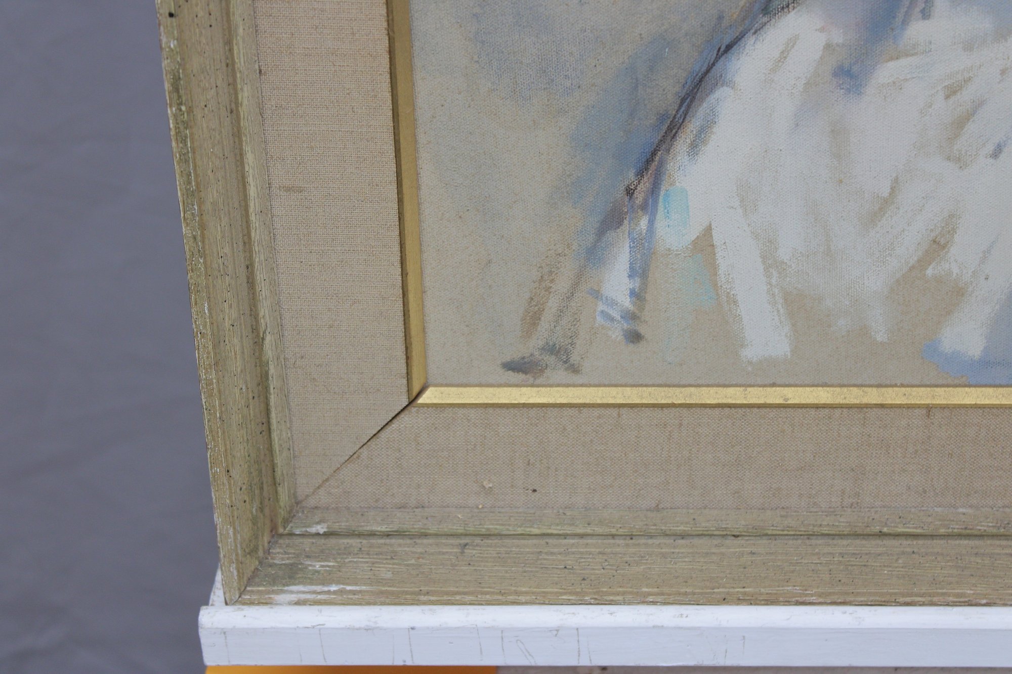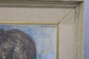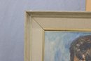 The painting is signed on the front (see close-up photos) and is presented in a linen-lined and wood frame with gold inner liner, which complements the artwork and appears period-appropriate.