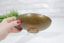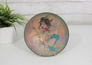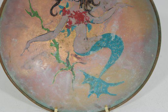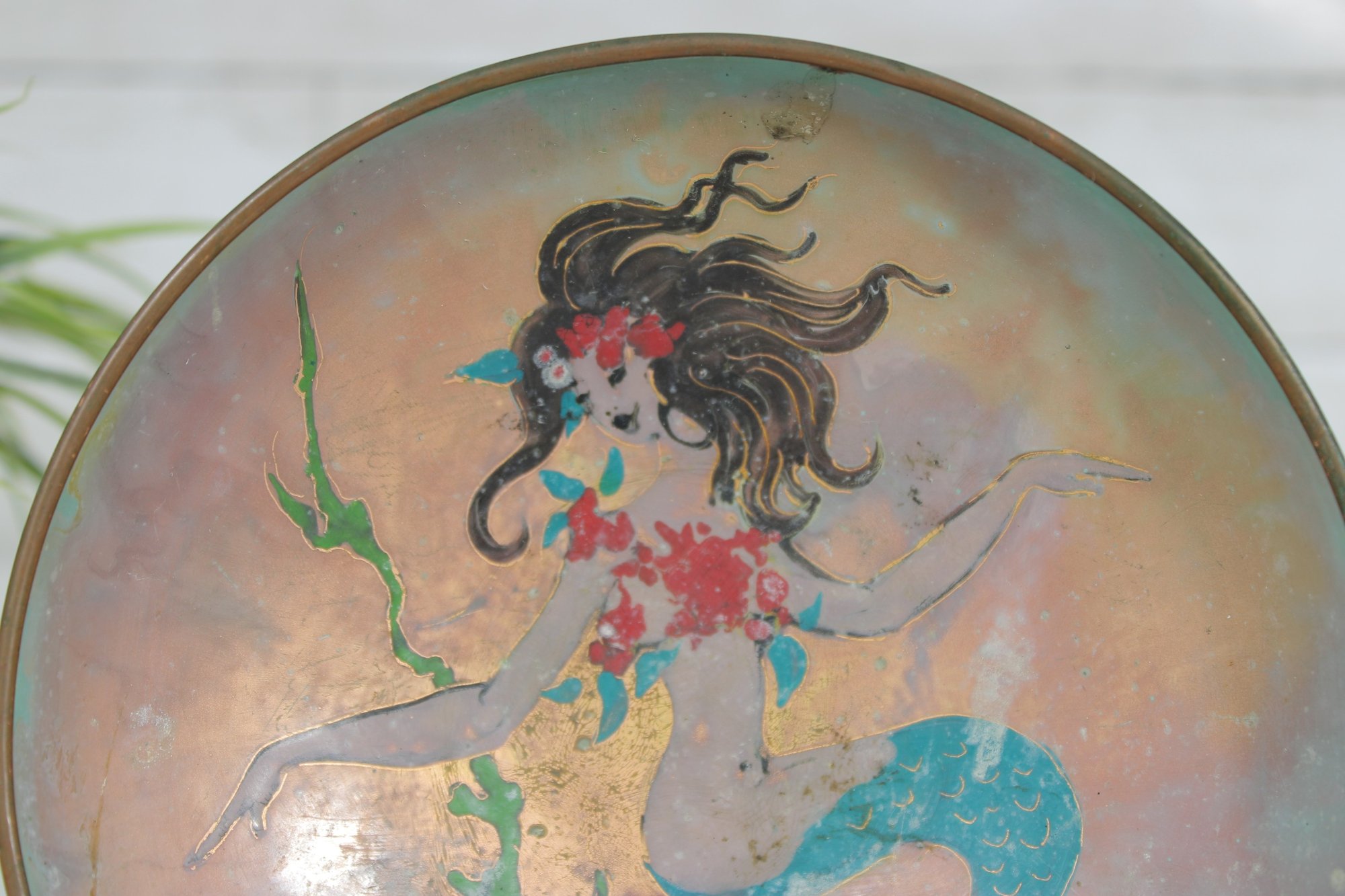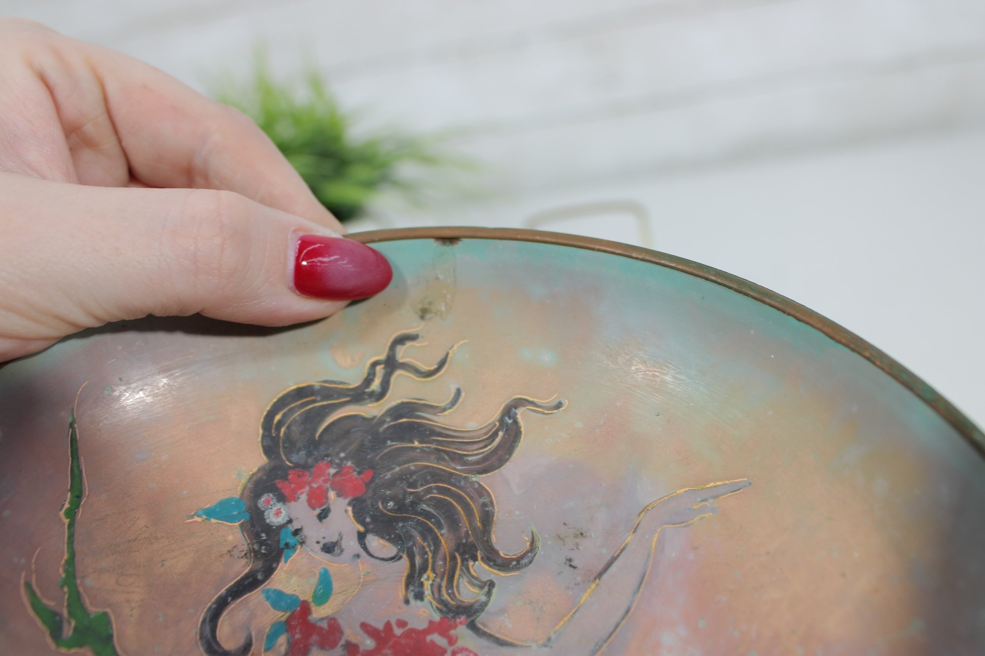Unique and eye-catching vintage enamel on copper bowl featuring a beautifully hand-painted mermaid design. The interior showcases a stylized mermaid with flowing hair, accented in vibrant tones of turquoise, red, and gold, set against a luminous iridescent background that shifts with the light.