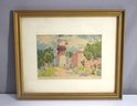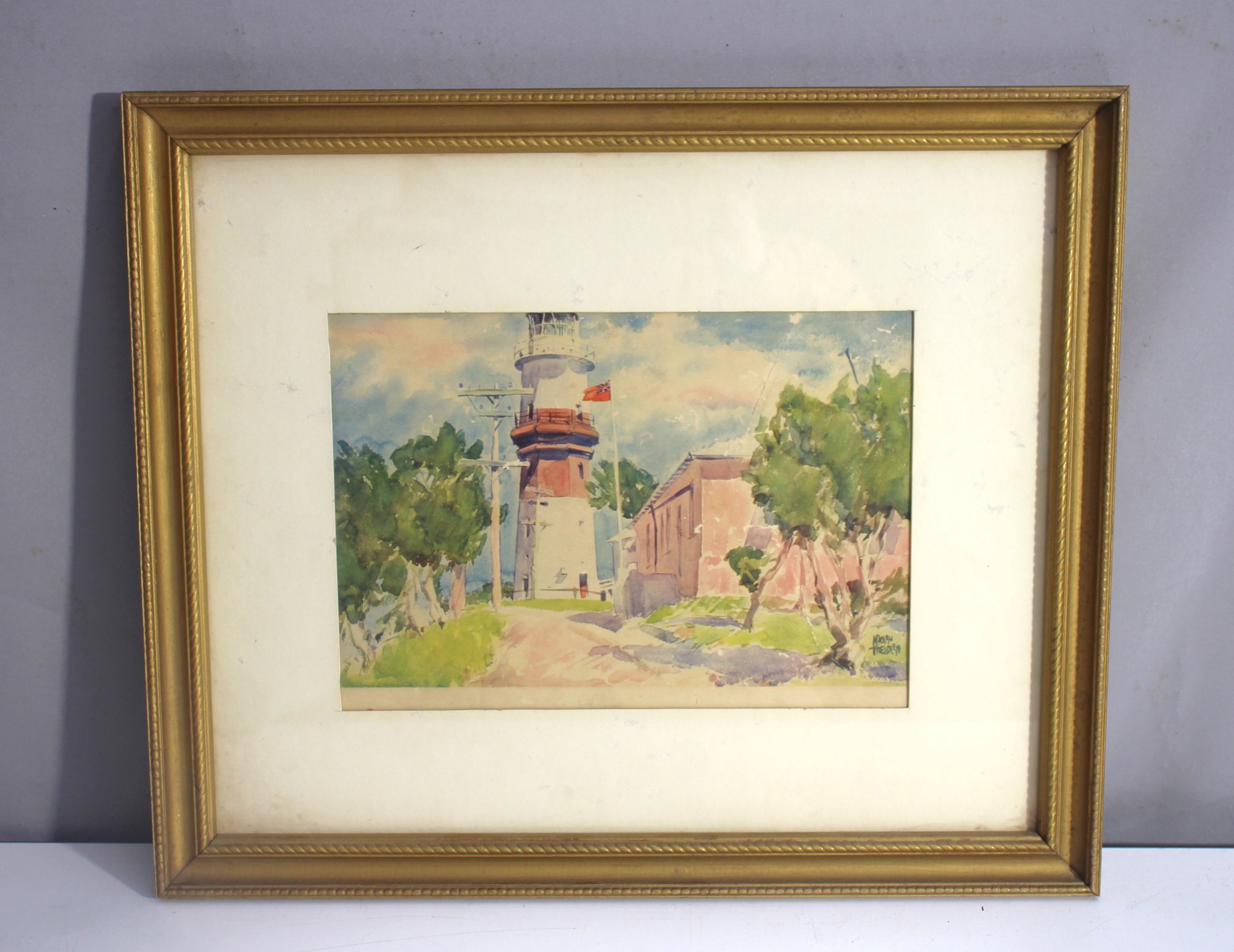 This charming original watercolor painting captures a coastal lighthouse scene, signed by artist Noah Freidger in the lower right corner. The artwork portrays a historic lighthouse and surrounding structures with a vibrant yet soft color palette, evoking a serene maritime atmosphere. Measuring 16 inches high by 19 inches wide (including frame), this piece is an excellent addition to a nautical or coastal-themed collection.