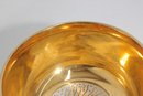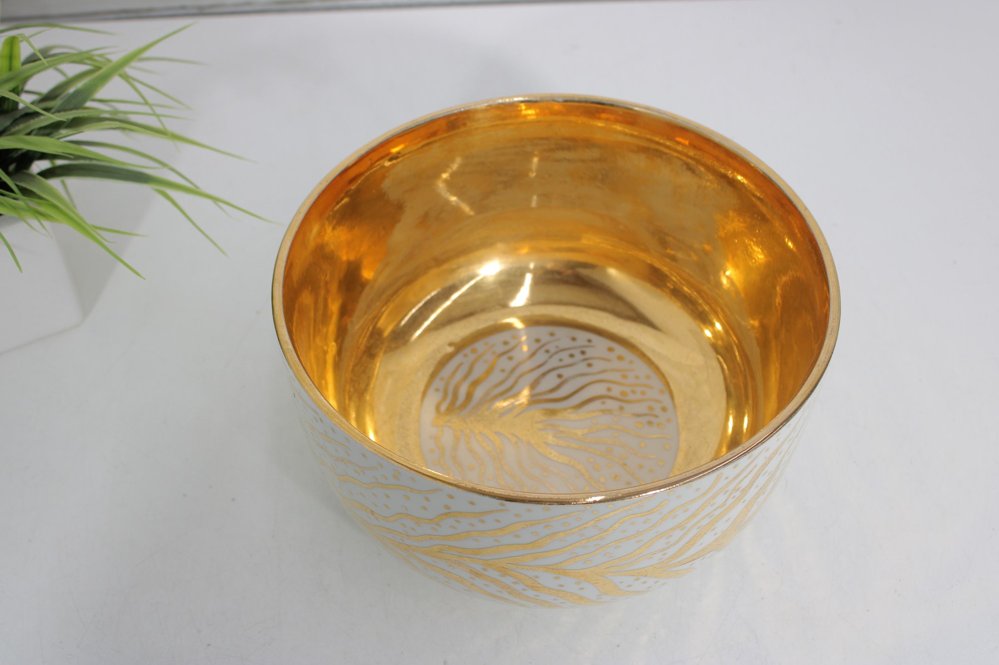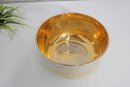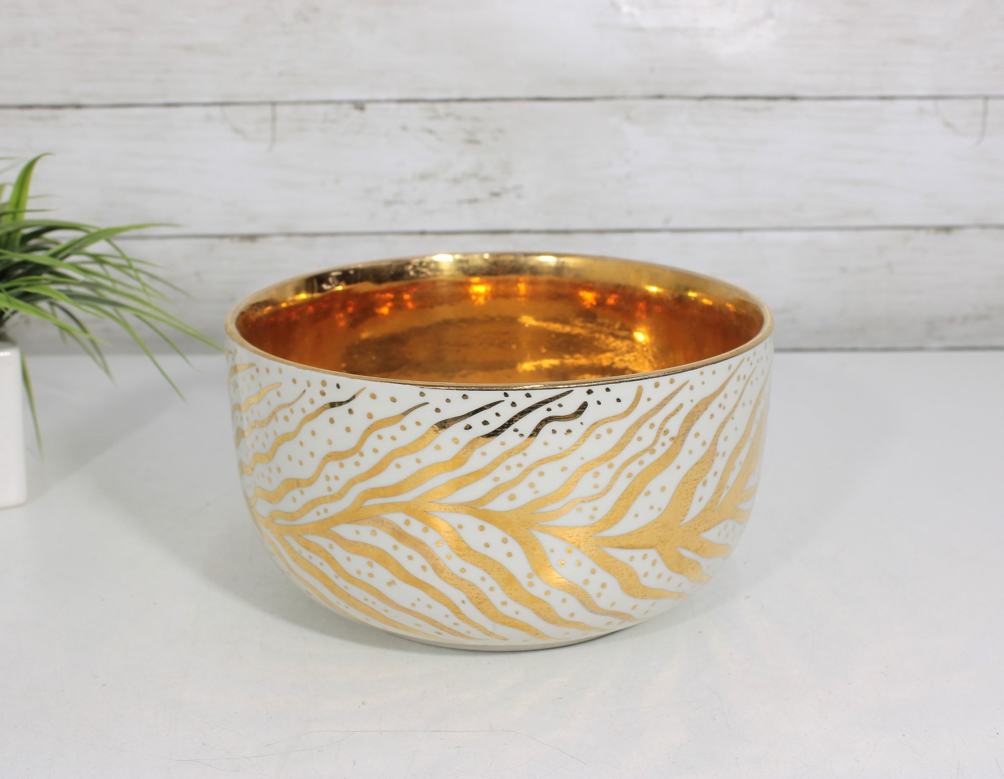 The interior is finished in a brilliant gold gilt glaze, creating a rich, reflective surface that contrasts elegantly with the matte and patterned exterior. The design is both modern and organic, showcasing Gregory’s distinctive style and craftsmanship.