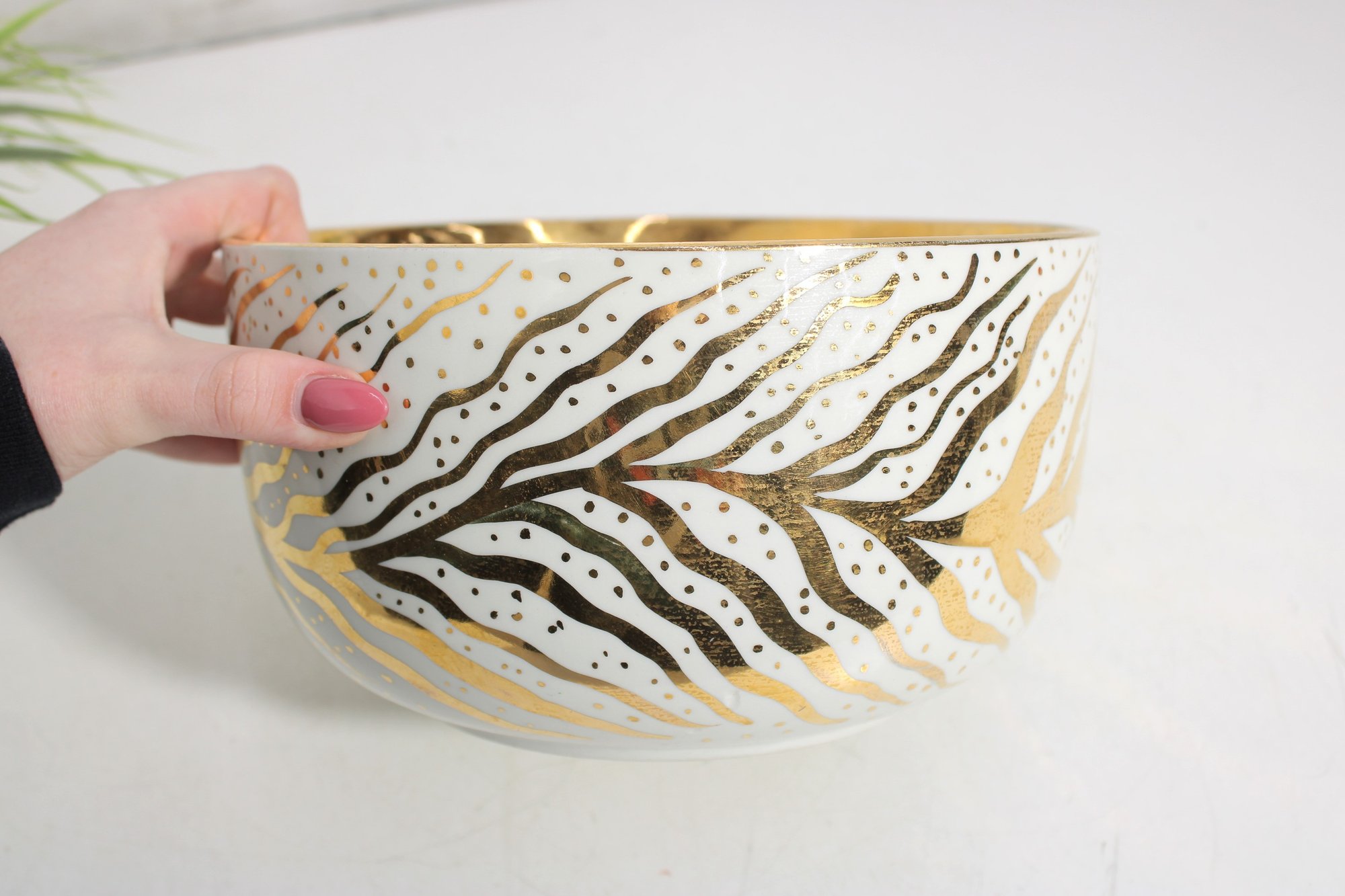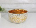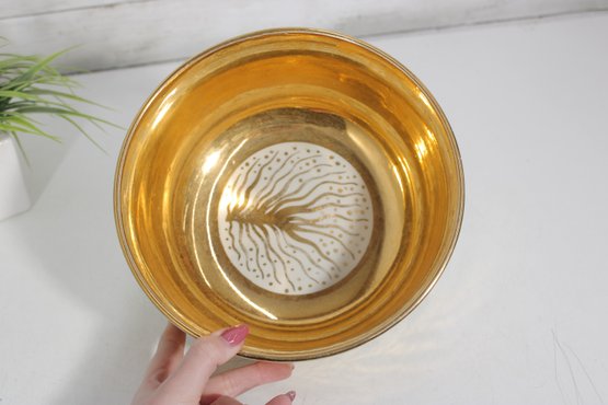 a stunning signed art pottery bowl by renowned American ceramic artist Waylande Gregory. This beautifully crafted piece features a bold, decorative exterior with flowing leaf-like patterns in gold, black, and white, accented by fine dotted detailing.