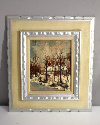 This signed oil painting by artist Leluny features a beautiful winter landscape scene, capturing the bare trees and snow-covered ground in a rural setting. The textured brushstrokes and muted colors convey a quiet, serene atmosphere of winter. The artist's skillful use of light and contrast adds depth to the scene, making it a striking depiction of nature in its most peaceful state.
