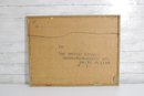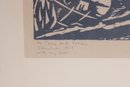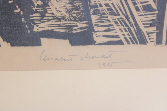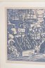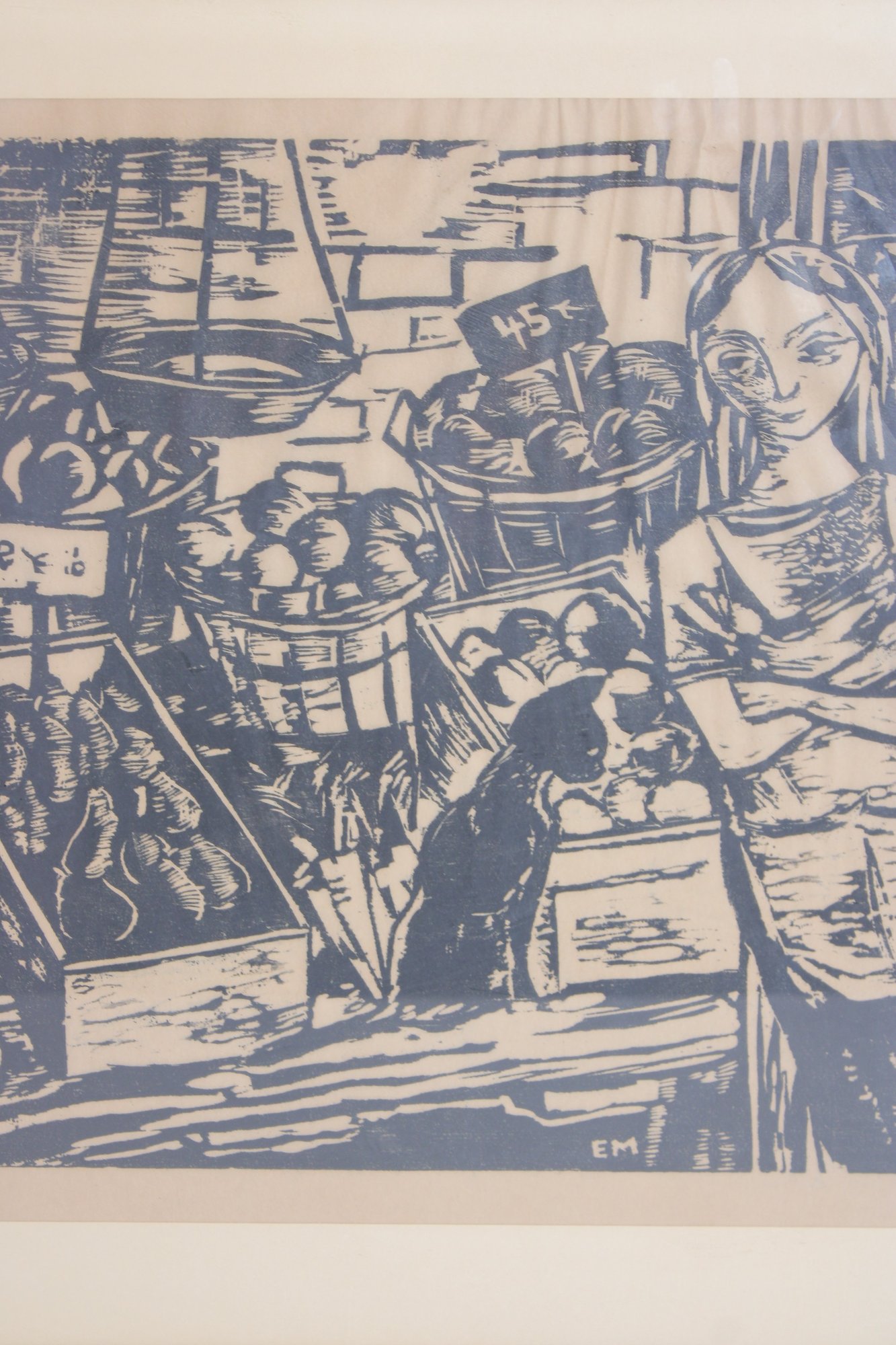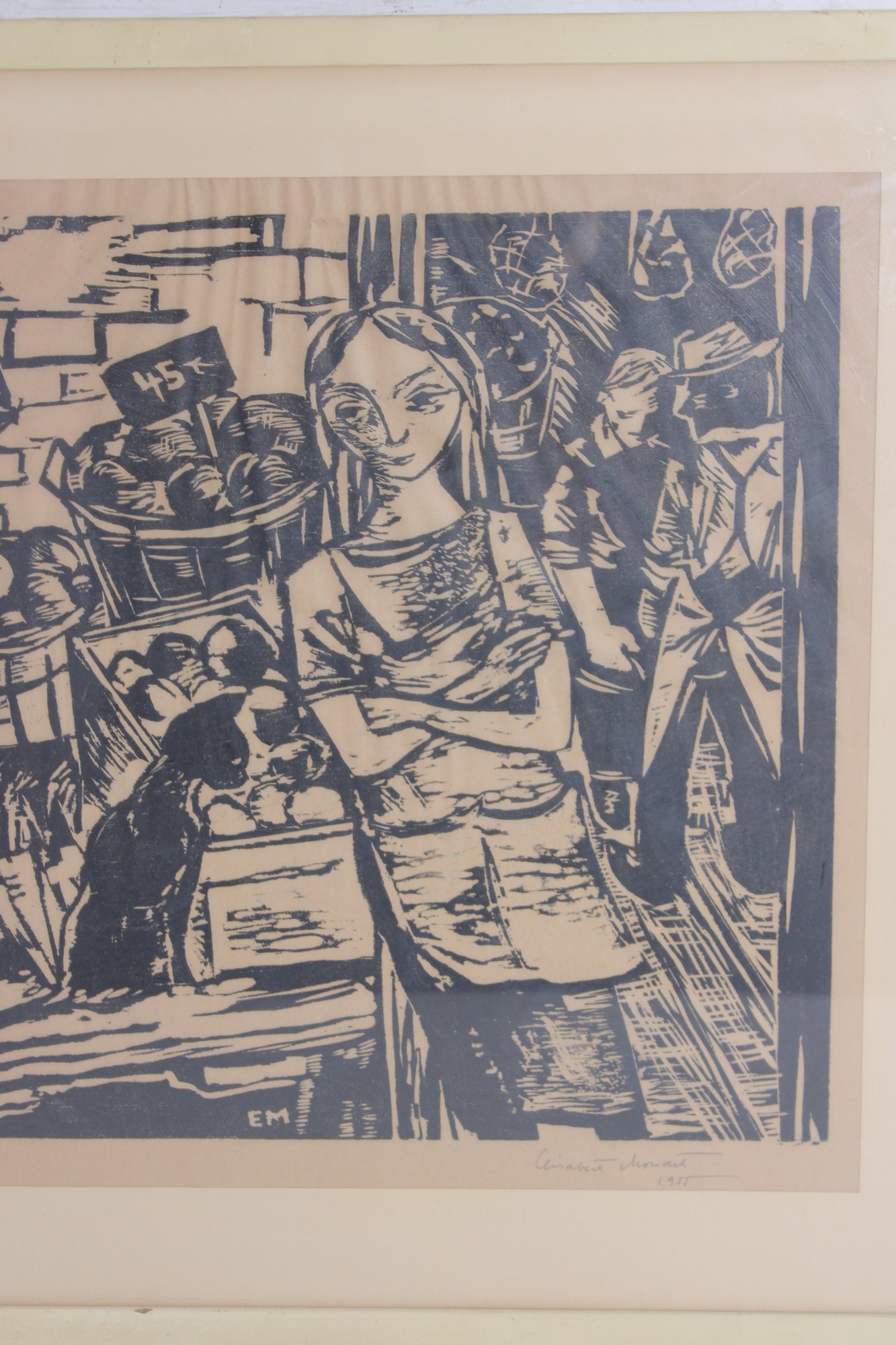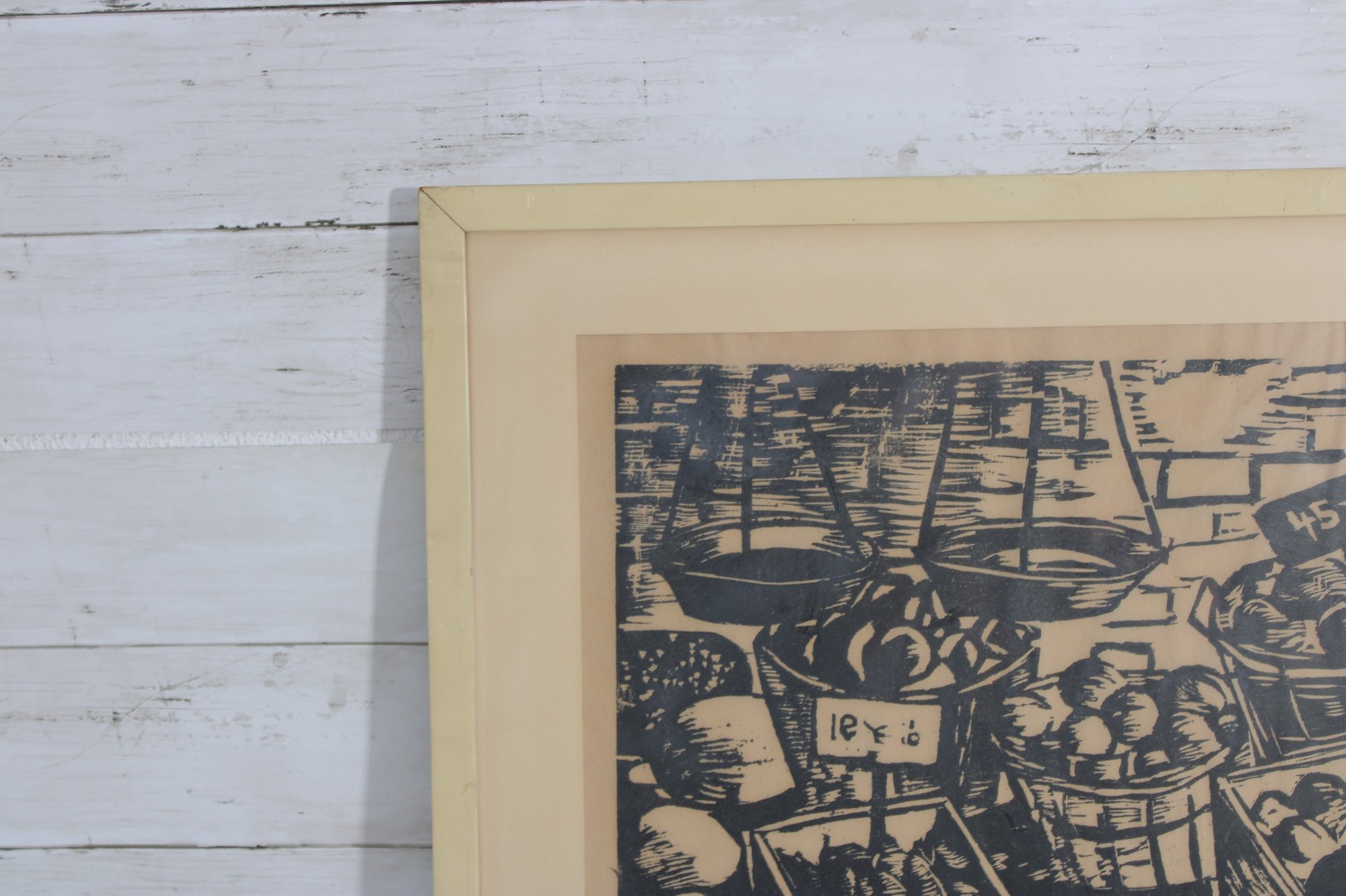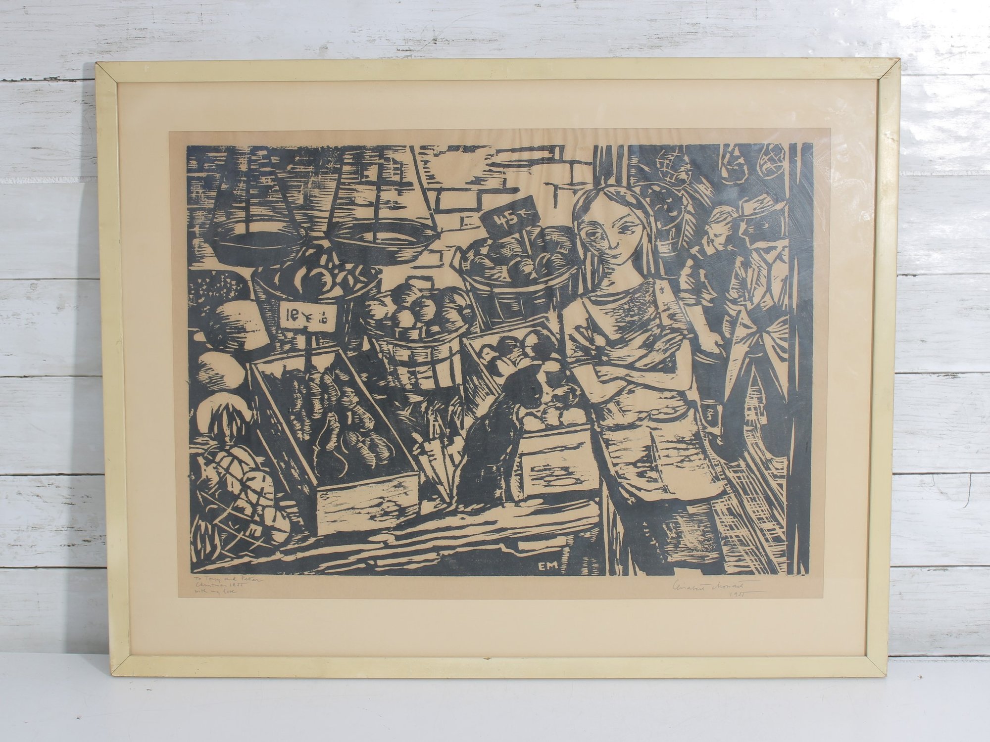 The scene captures a stylized everyday moment, with a central female figure surrounded by baskets, signage, and background activity—evoking a narrative quality typical of mid-20th century printmaking.