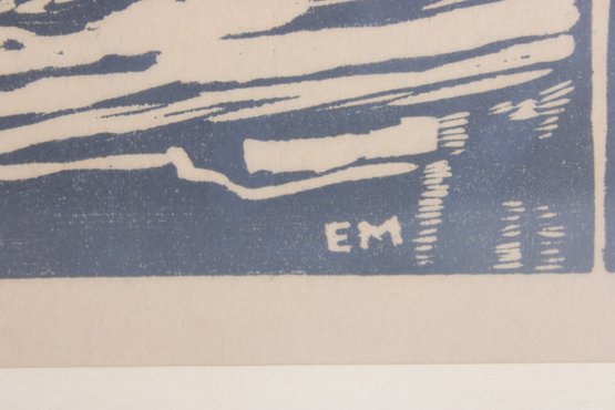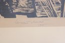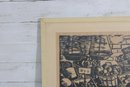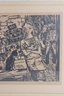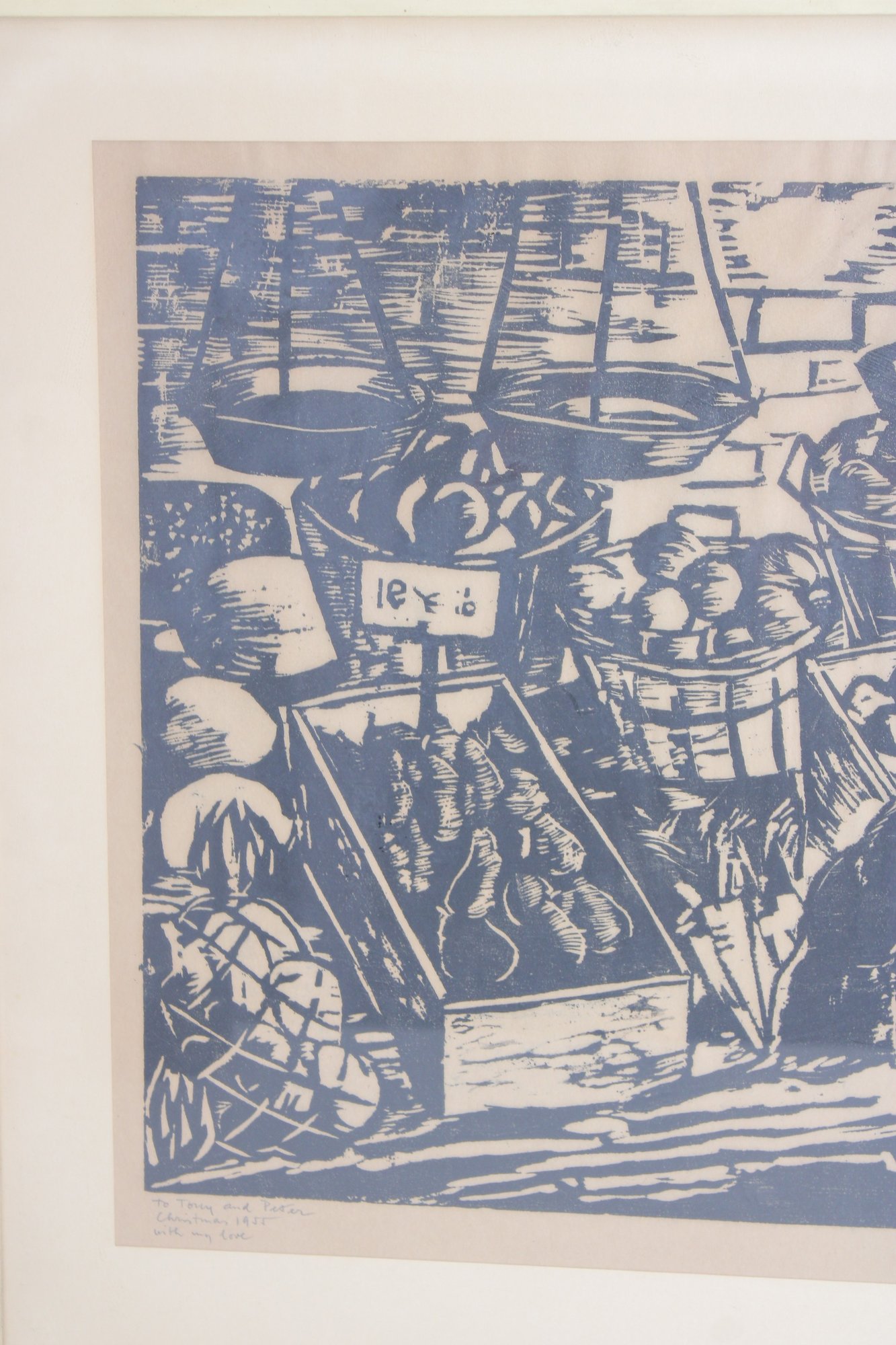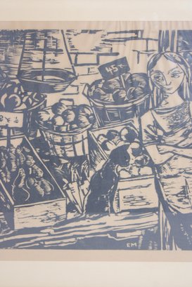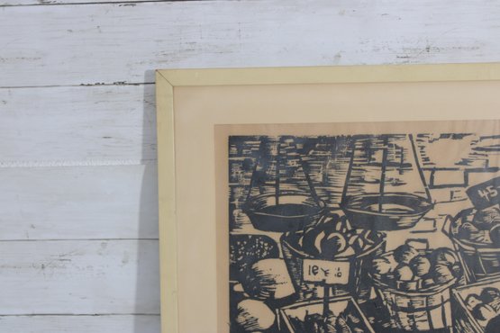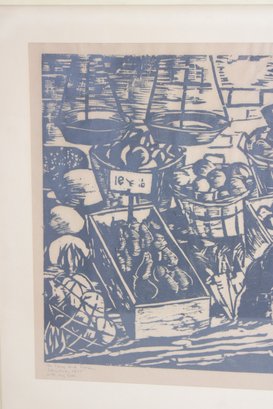 Striking signed woodcut-style print depicting a lively market scene with figures, produce stands, and architectural elements. The composition features bold, graphic linework in a monochromatic blue tone, creating strong contrast and a dynamic sense of movement.