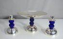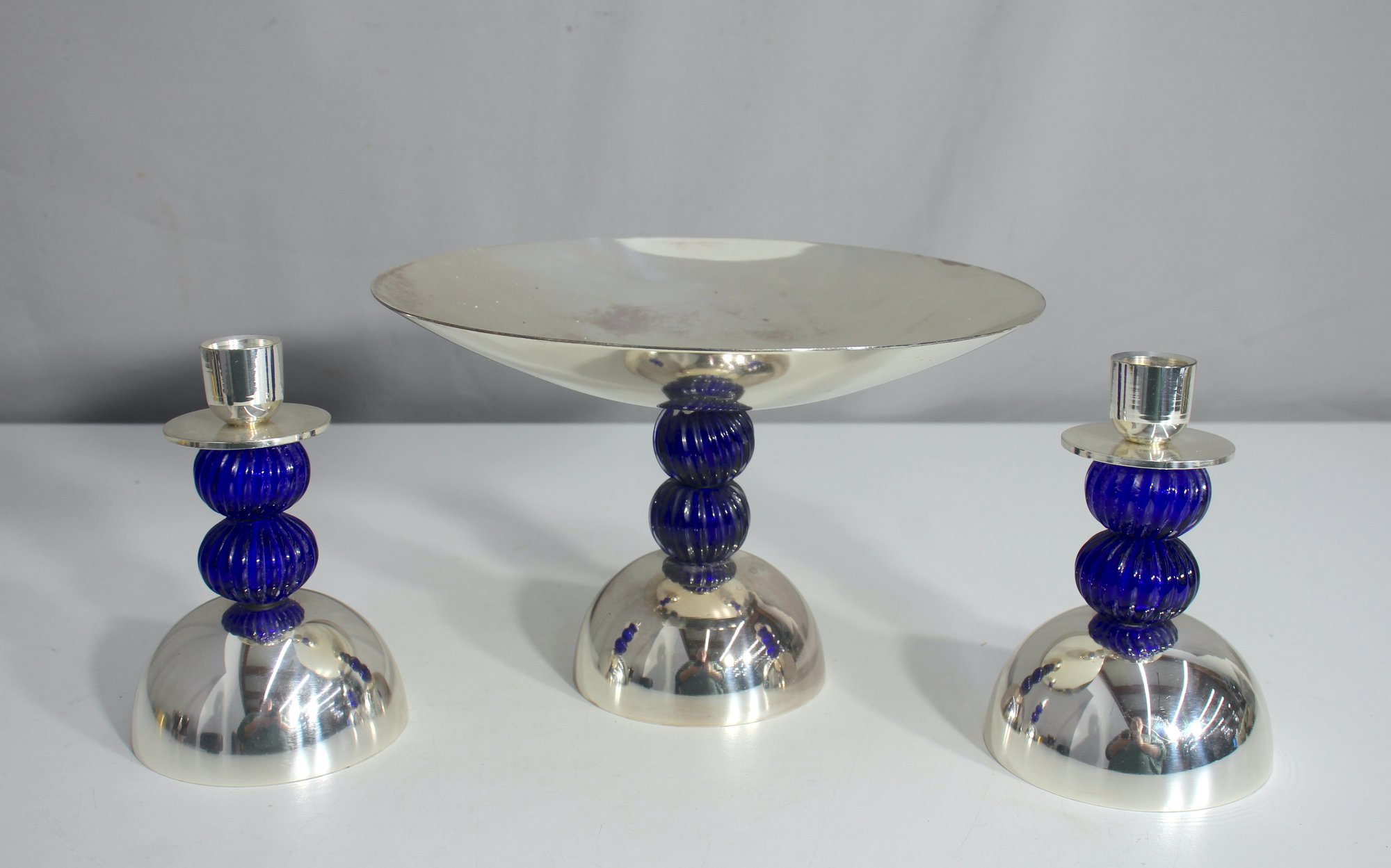 Add sophistication to your table setting with this exquisite set of two silver-plated candleholders paired with a matching centerpiece bowl. Featuring stunning cobalt blue glass accents with ribbed detailing, these pieces combine classic elegance with a modern touch. The centerpiece stands out with its wide, polished design, ideal for displaying fruit, floral arrangements, or as a standalone statement piece. Each candleholder complements the set with a sturdy silver-plated base and a striking blue glass middle.