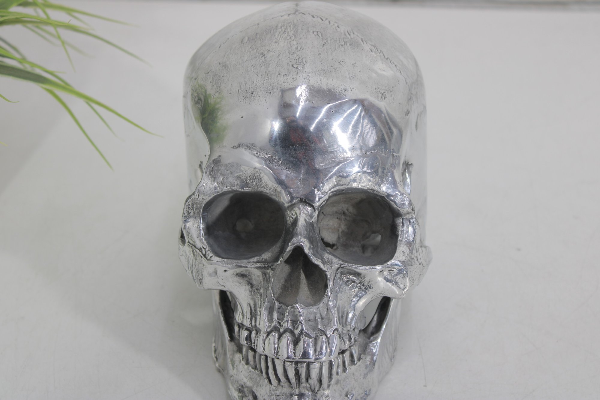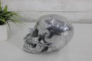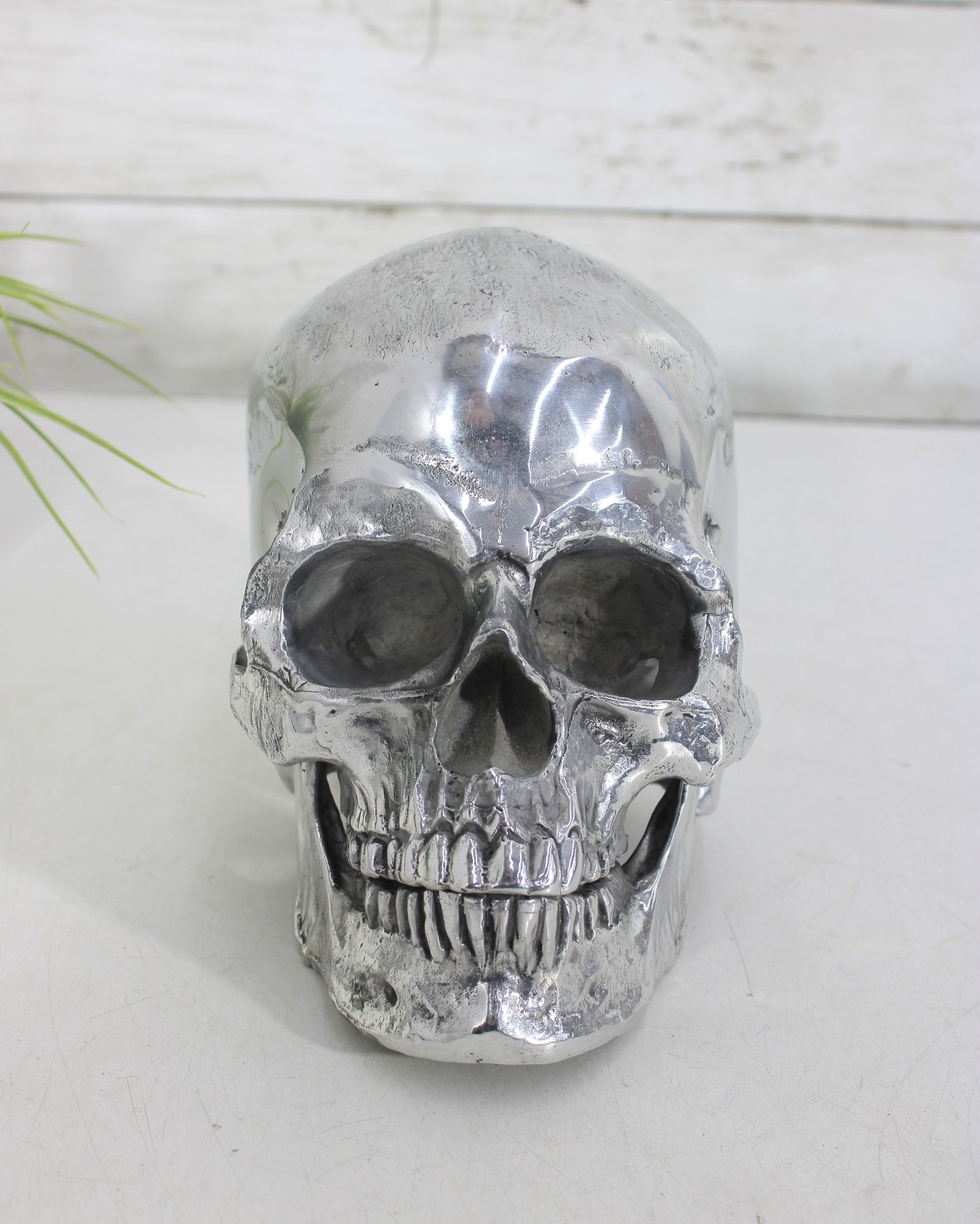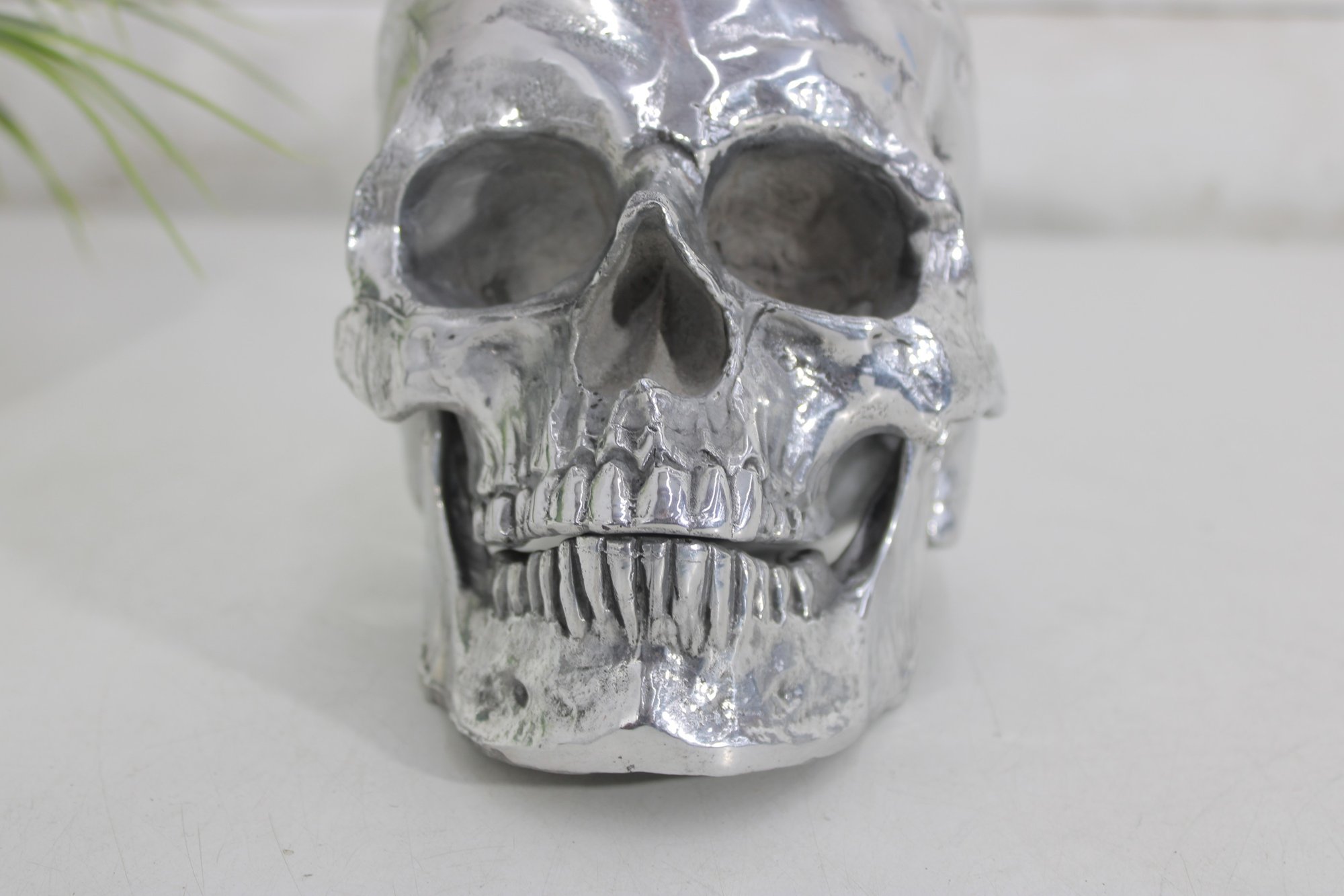 Bold and eye-catching silver-tone skull trinket box featuring a sculptural design with a polished metallic finish. The detailed teeth, contours, and hollow interior give this piece a dramatic gothic aesthetic, making it a striking decorative accent for alternative décor, Halloween displays, or eclectic interiors.