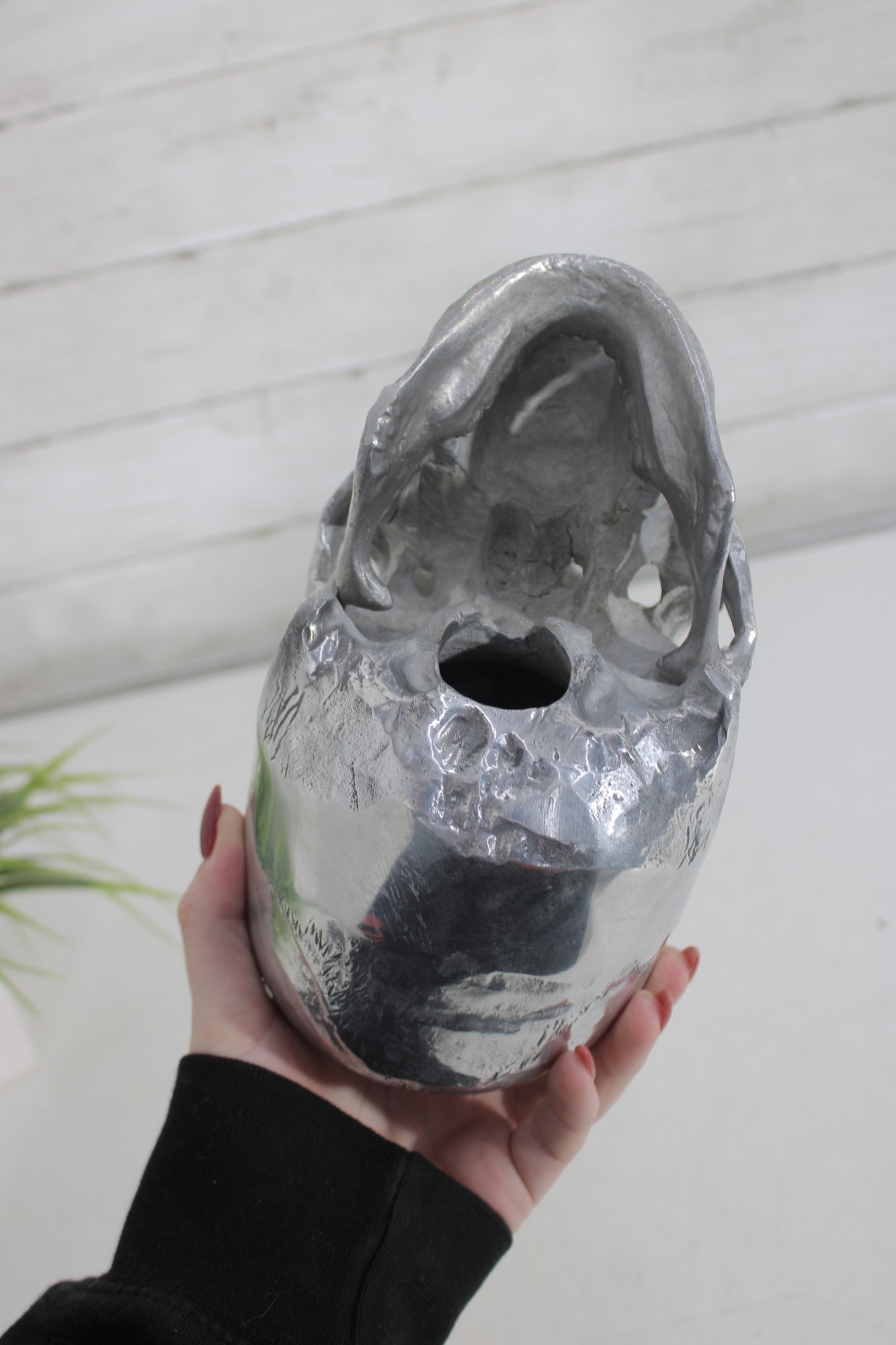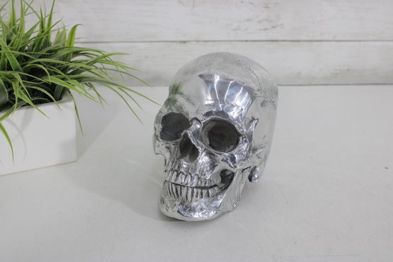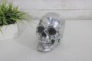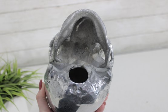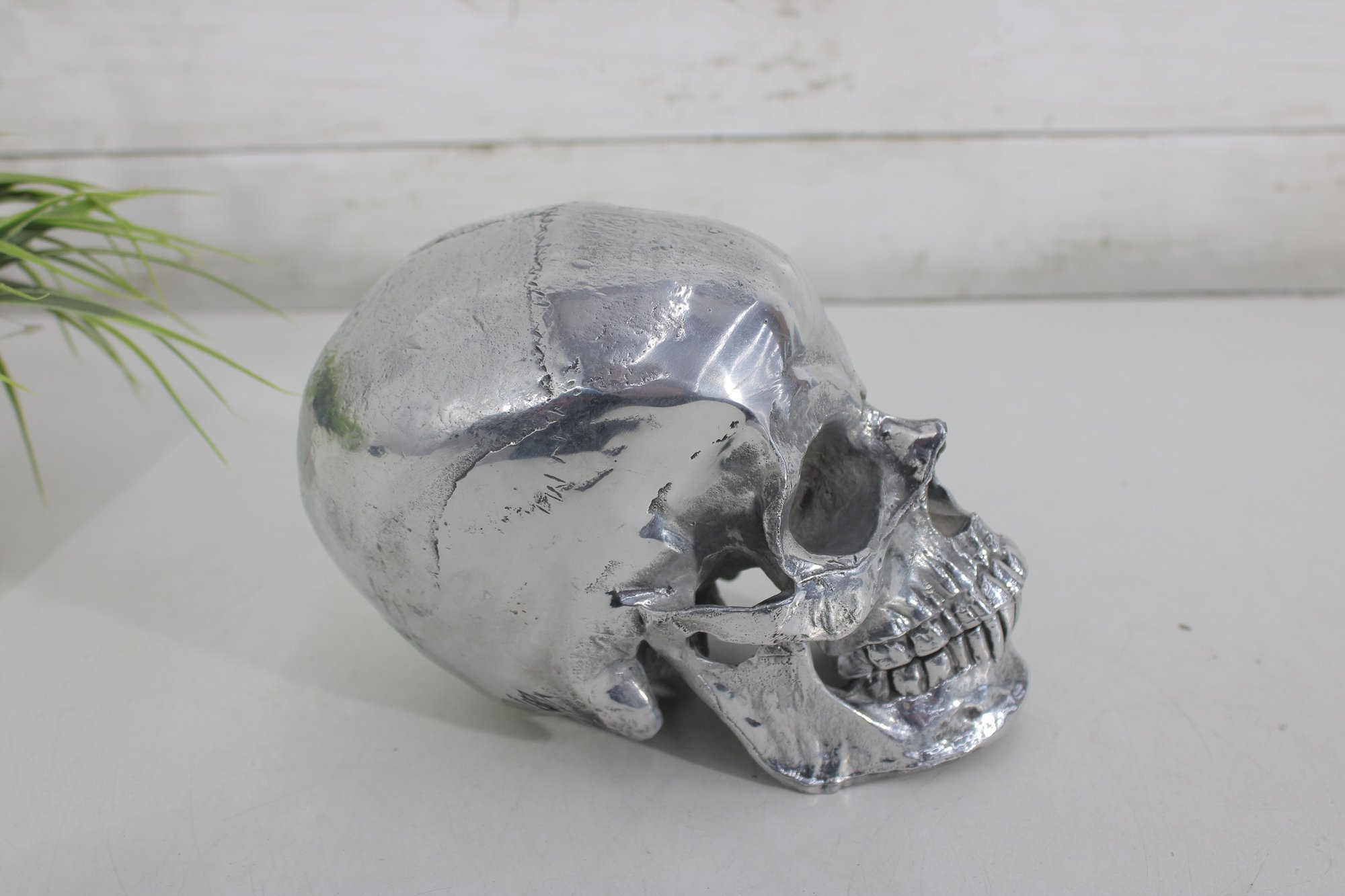 Bold and eye-catching silver-tone skull trinket box featuring a sculptural design with a polished metallic finish. The detailed teeth, contours, and hollow interior give this piece a dramatic gothic aesthetic, making it a striking decorative accent for alternative décor, Halloween displays, or eclectic interiors.