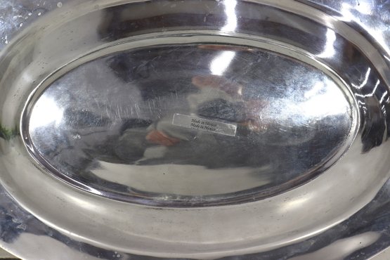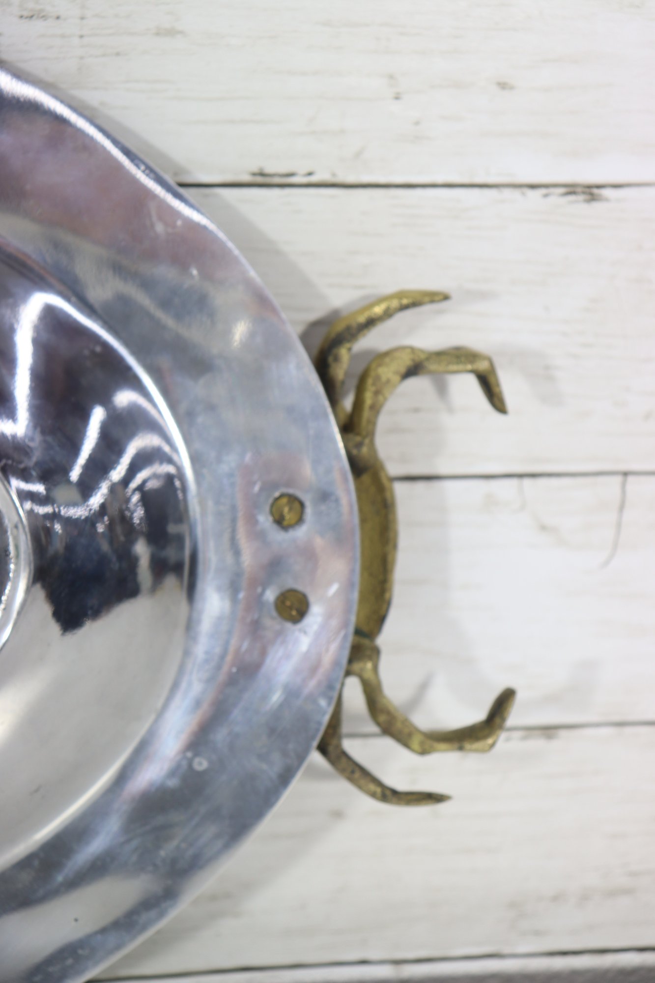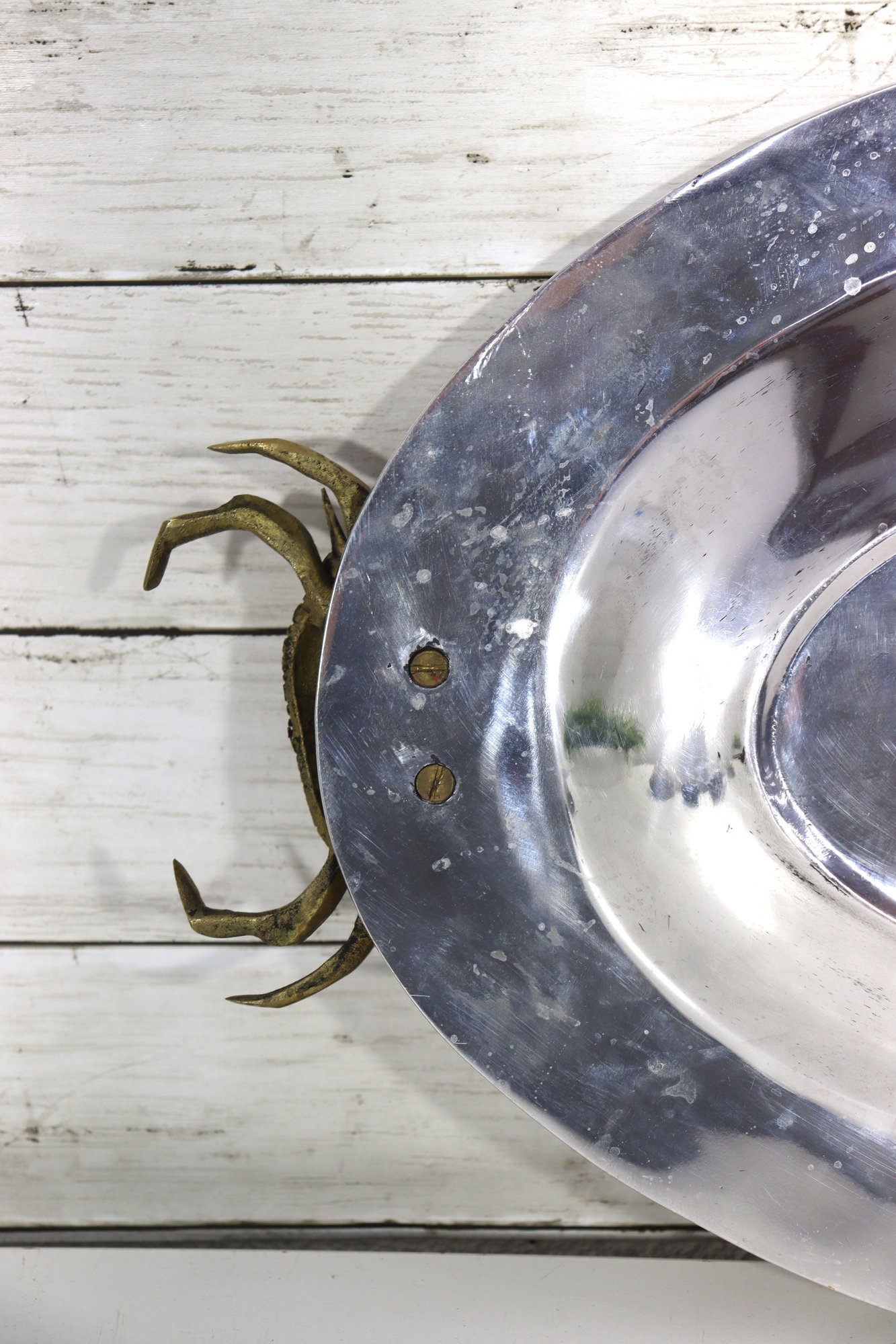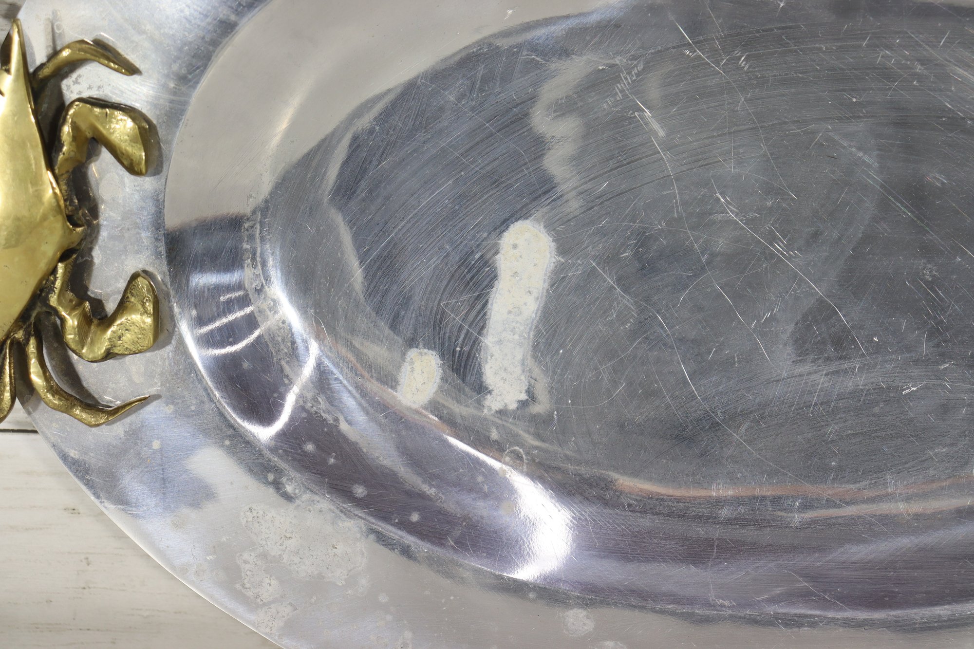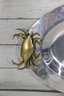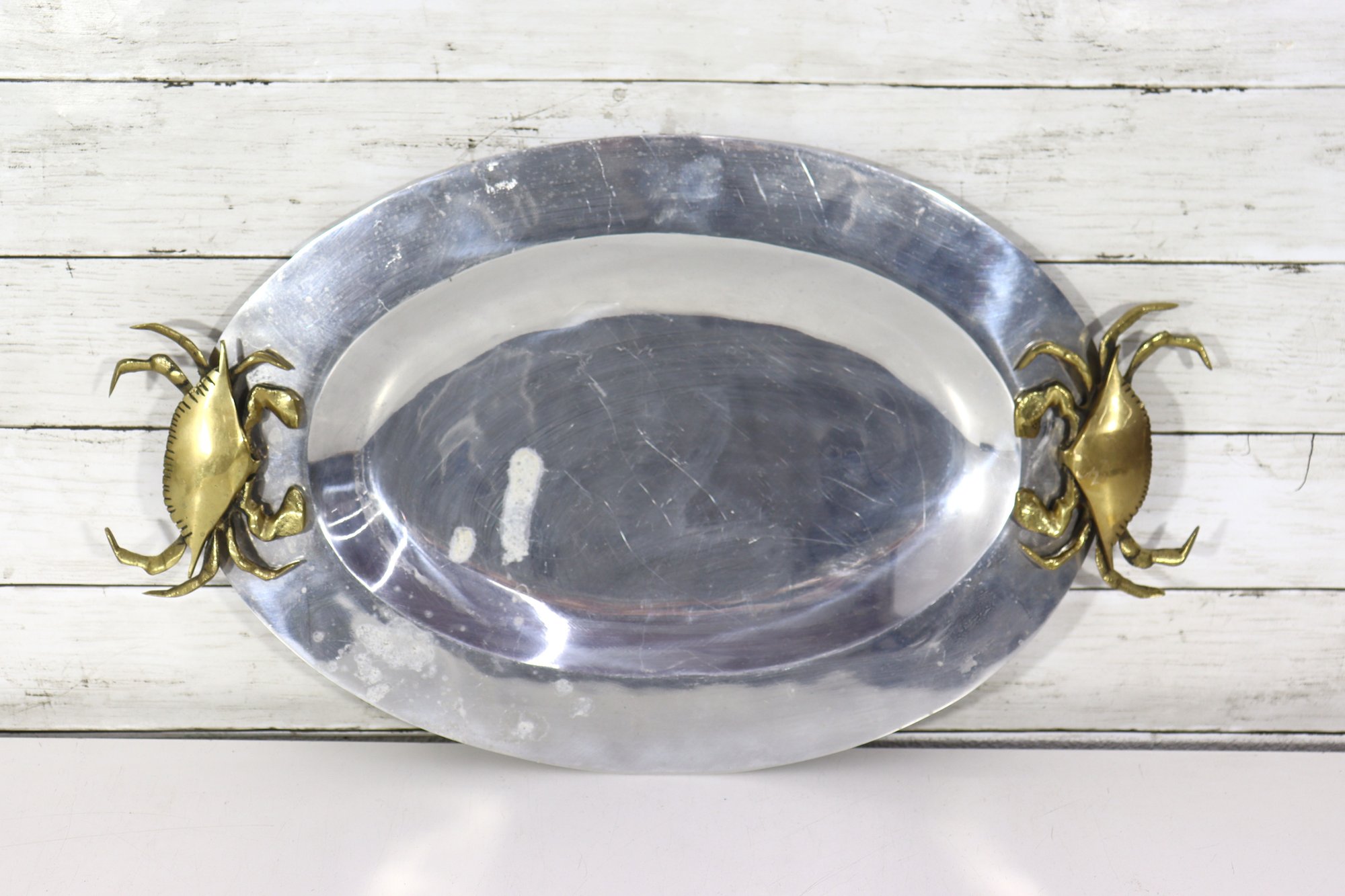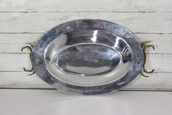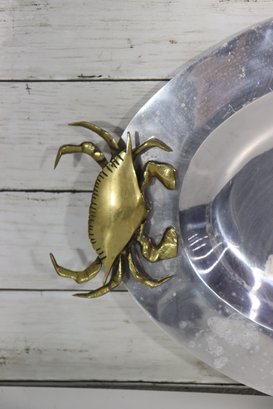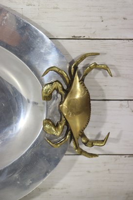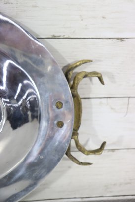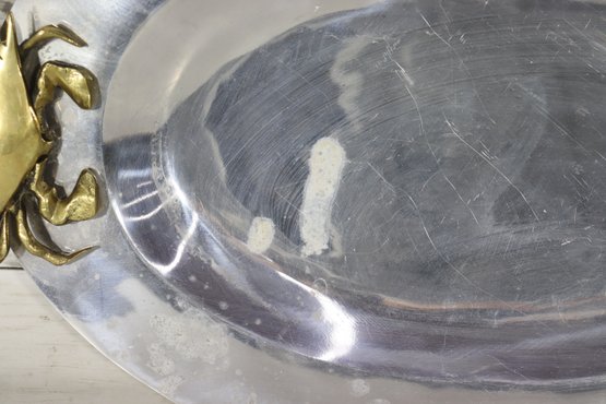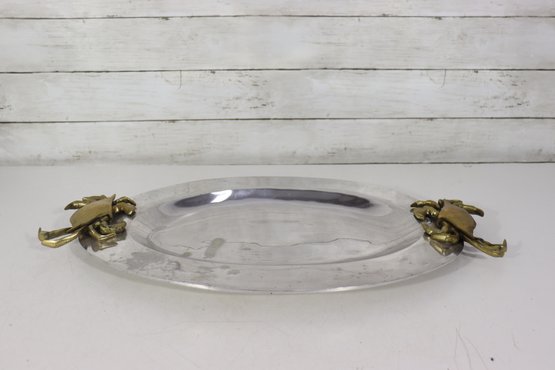 an eye-catching oval silverplate serving tray, accented with brass crab handles on each side. The sculptural crab motifs add a distinctive coastal and nautical flair, making this piece both functional and highly decorative.