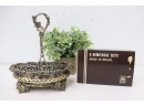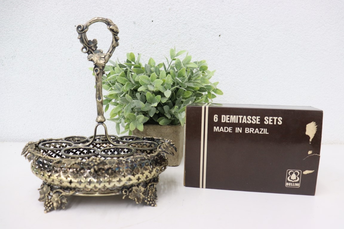 Six Bellini Ceramic And Metal DemiTasse Sets AND Ornate Silver-Plate Seven Ring Condiment Stand (no Inserts)