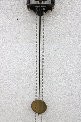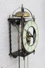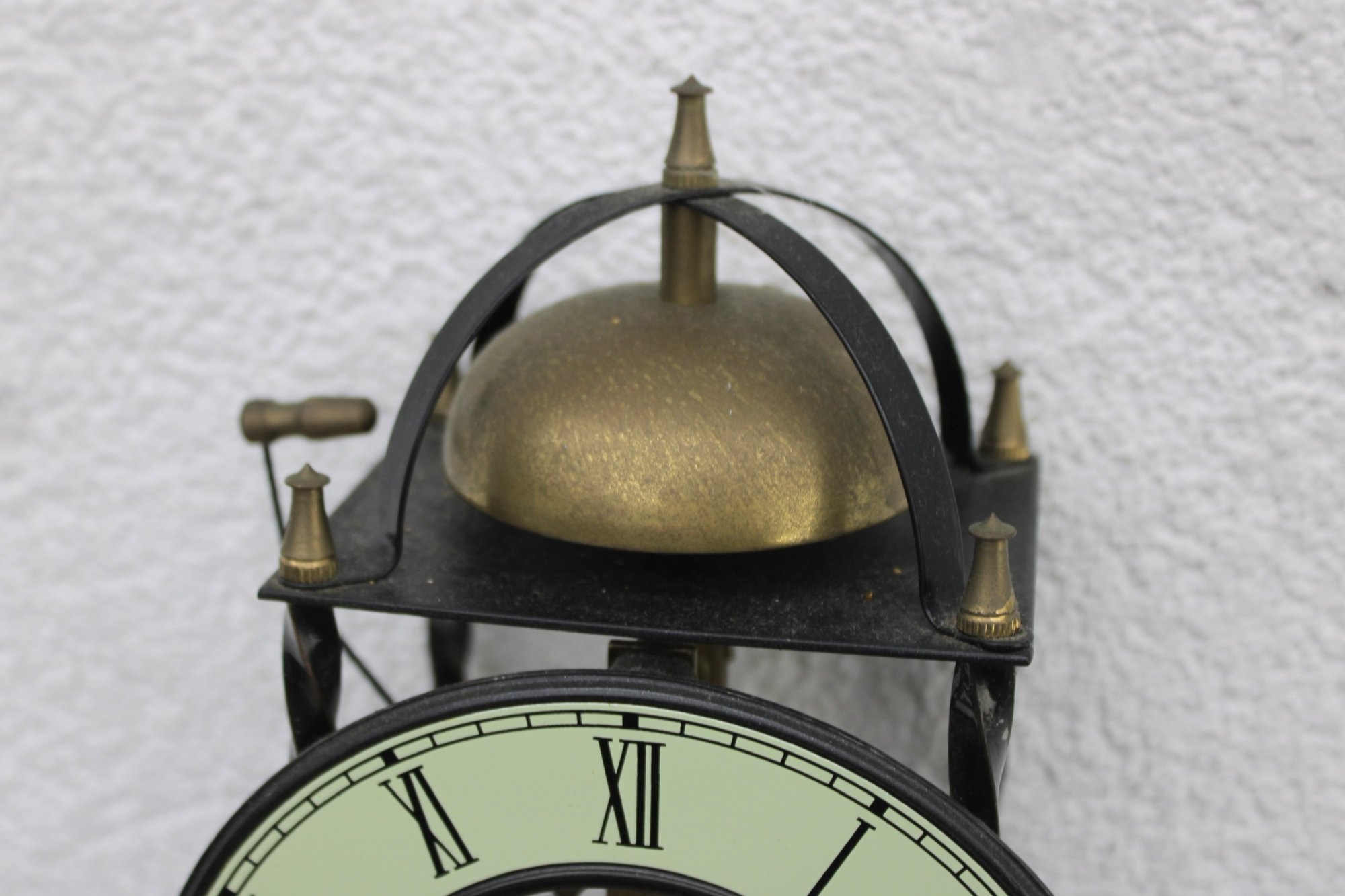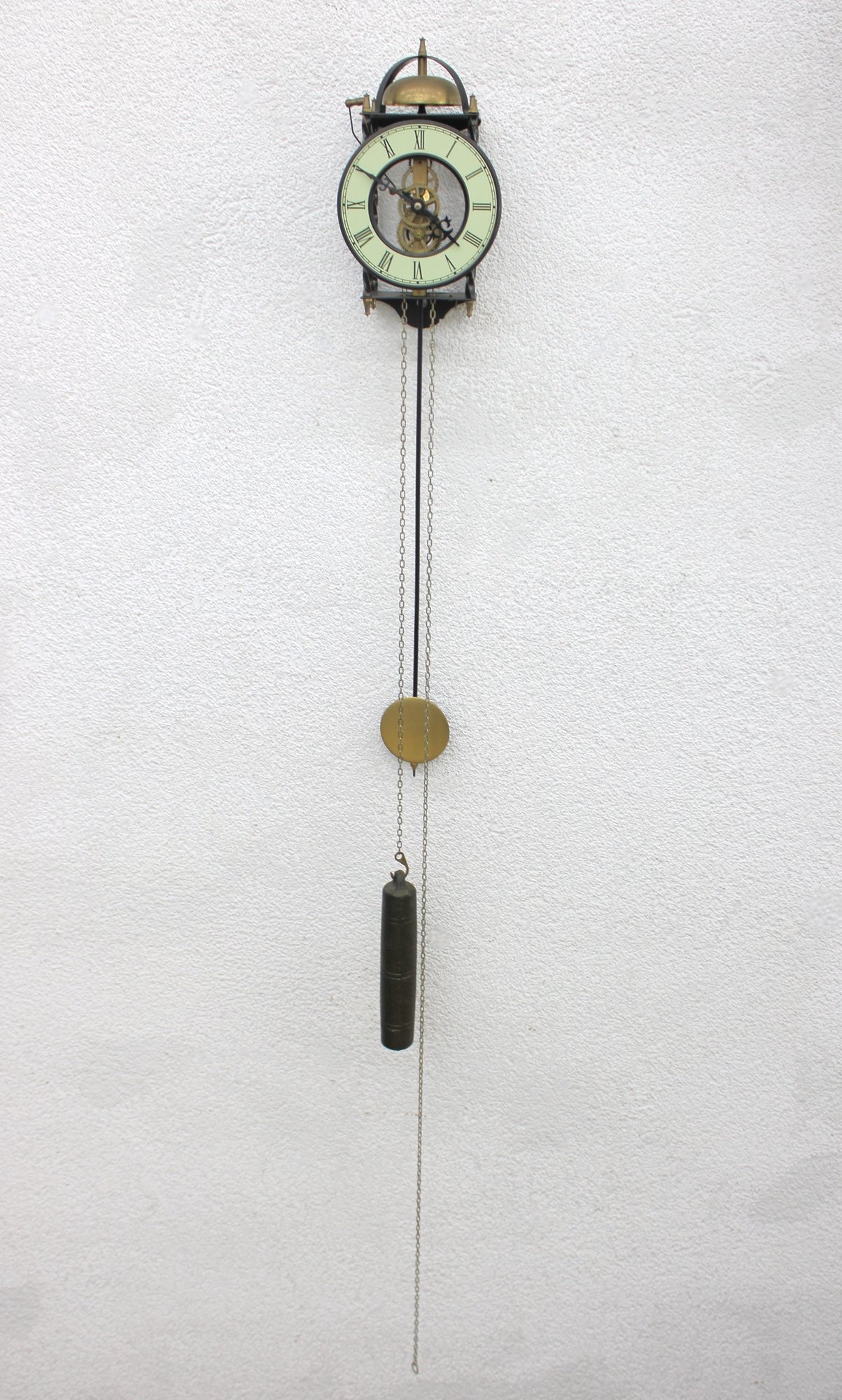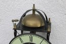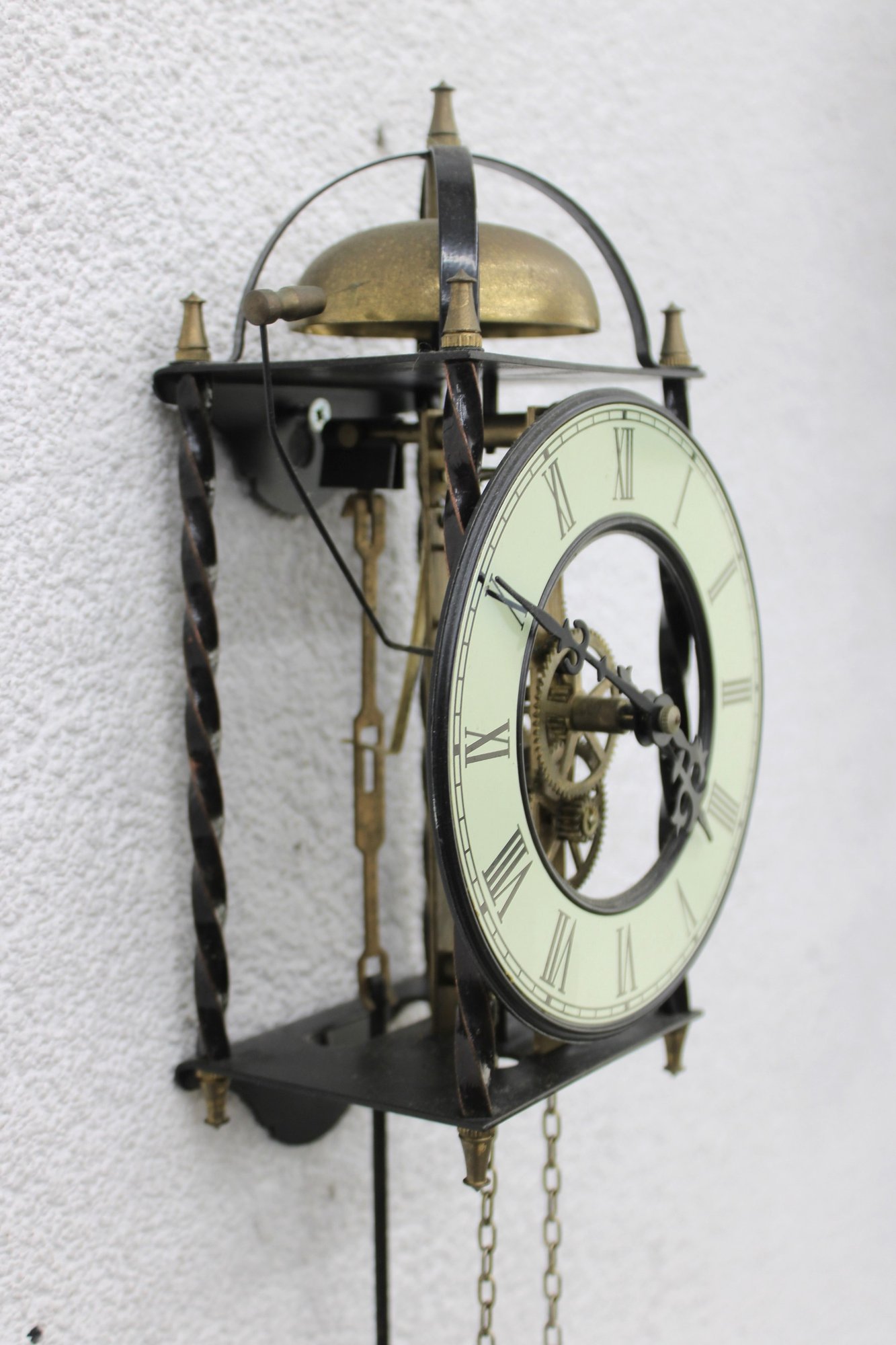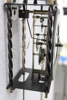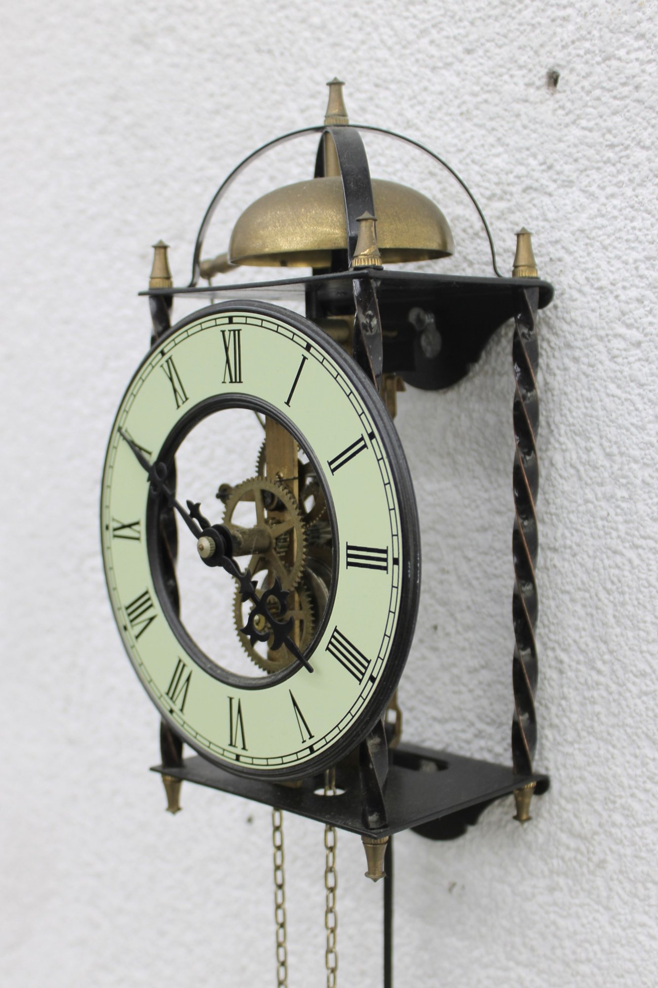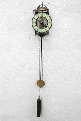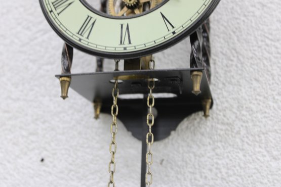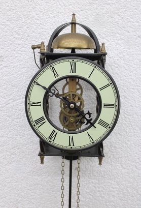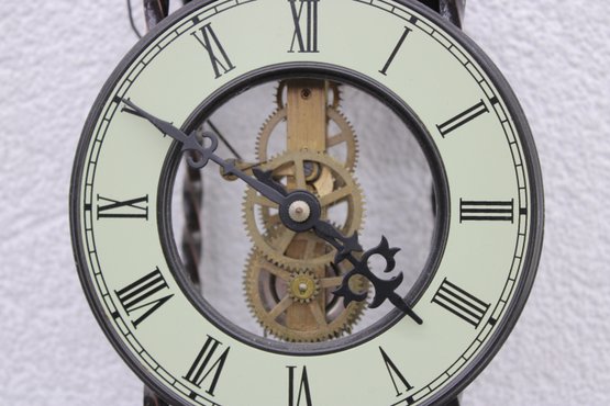 Unique skeleton-style wall clock featuring an exposed mechanical movement and classic Roman numeral dial. The open-frame design allows full view of the intricate gears in motion, topped with a decorative bell strike and supported by a metal frame with twisted side columns.