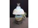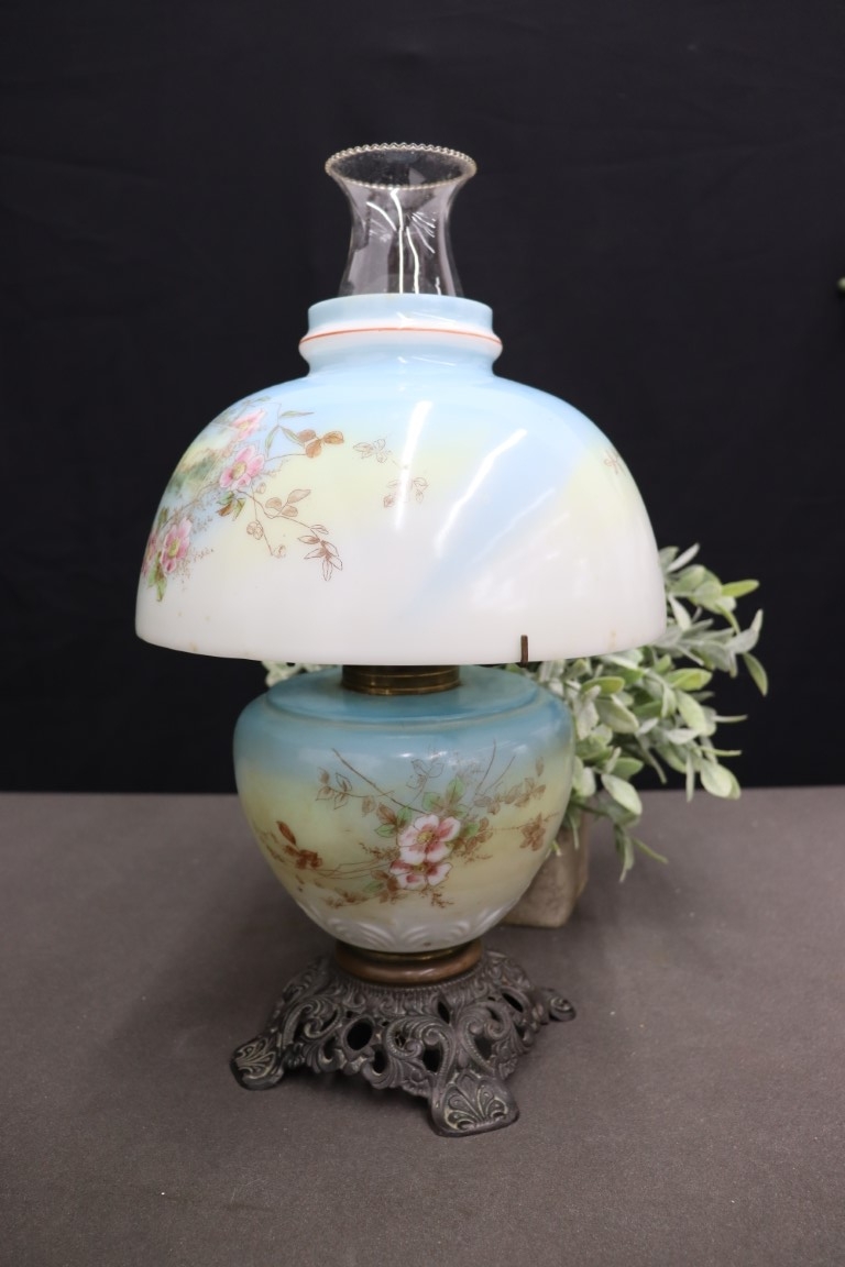 Sky Painted AC Converted Globe Oil Lamp On Ornate Pierced Cast Metal Base***needs To Be Rewired***
