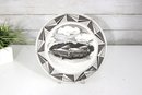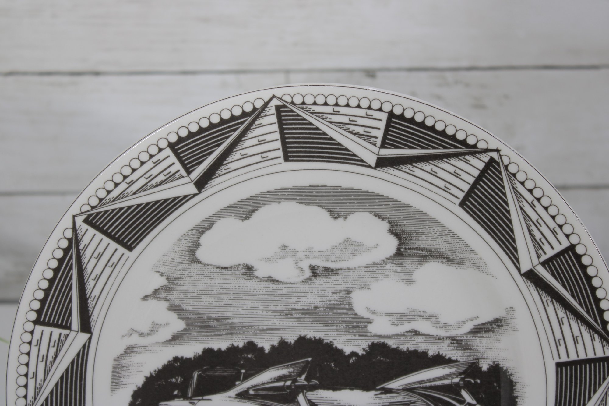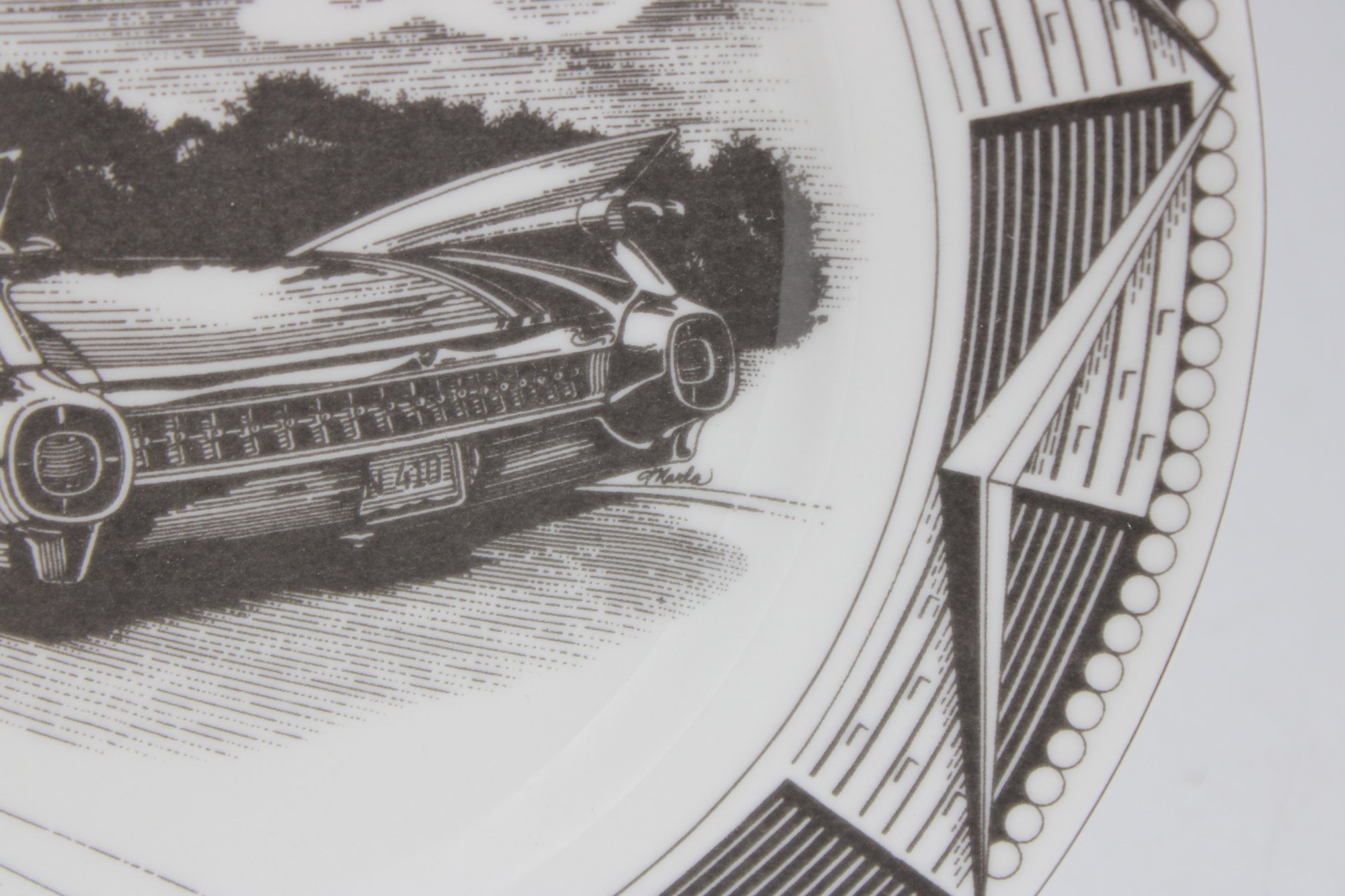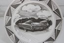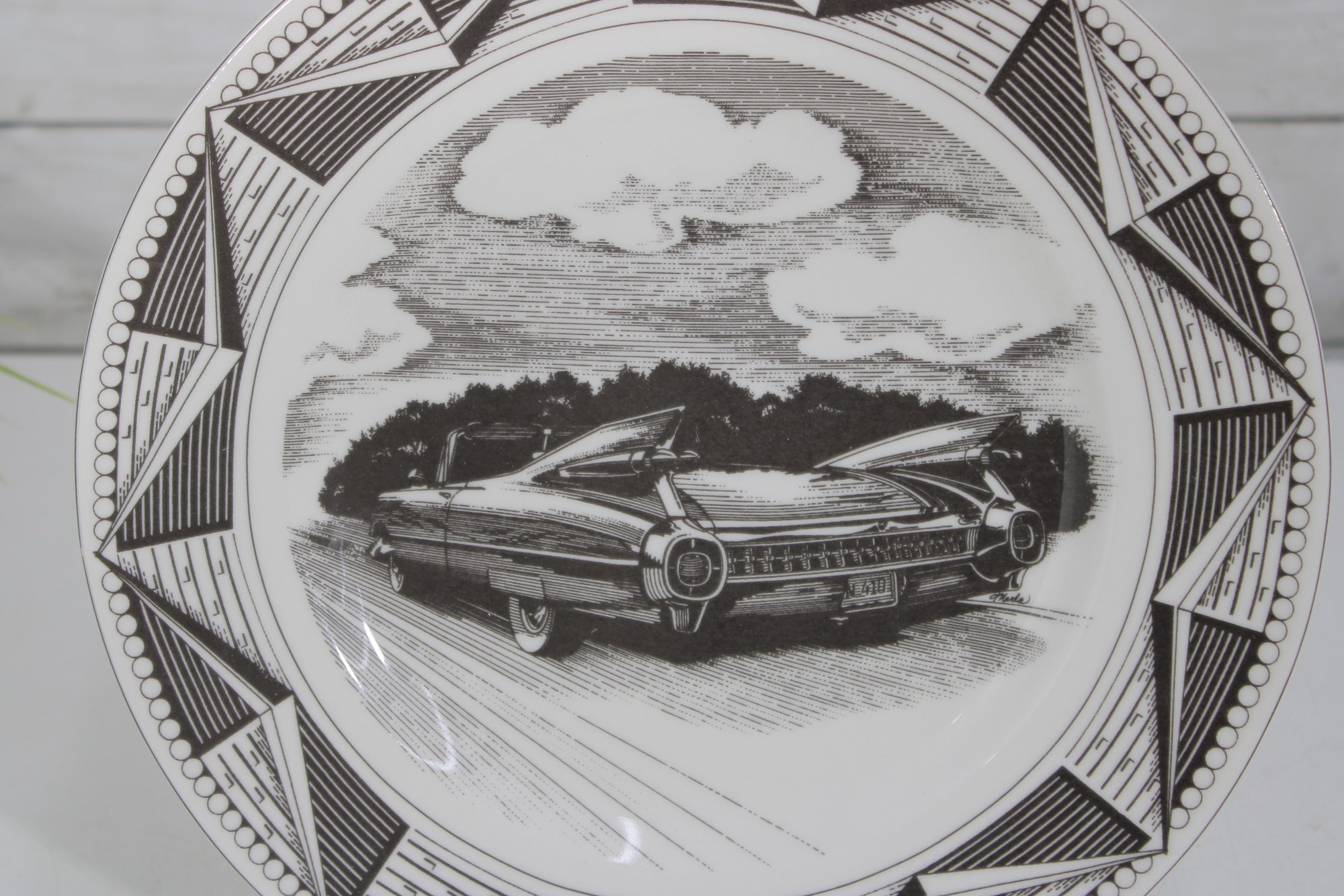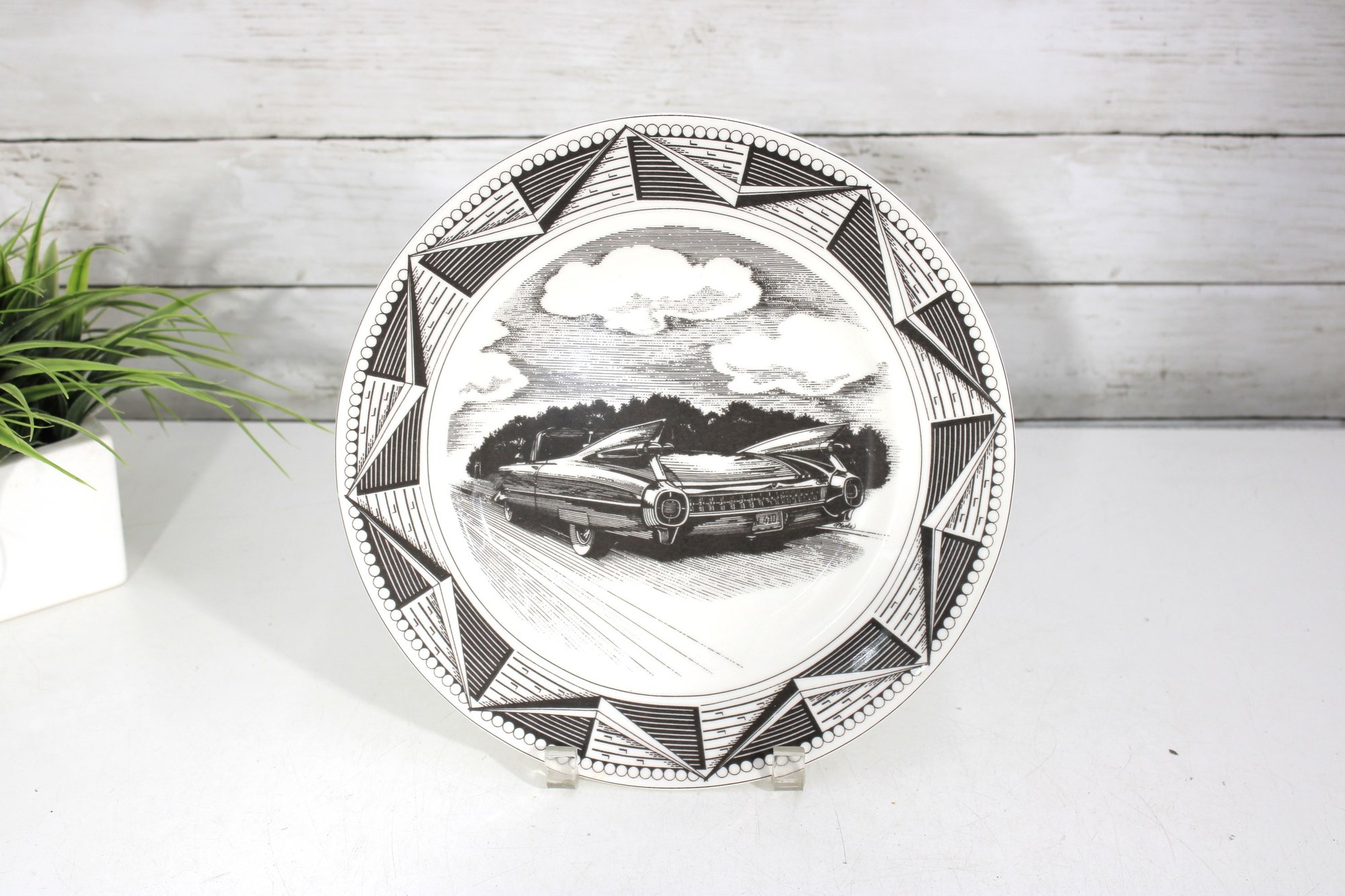 a striking decorative plate titled “Slice of Life”, featuring a detailed black-and-white illustration of a classic American automobile set against a scenic background. The bold geometric border design frames the central image beautifully, giving the piece a strong mid-century / graphic art aesthetic.